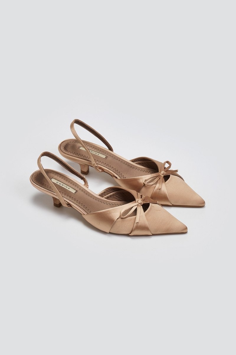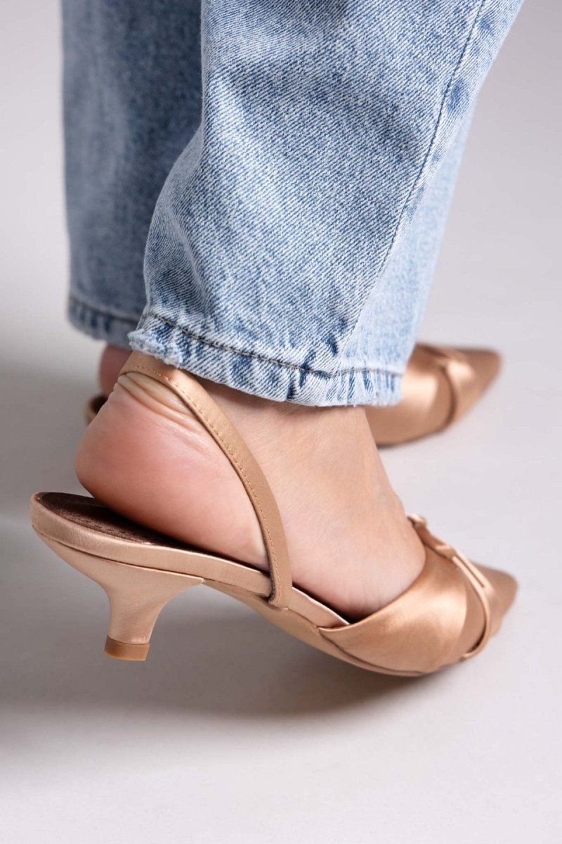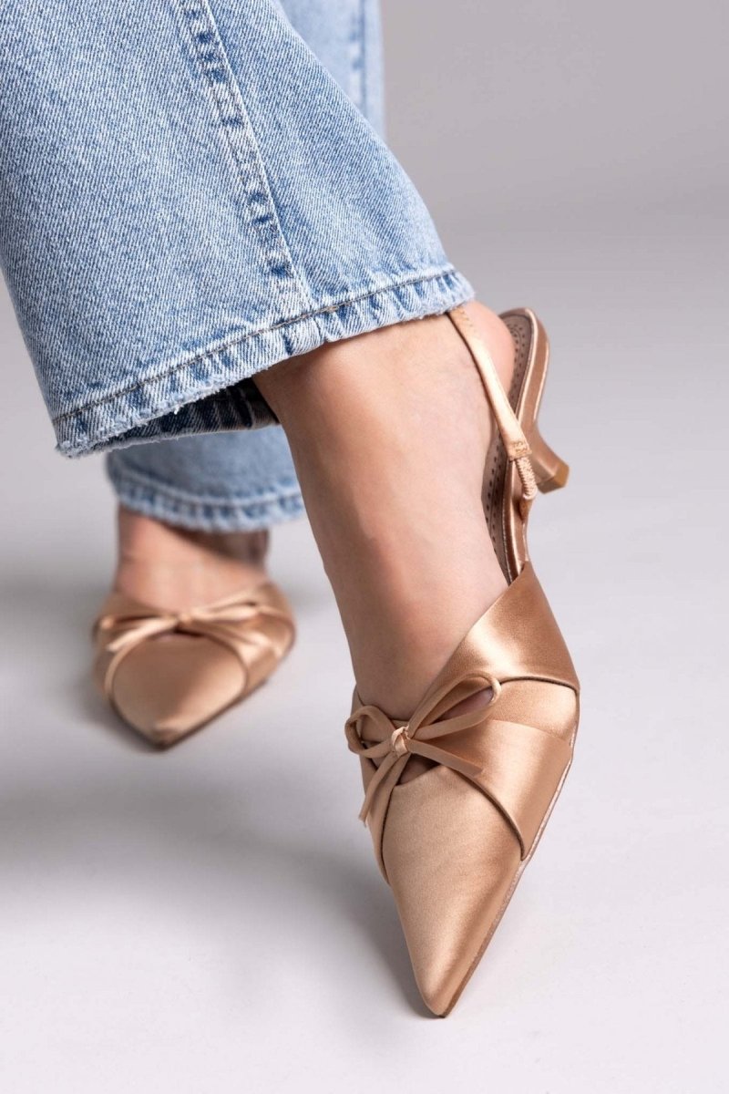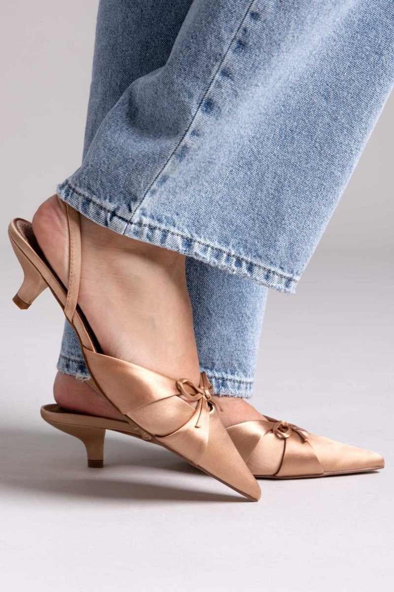 Slingback μυτερές σατέν γόβες CORINA. Σχέδιο με ανοίγματα και λεπτό φιόγκο. Χαμηλό λεπτό τακούνι. Λουράκι με λάστιχο στην εσωτερική του πλευρά για καλύτερη εφαρμογή.