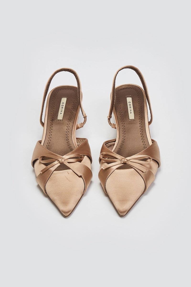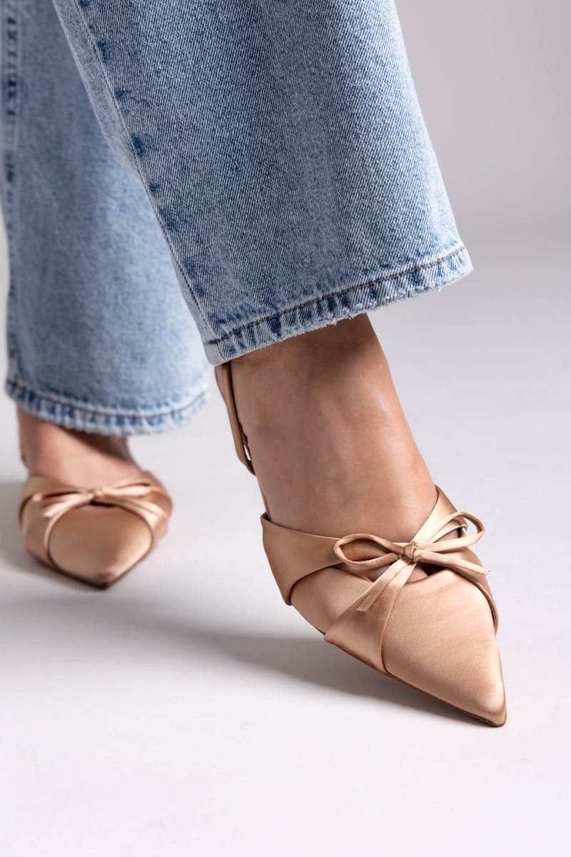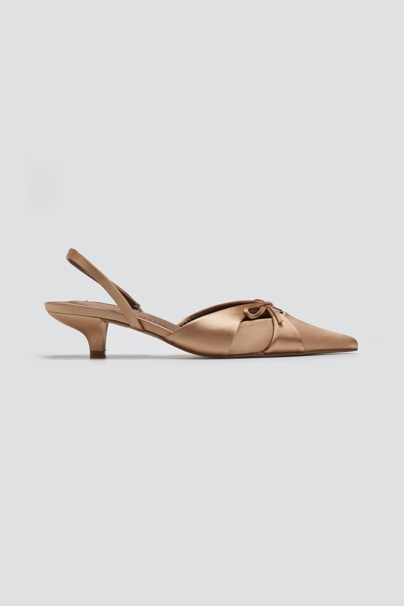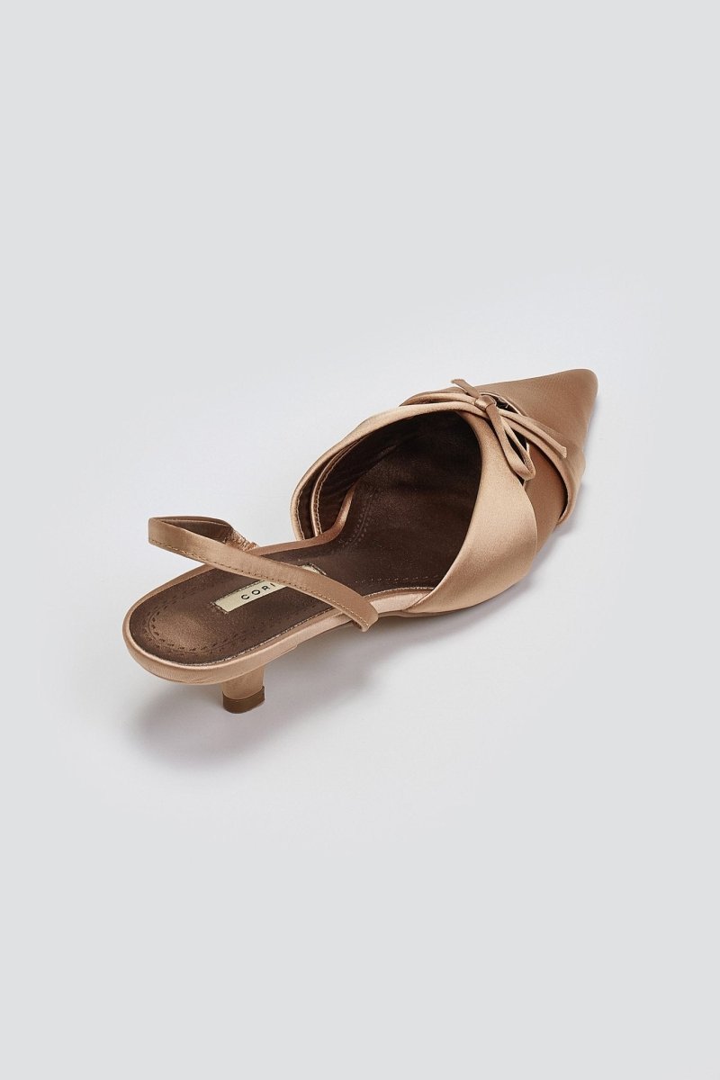 Slingback μυτερές σατέν γόβες CORINA. Σχέδιο με ανοίγματα και λεπτό φιόγκο. Χαμηλό λεπτό τακούνι. Λουράκι με λάστιχο στην εσωτερική του πλευρά για καλύτερη εφαρμογή.