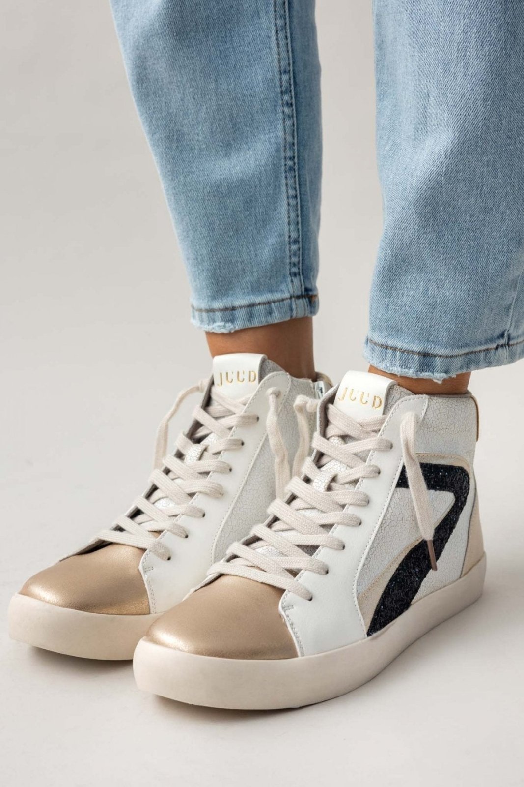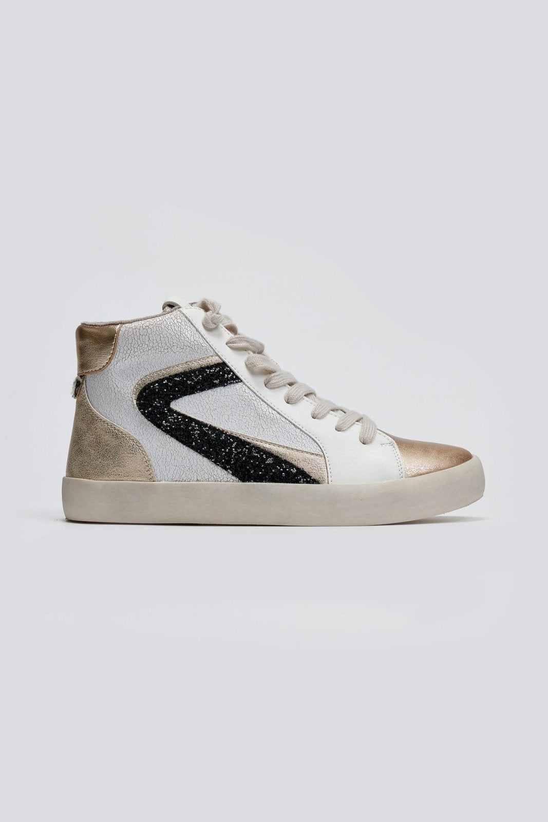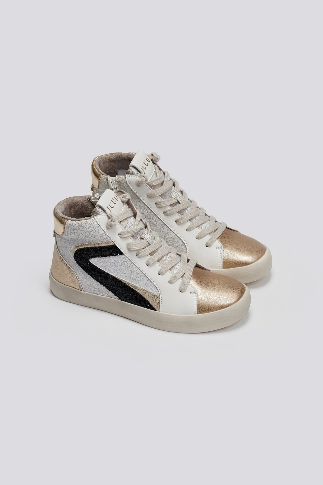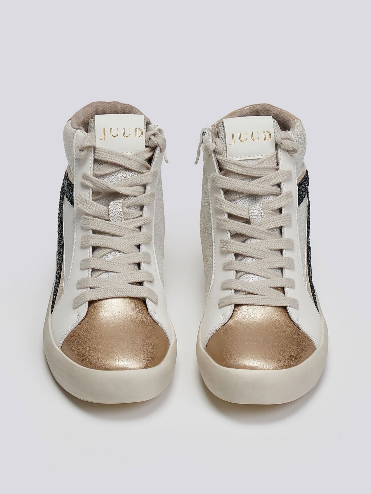 Sneakers μποτάκια με γκλίτερ στο πλάι ERYNN. Συνδυασμός υλικών. Μεταλλική λεπτομέρεια μπροστά και πίσω.