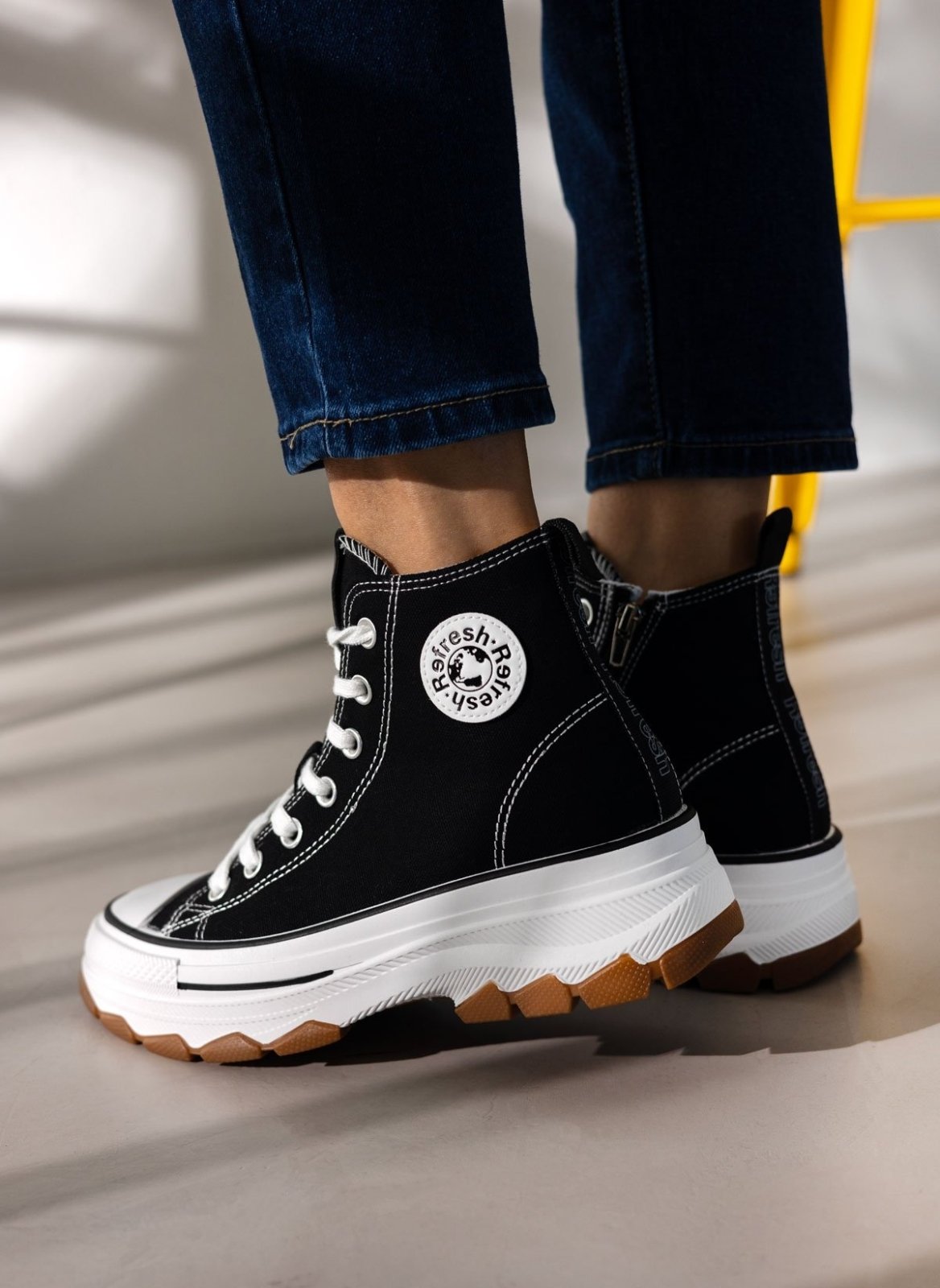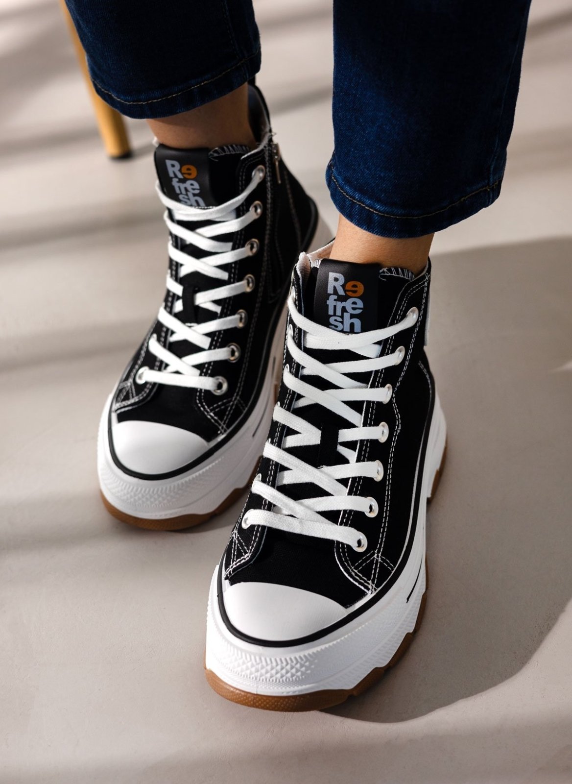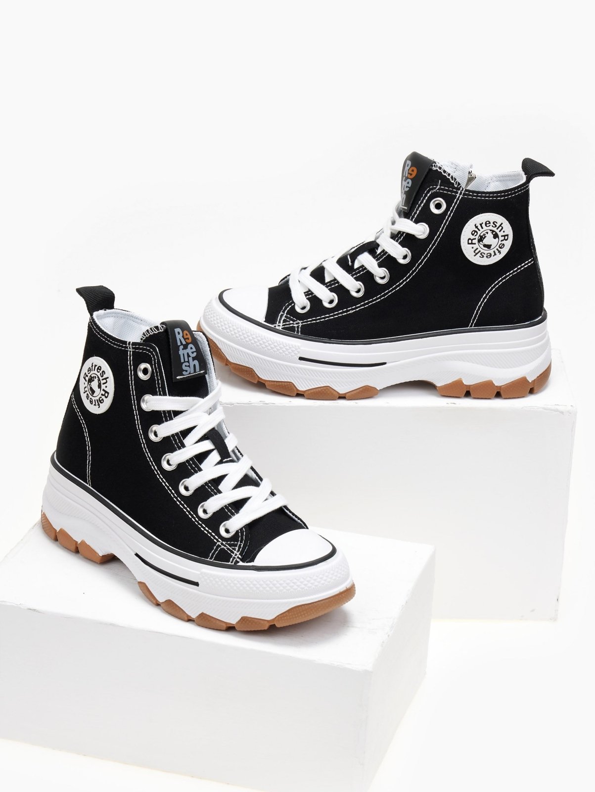 Sneakers πάνινα μποτάκια Refresh. Ψηλή σόλα με σχέδιο. Κλείνουν με φερμουάρ στην εσωτερική τους πλευρά. Comfort μαλακός suede πάτος με τεχνολογία Biotech Memory Foam pro. Peta Vegan Approved.