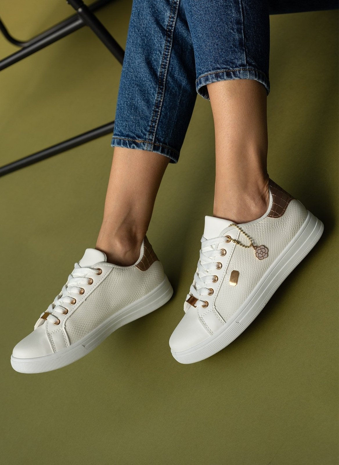 Sneakers από υψηλής ποιότητας τεχνόδερμα, με διακοσμητικές λεπτομέρειες που προσθέτουν στυλ και κομψότητα. Το επάνω μέρος διαθέτει ιδιαίτερο pattern και charm που κρέμεται από τα κορδόνια, προσδίδοντας μοναδικότητα στο σχέδιο. Η σόλα είναι κατασκευασμένη από ανθεκτικό υλικό που προσφέρει άνεση και σταθερότητα σε κάθε βήμα. Ιδανικά για καθημερινή χρήση με μια πινελιά λάμψης και στυλ.