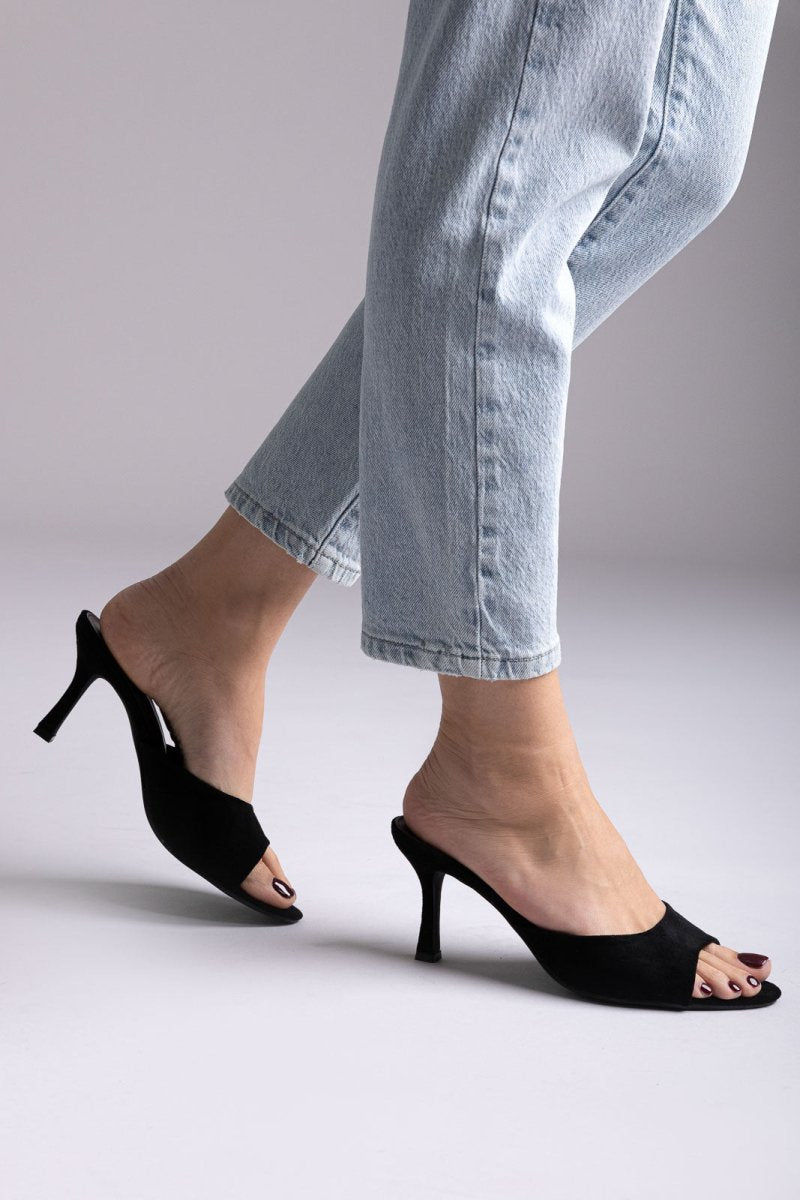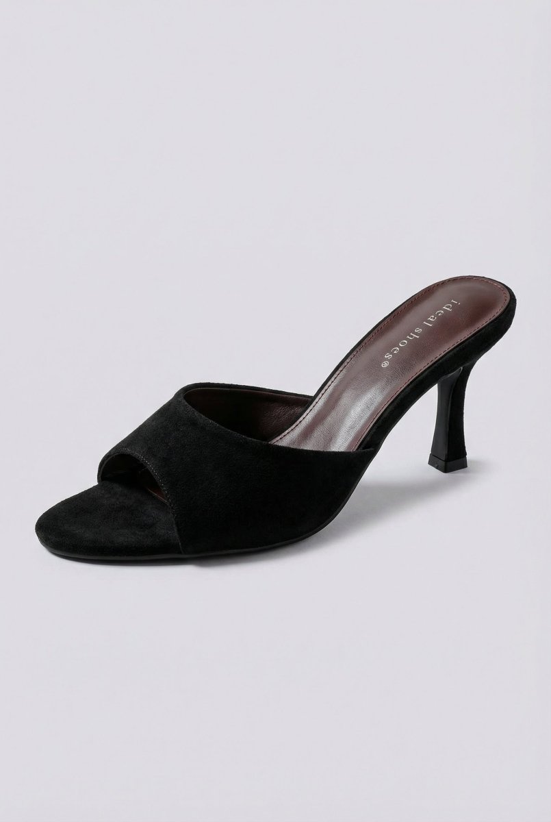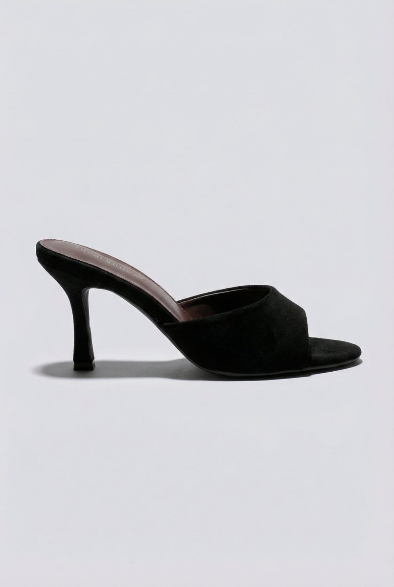Suede mules with a wide toe band and slim stiletto heel for elegant lift. Sleek slip-on silhouette with refined comfort. Crafted for modern women, day to night.