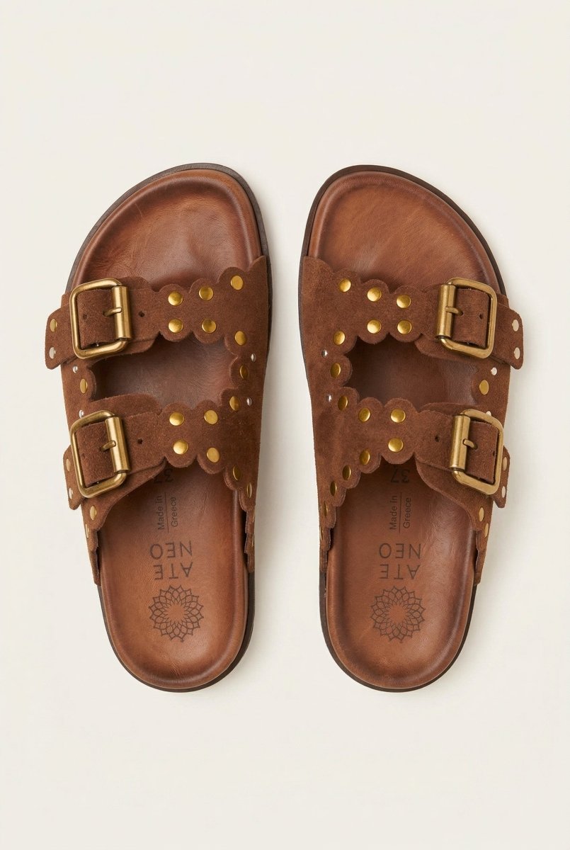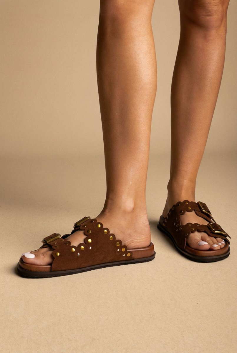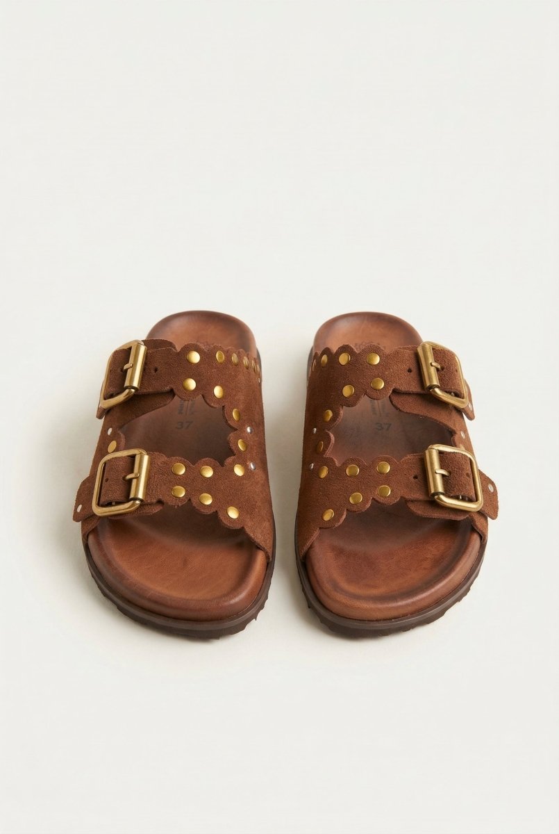 Studded Buckle Sandals - Brown Suede
