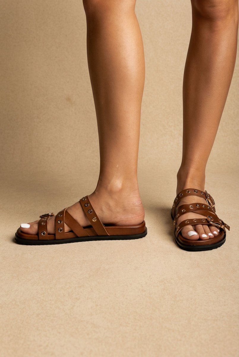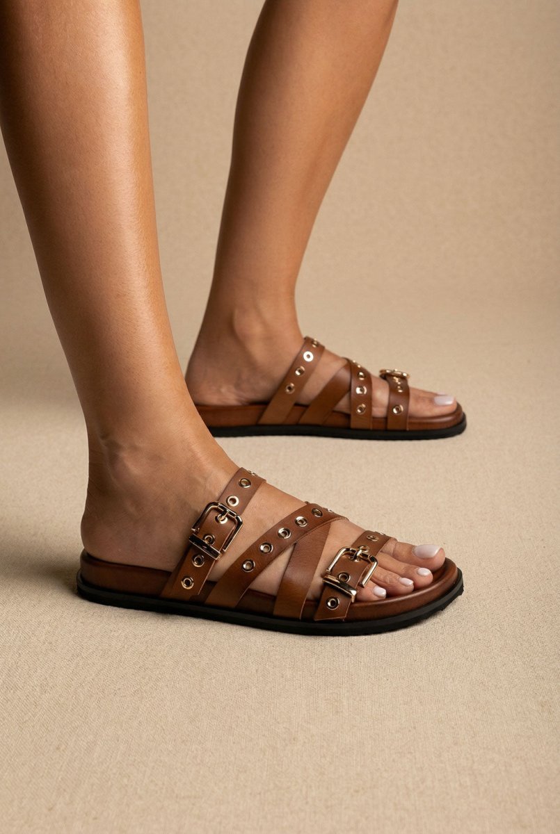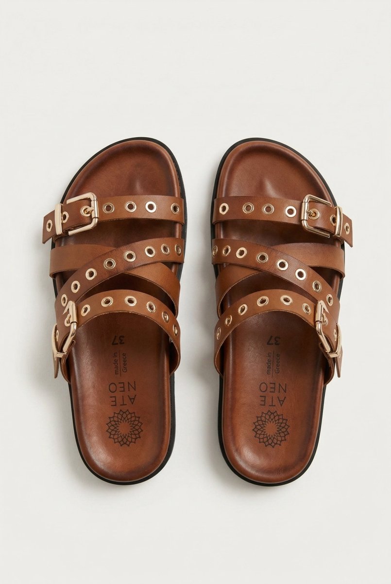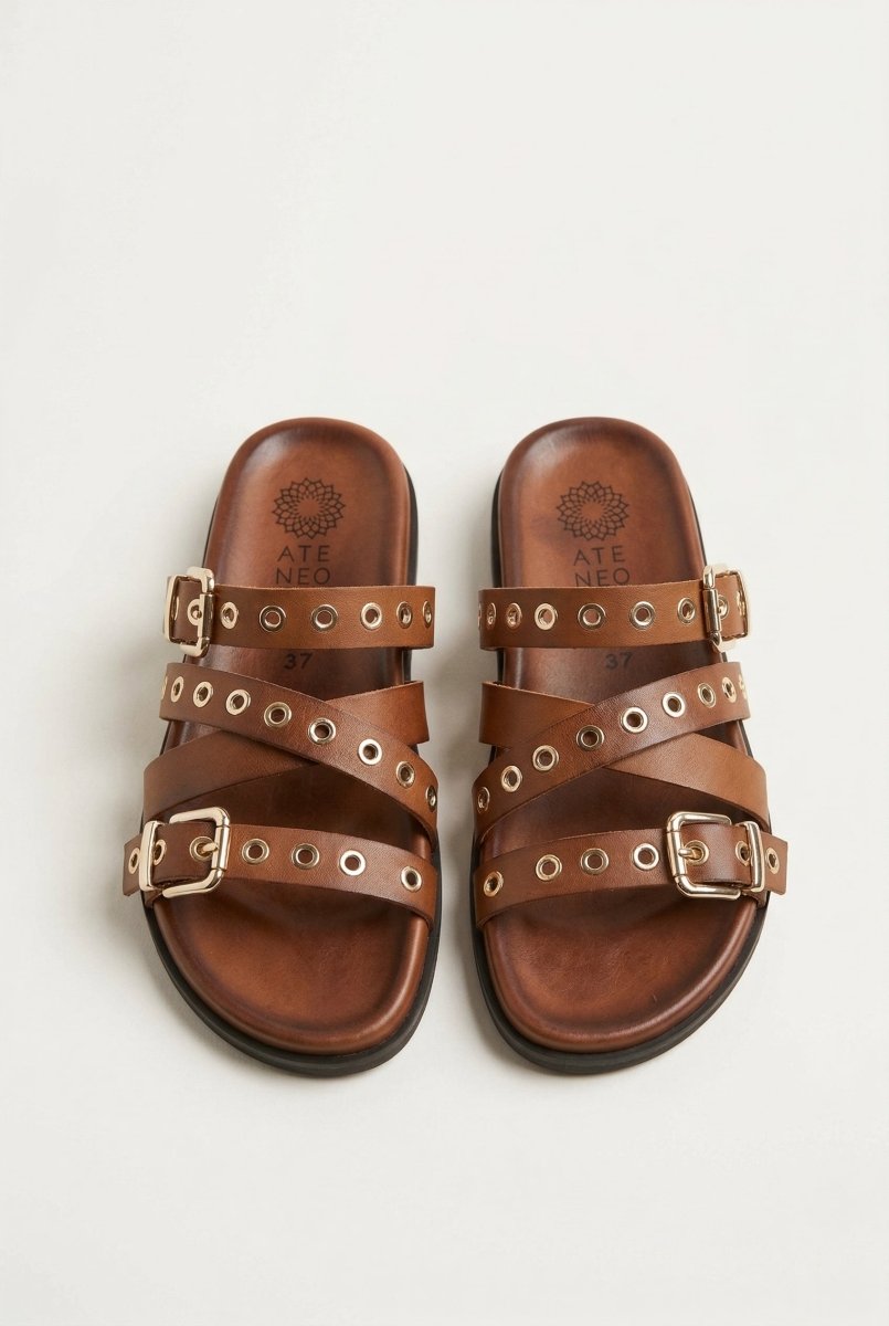 The ATENEO Studded Buckle Sandals in Tan Matte combine contemporary style with functional design. Crafted from genuine leather, these sandals feature distinctive metal stud accents and secure buckle straps positioned at the toes and instep. Perfect for bold summer styling, these versatile sandals deliver both aesthetic appeal and reliable everyday wearability.