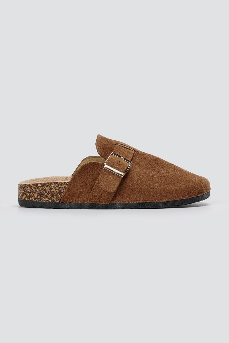 Suede clogs with a side metallic buckle and an anatomical suede footbed. Supportive fit and effortless style. Refined everyday comfort crafted for modern women.