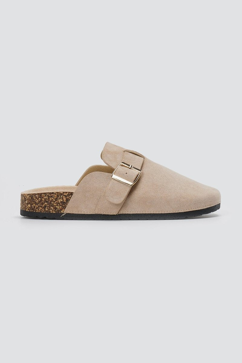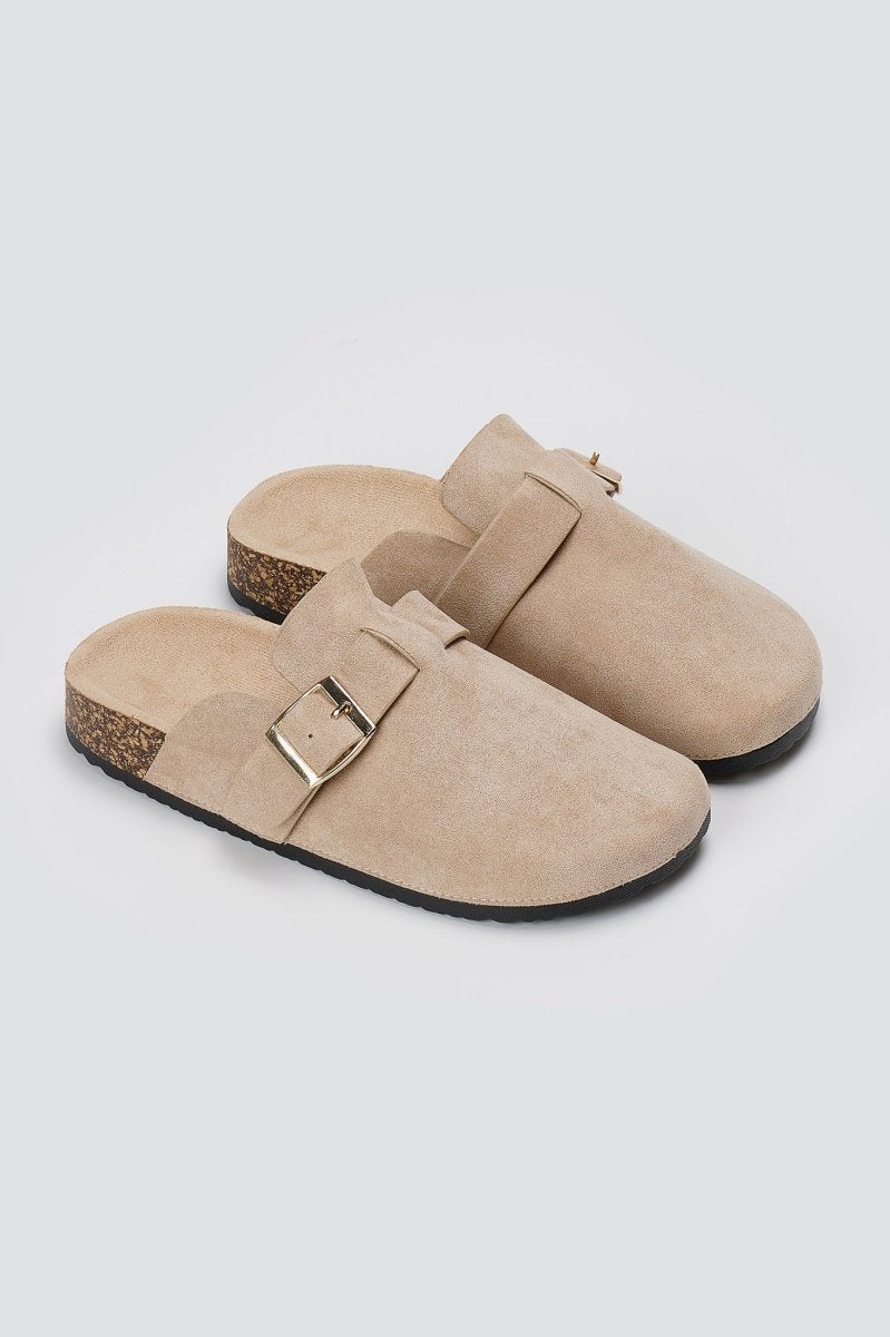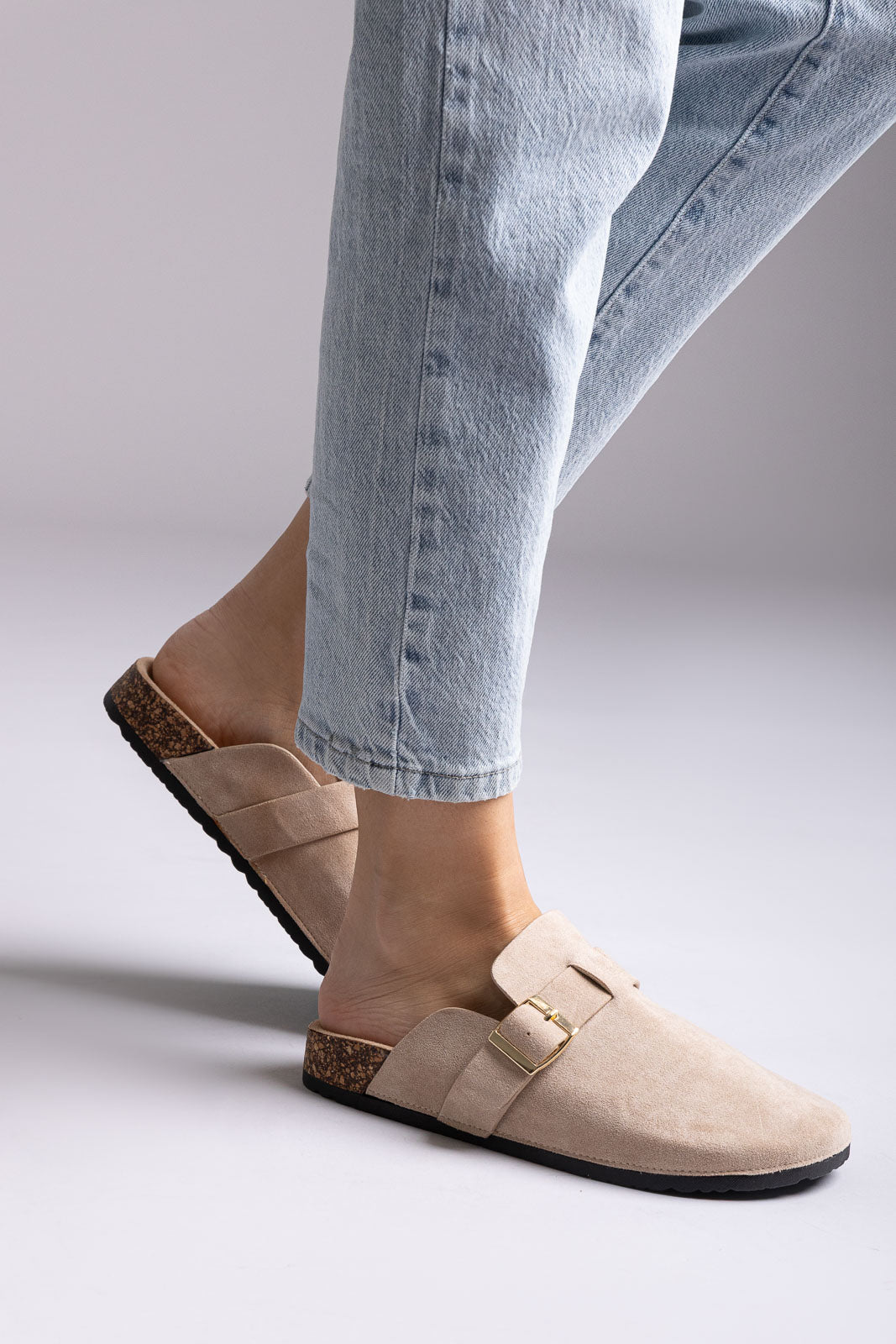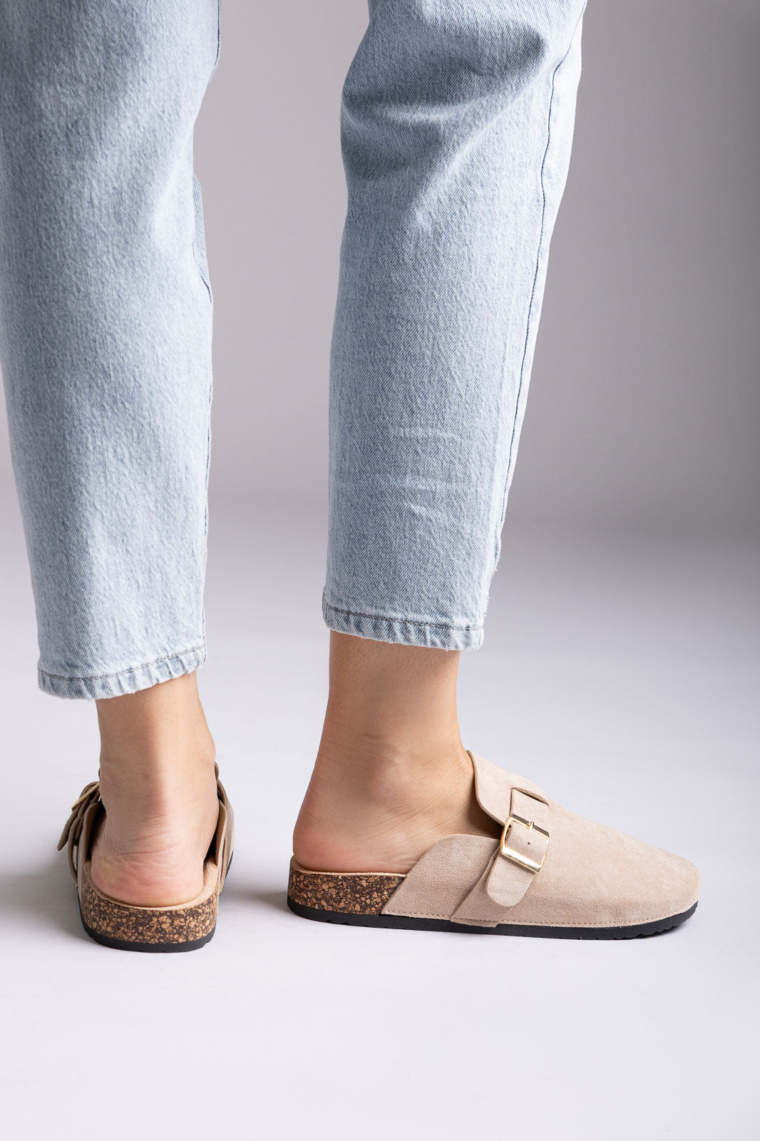 Suede clogs with a side metallic buckle and an anatomical suede footbed. Supportive fit and effortless style. Refined everyday comfort crafted for modern women.