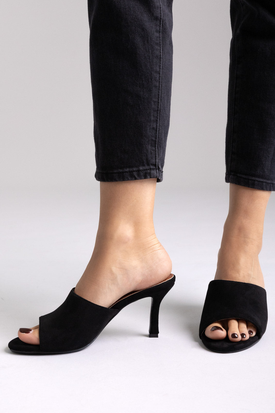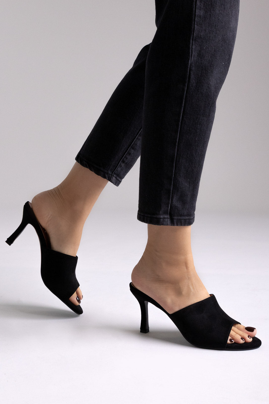 Elegant suede mules with high stiletto heel and wide front strap. A sleek, feminine silhouette offering refined style and comfort for modern women.