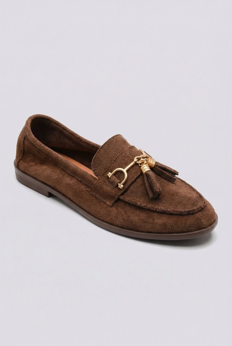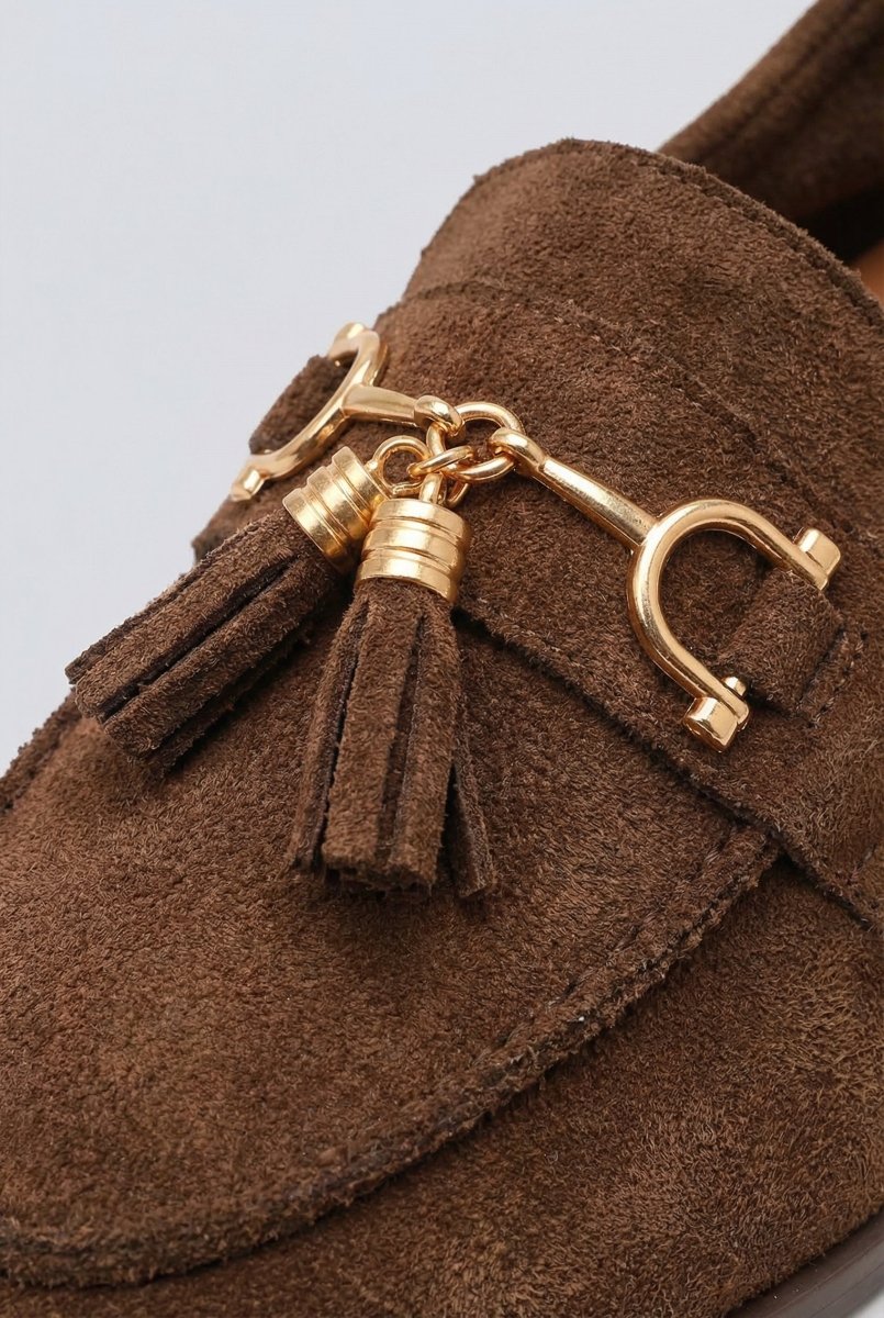 Tassel Loafers with Metal Detail - Brown Suede