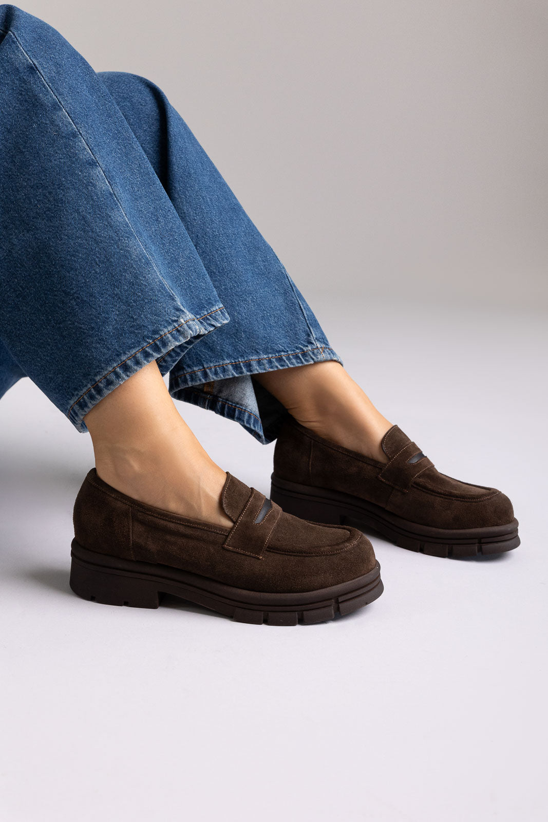 Refined suede leather chunky loafers by TFP with a sturdy lug sole and neat external stitching. Cushioned footbed, versatile women’s loafers crafted for modern style.
