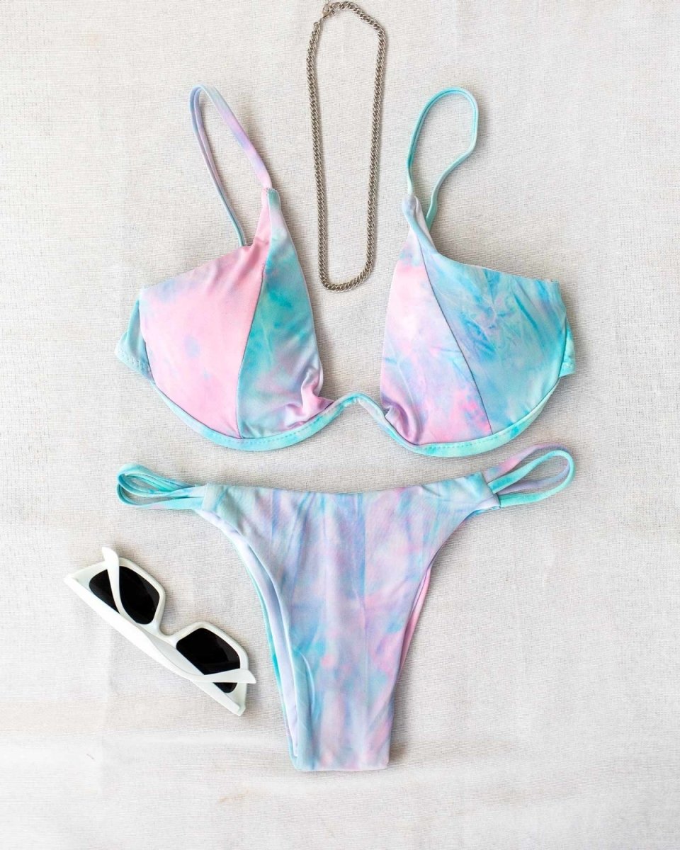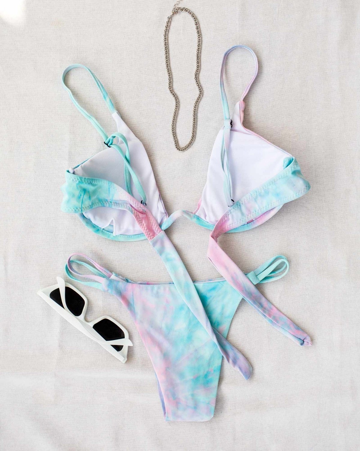 Σετ tie dye bikini.Το τοπ έχει μπανέλα και αποσπώμενη ενίσχυση.Το σλιπ είναι ψηλόμεσο με λεπτό κορδόνι στο πλάι.Μέτρια κάλυψη.