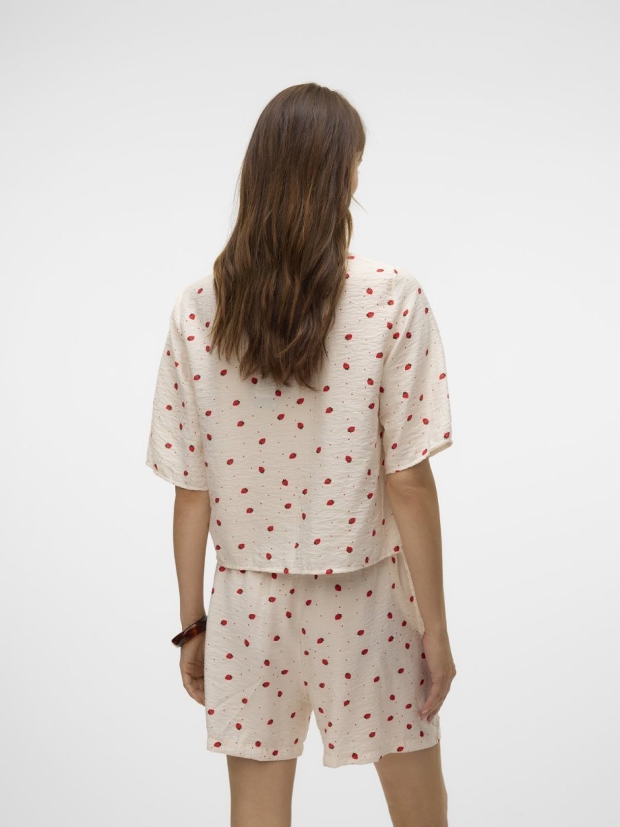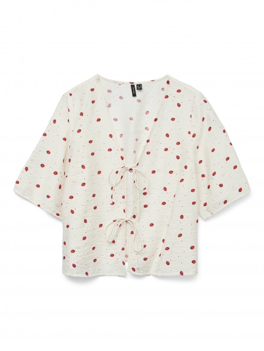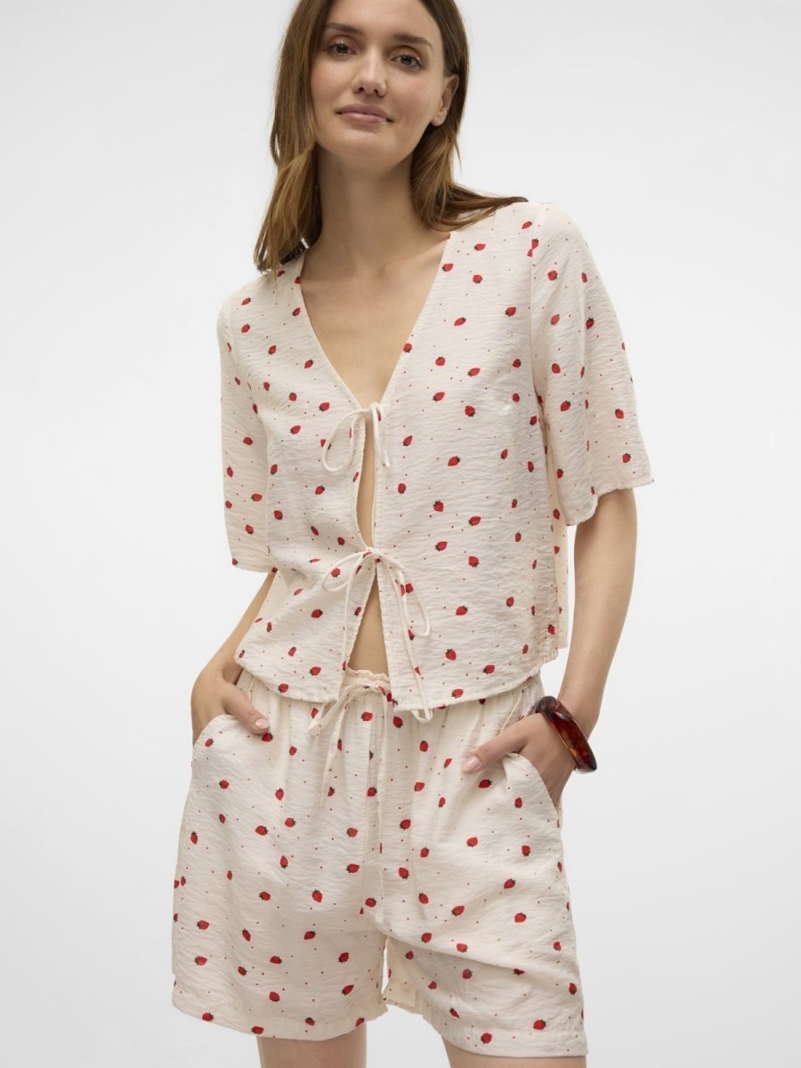 Τοπ με print φράουλες Vero Moda. Δέσιμο με κορδόνια στη μπροστινή πλευρά. V cut άνοιγμα στο μπούστο.