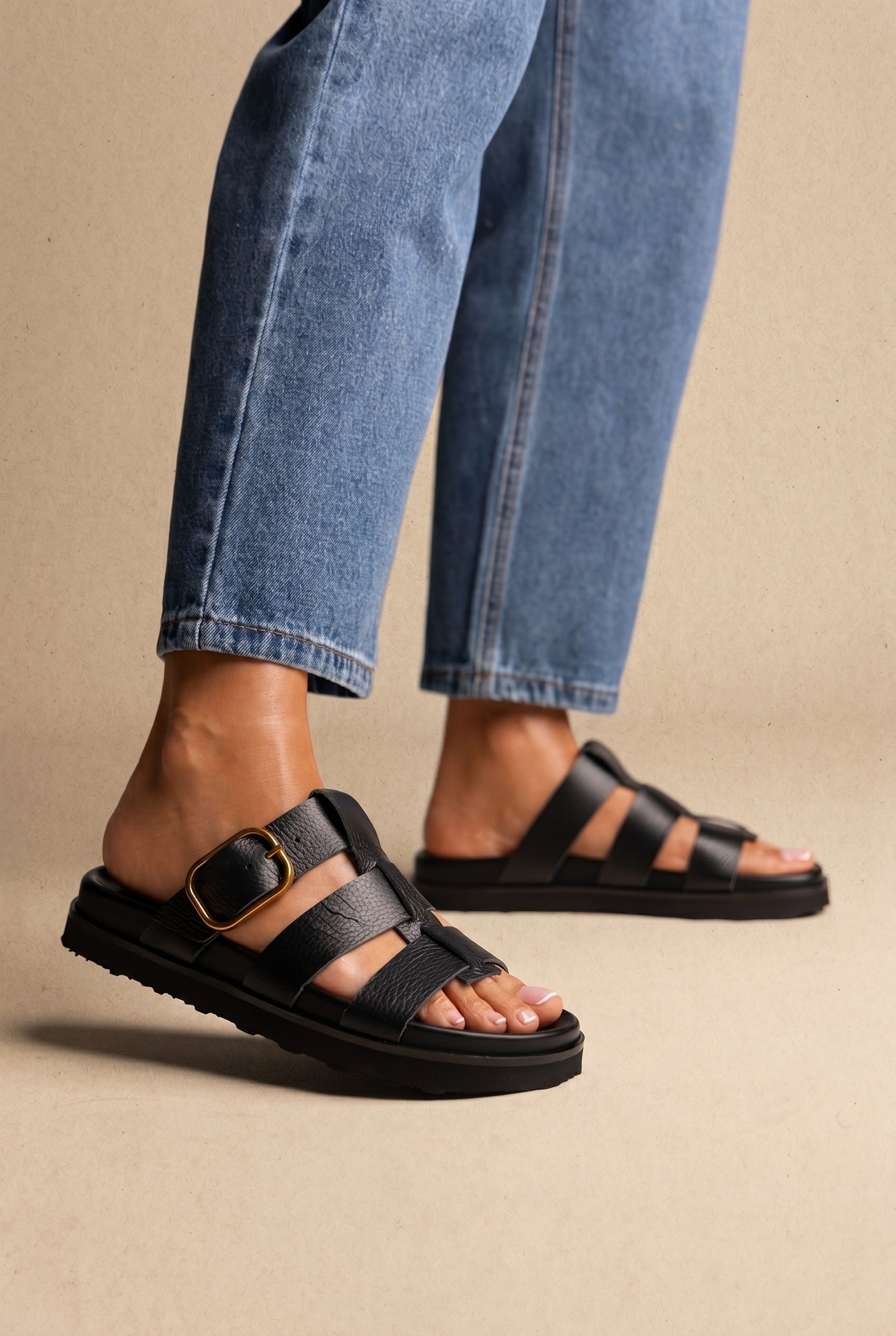 Triple Strap Sandals Buckle Detail - Black Matte
