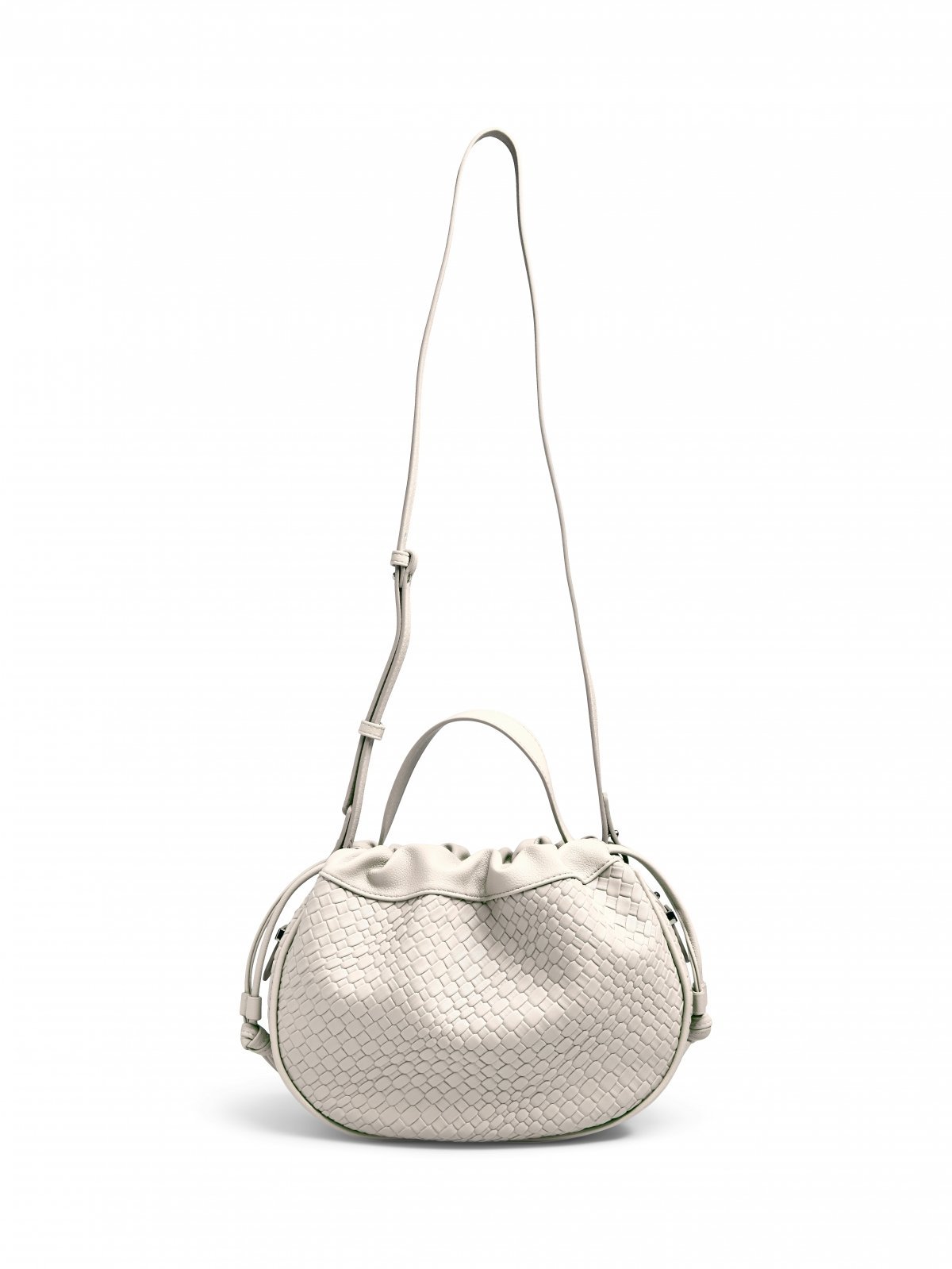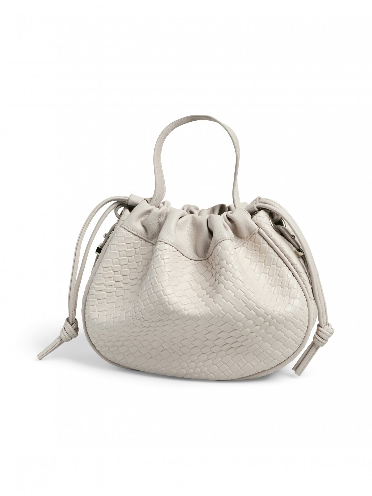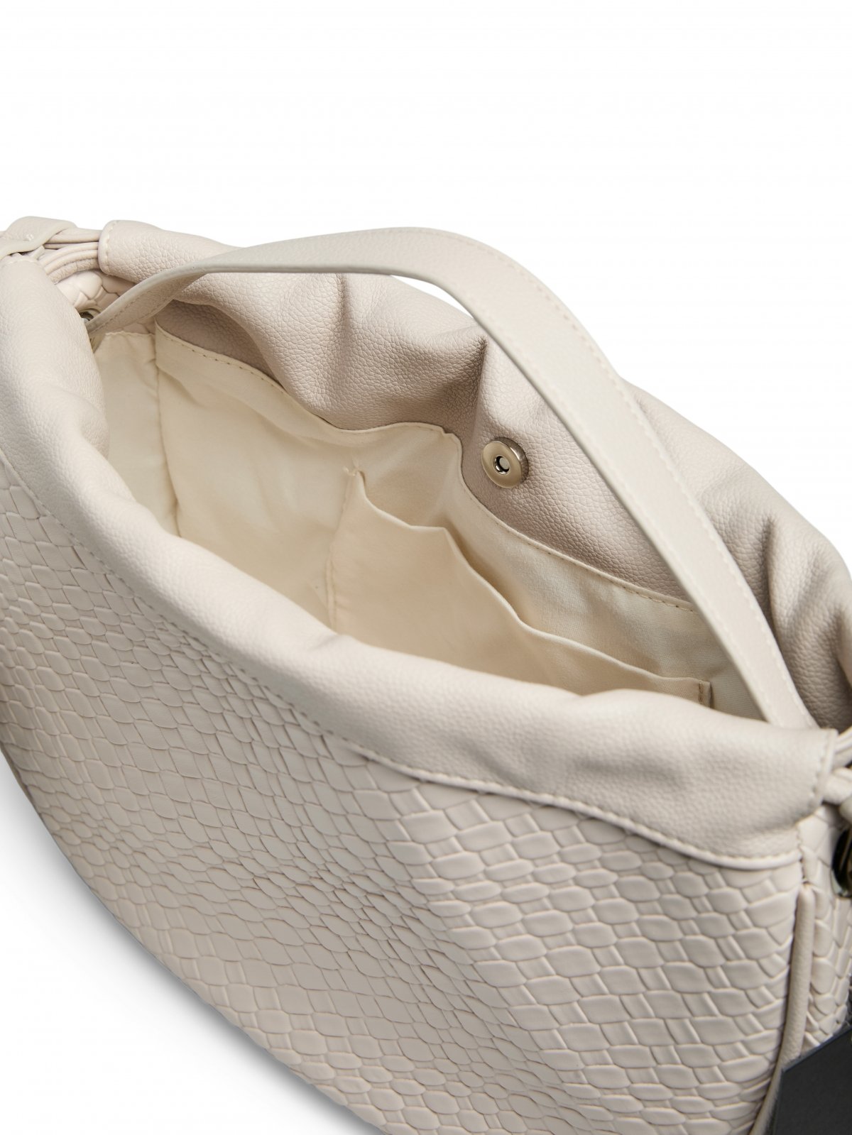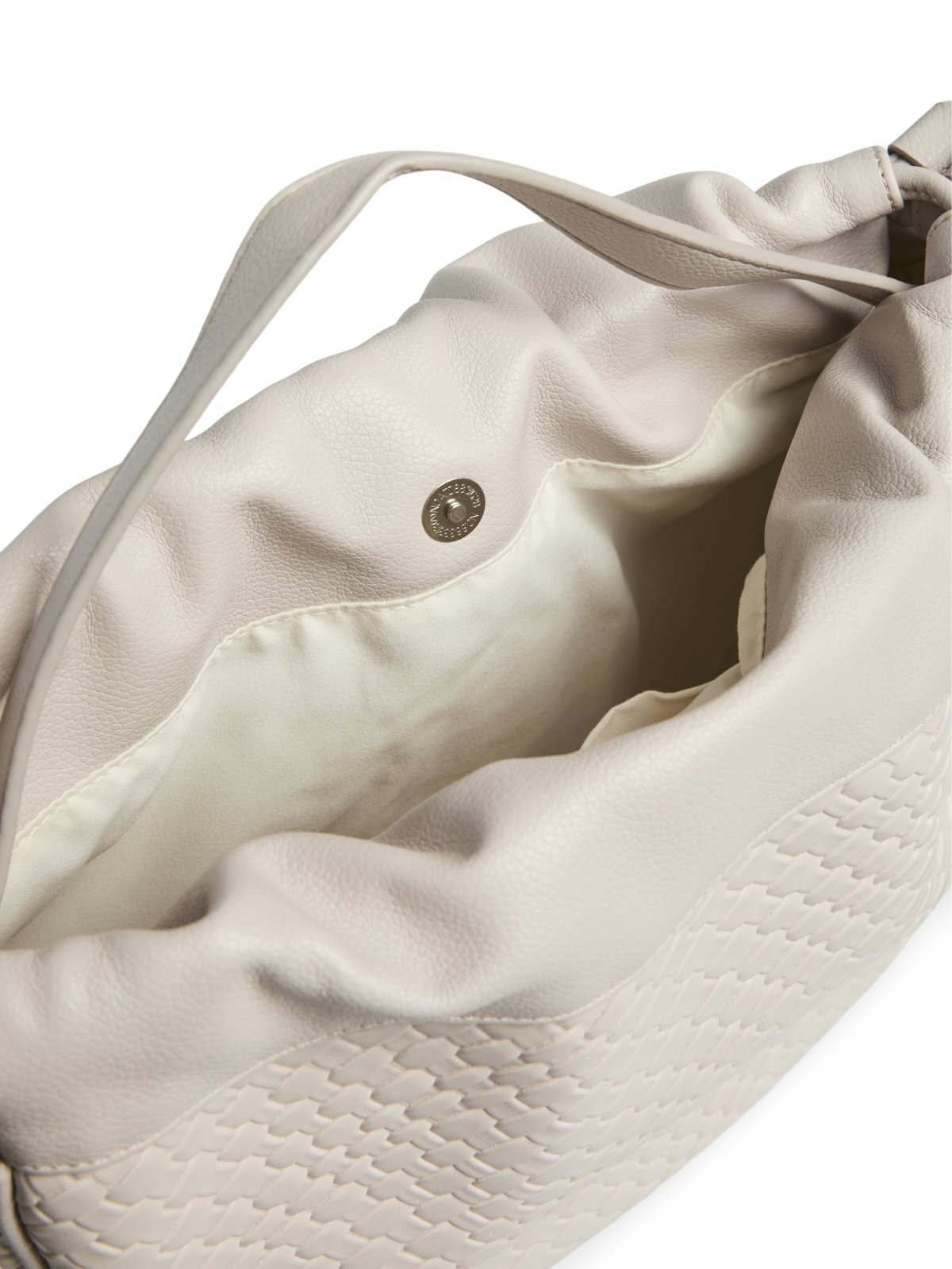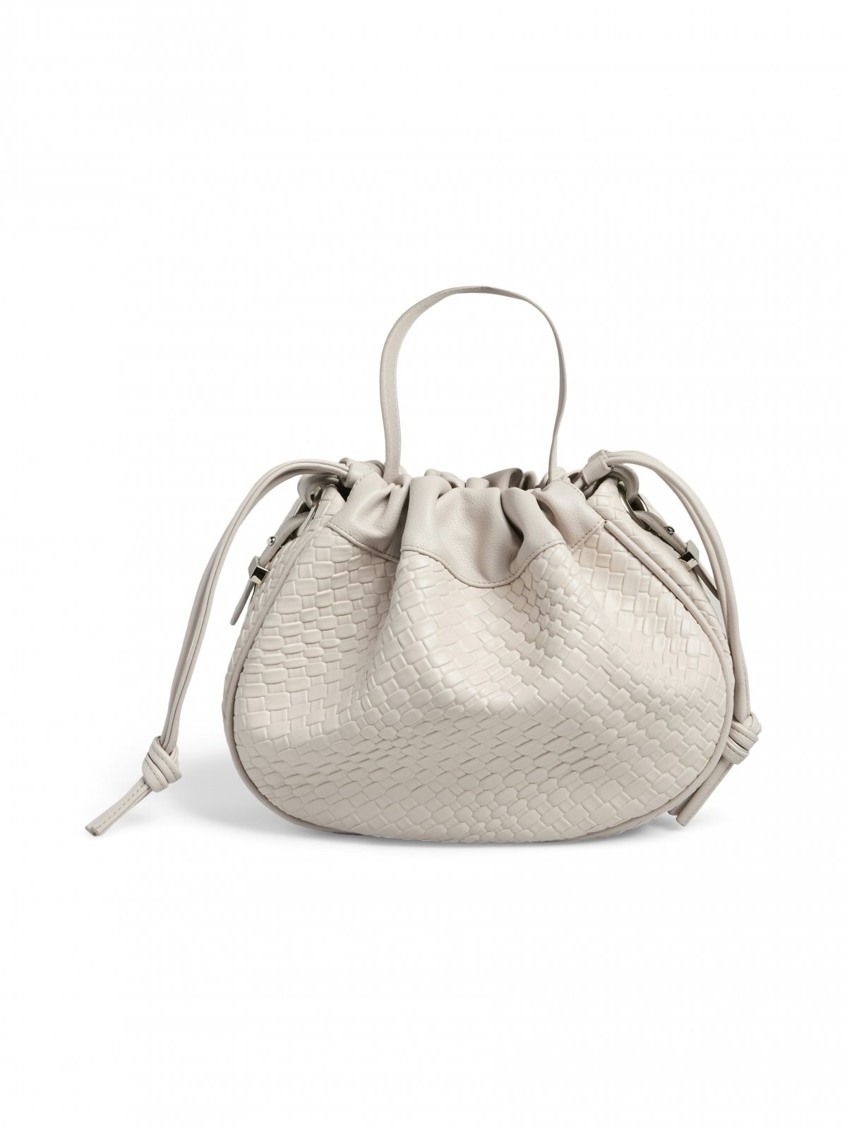Τσάντα balloon με ανάγλυφο pattern PIECES. Ενιαίος χώρος αποθήκευσης με μικρές θήκες. Υφασμάτινη επένδυση. Σφίγγει με κορδόνια στο επάνω μέρος. Κλείνει με κλιπ κουμπί. Περιλαμβάνεται επιπλέον λουράκι για να κρατηθεί χιαστί.