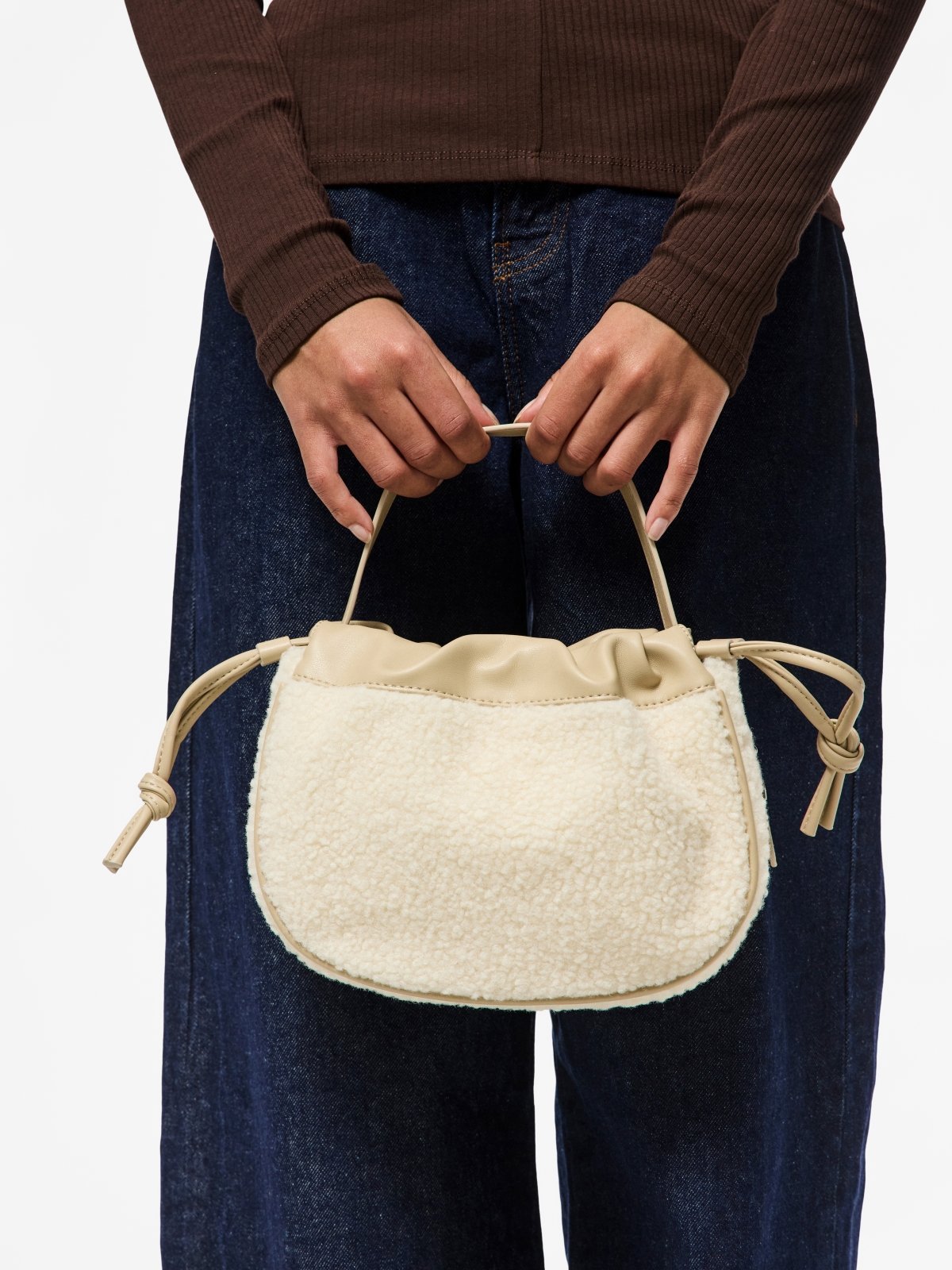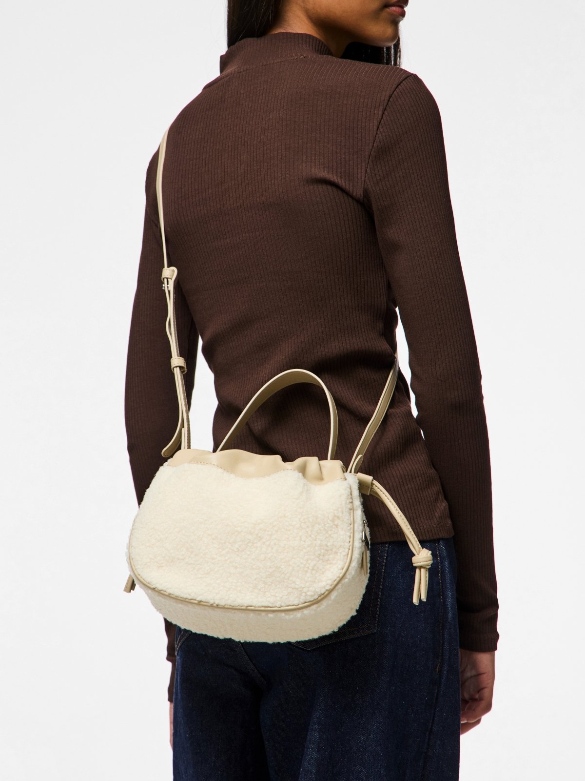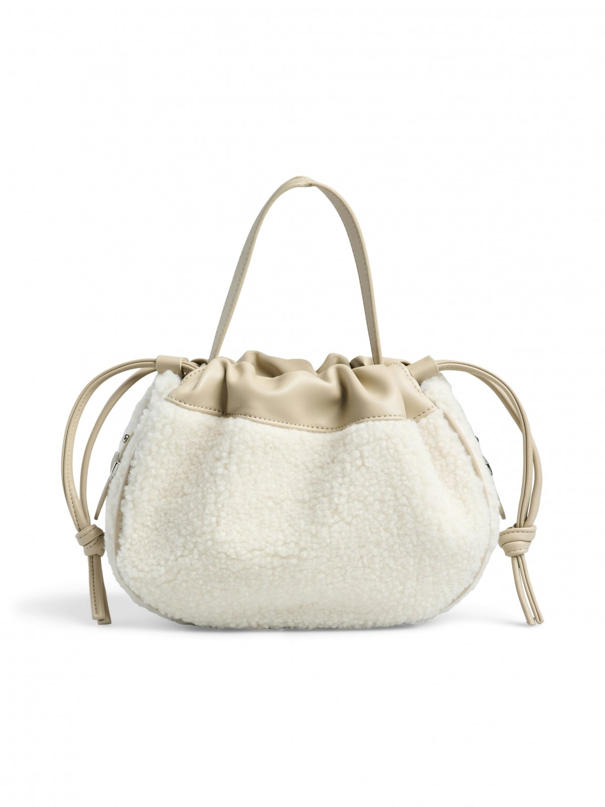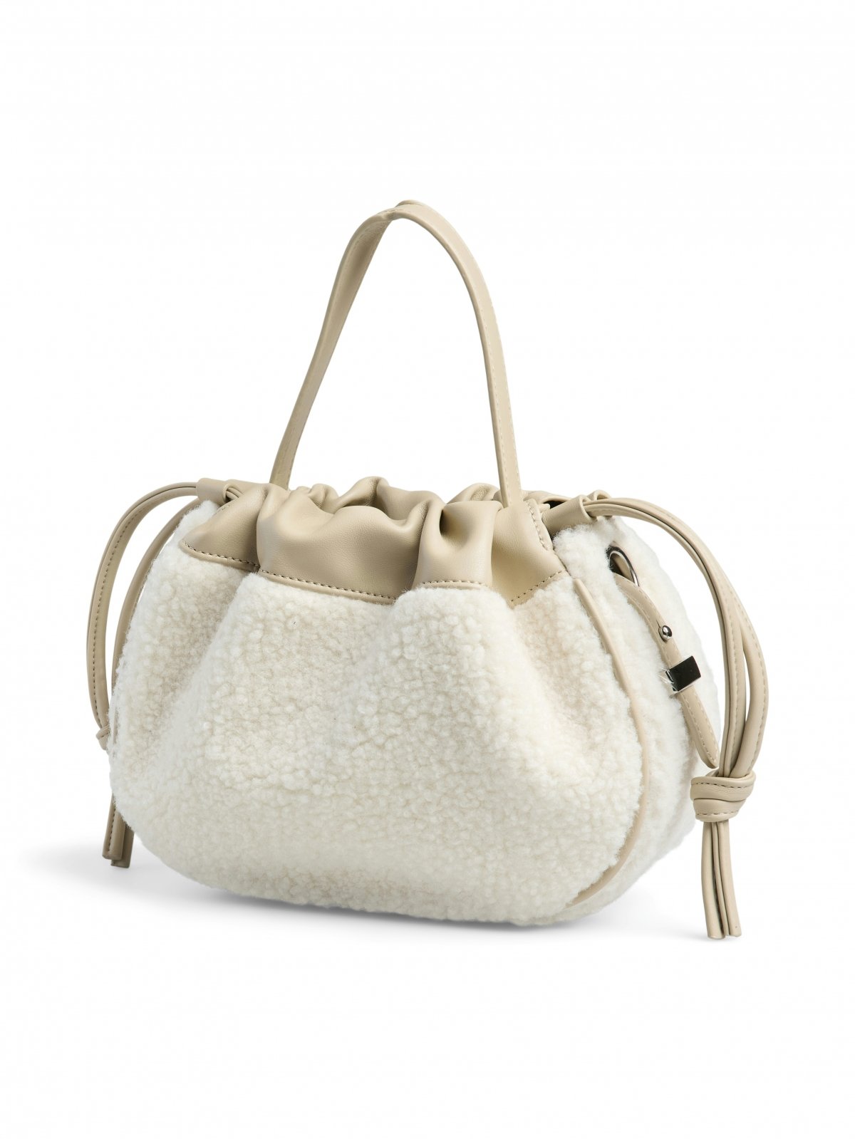 Τσάντα ballon από μαλακό teddy ύφασμα PIECES. Ενιαίος χώρος αποθήκευσης με μικρή pocket θήκη. Σφίγγει με κορδόνια στο επάνω μέρος. Κλείνει με κλιπ κουμπί. Περιλαμβάνεται επιπλέον λουράκι για να κρατηθεί και χιαστί.