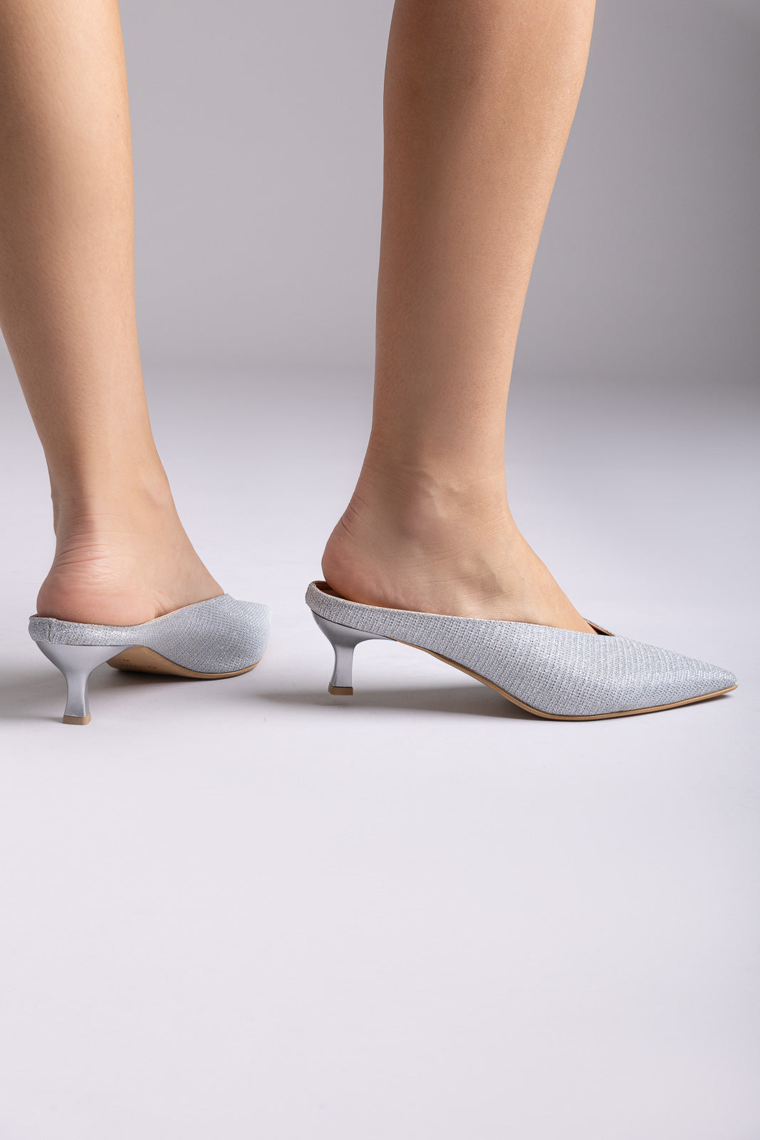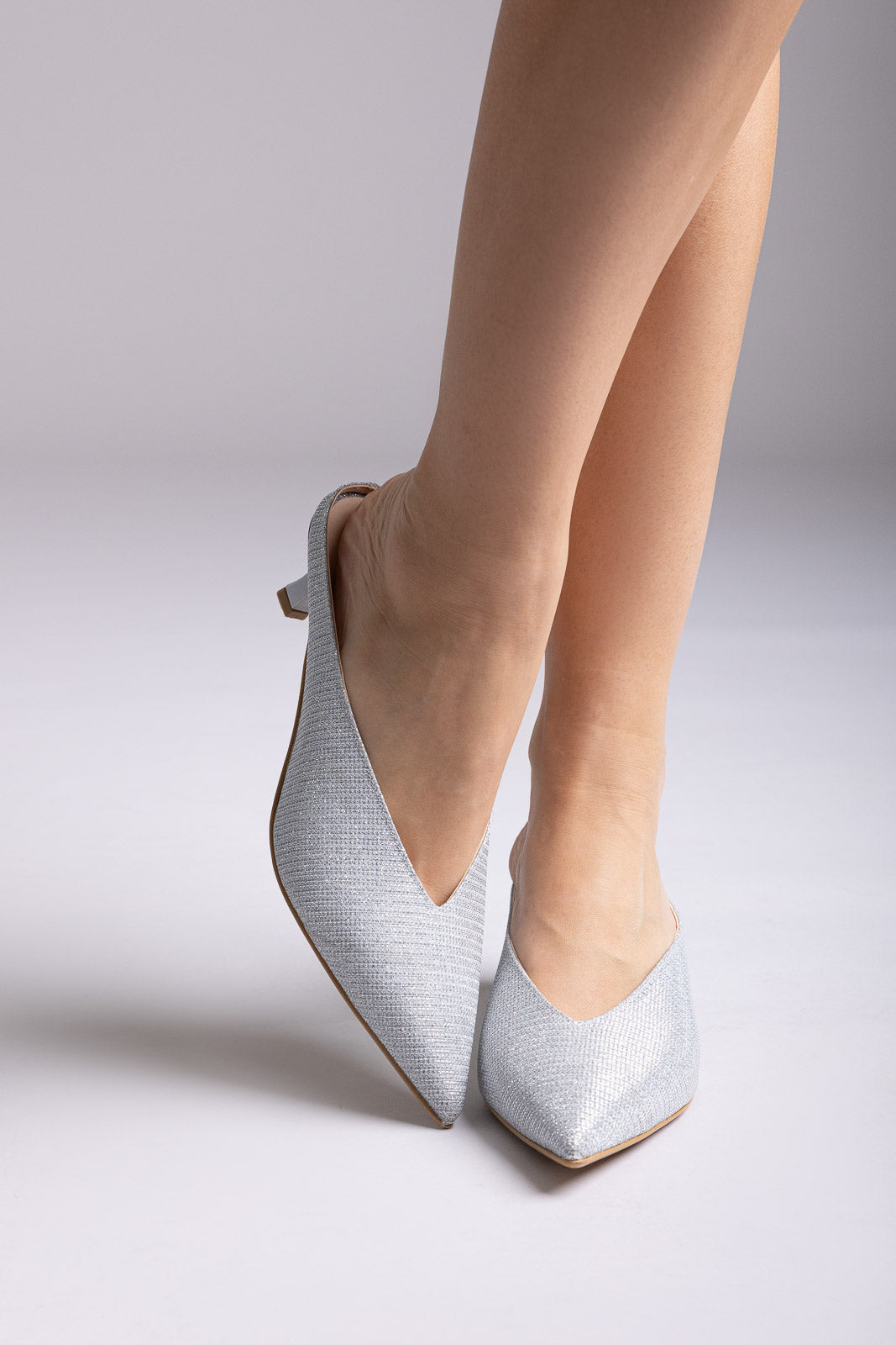 V Cut Kitten Heel Mules - Silver Lurex