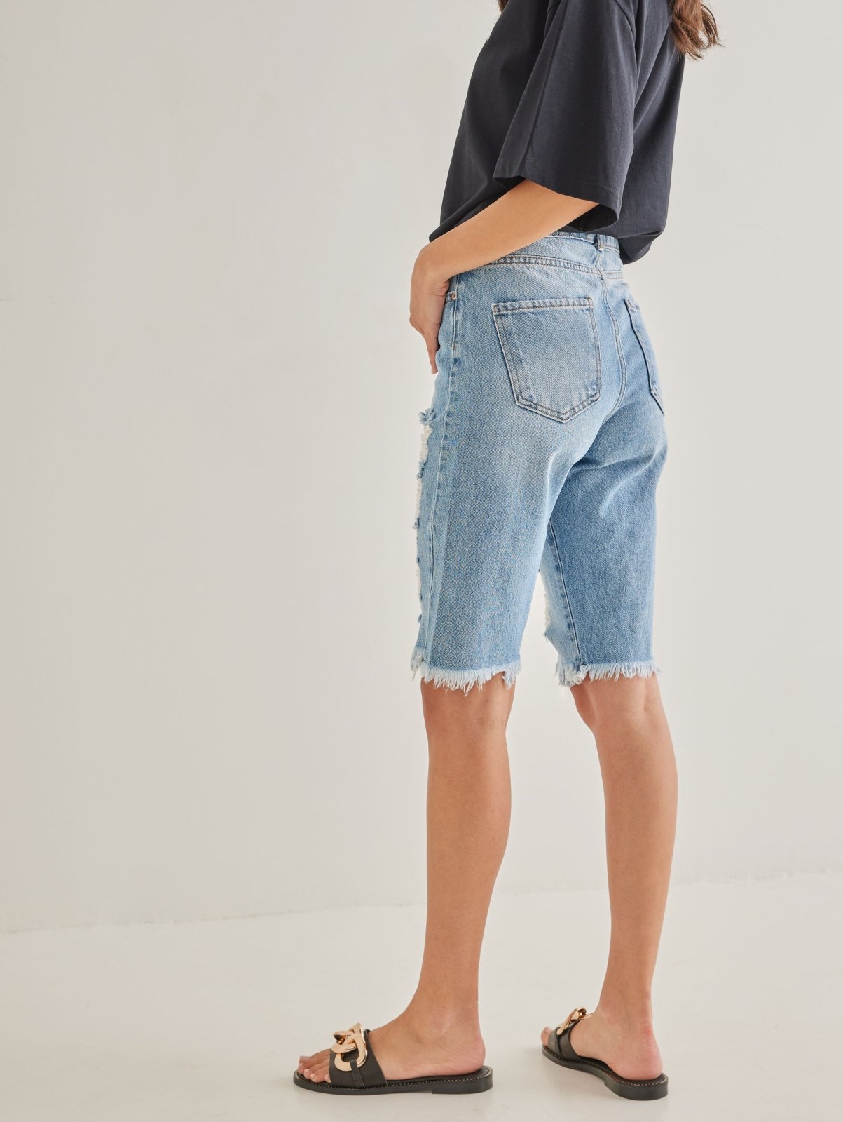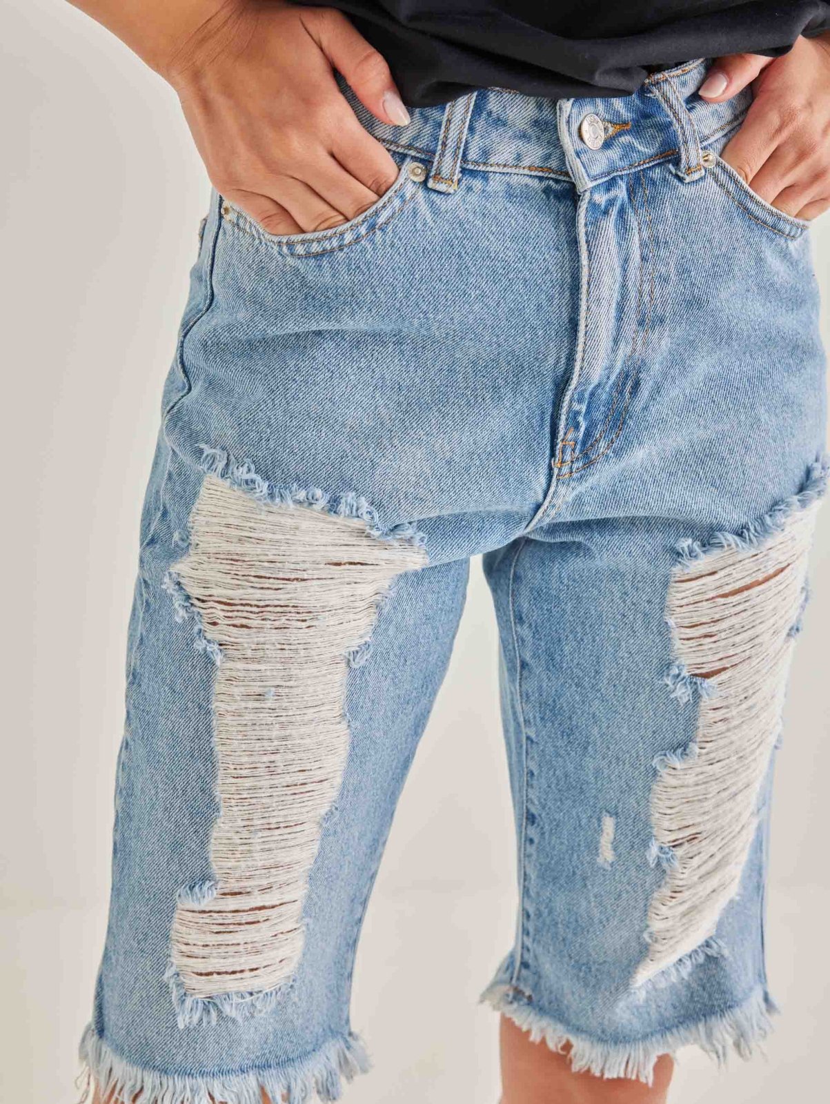 Τζιν βερμούδα σε ίσια γραμμή με σκισίματα στη μπροστινή πλευρά και φθορές στο τελείωμα.