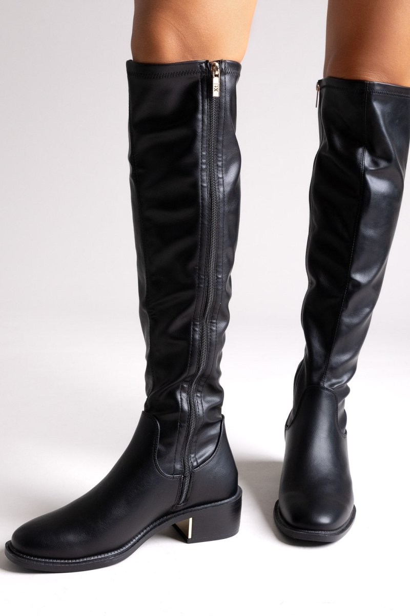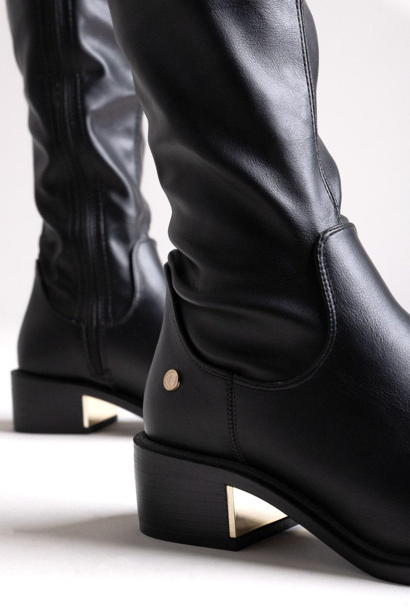 Xti 144722 vegan suede riding boots with side zipper and metallic heel detail. Timeless comfort, PETA approved.