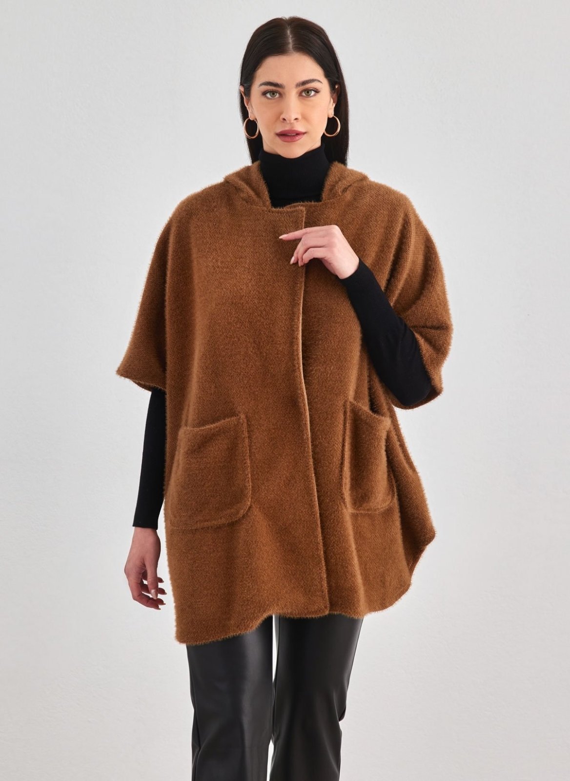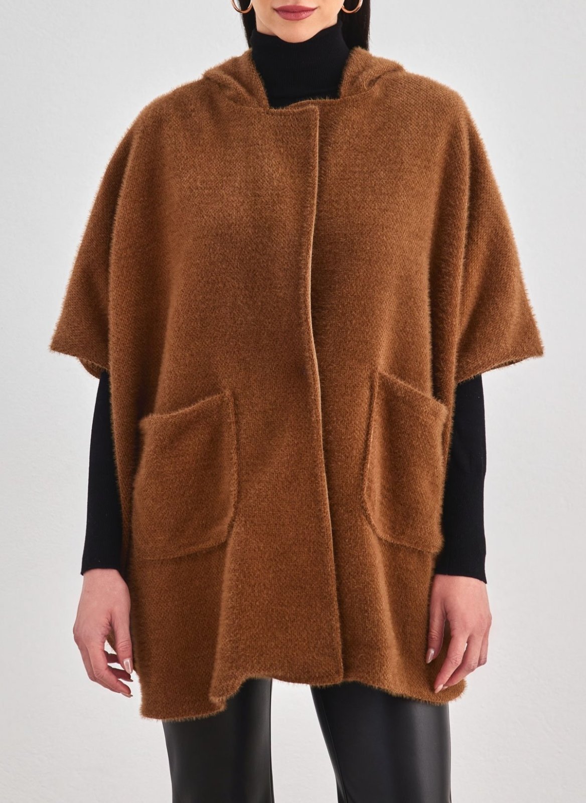Ζακέτα αμάνικη oversized. Έχει λεπτό γιακά και κουκούλα. Σενίλ μαλακό ύφασμα. Οριζόντιες τσέπες μπροστά. Κλείνει με κουμπί.