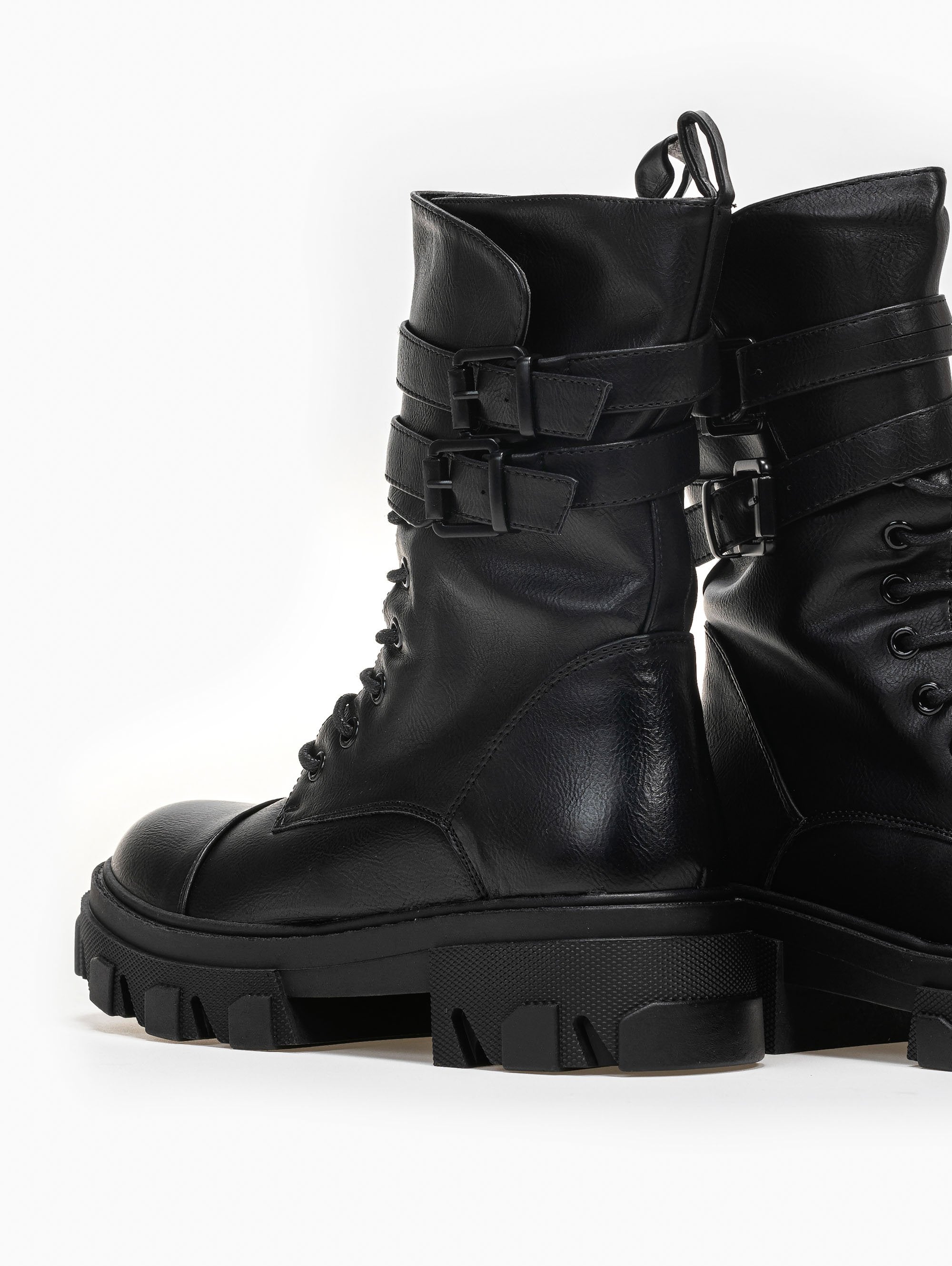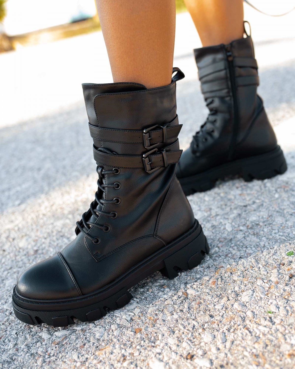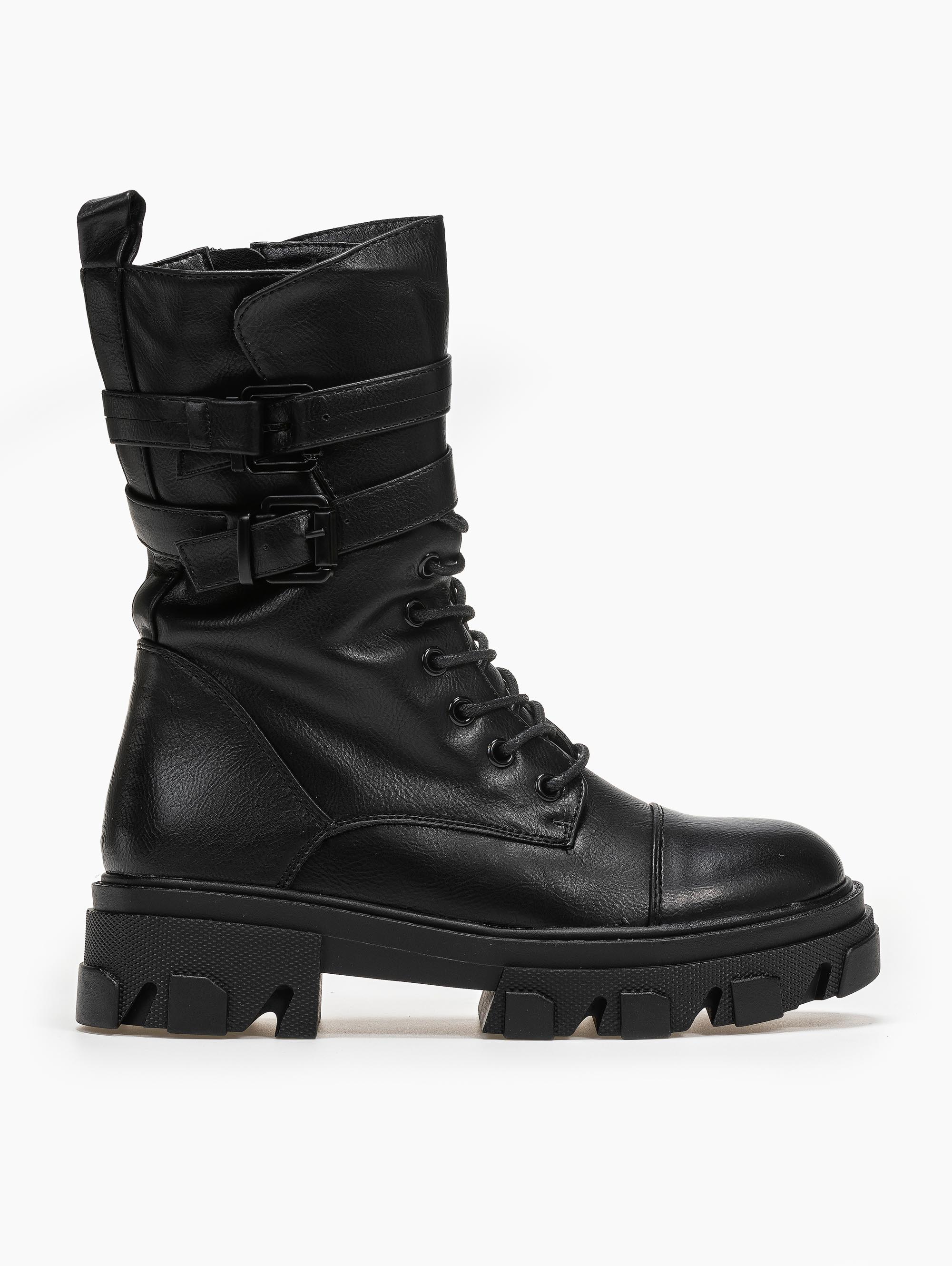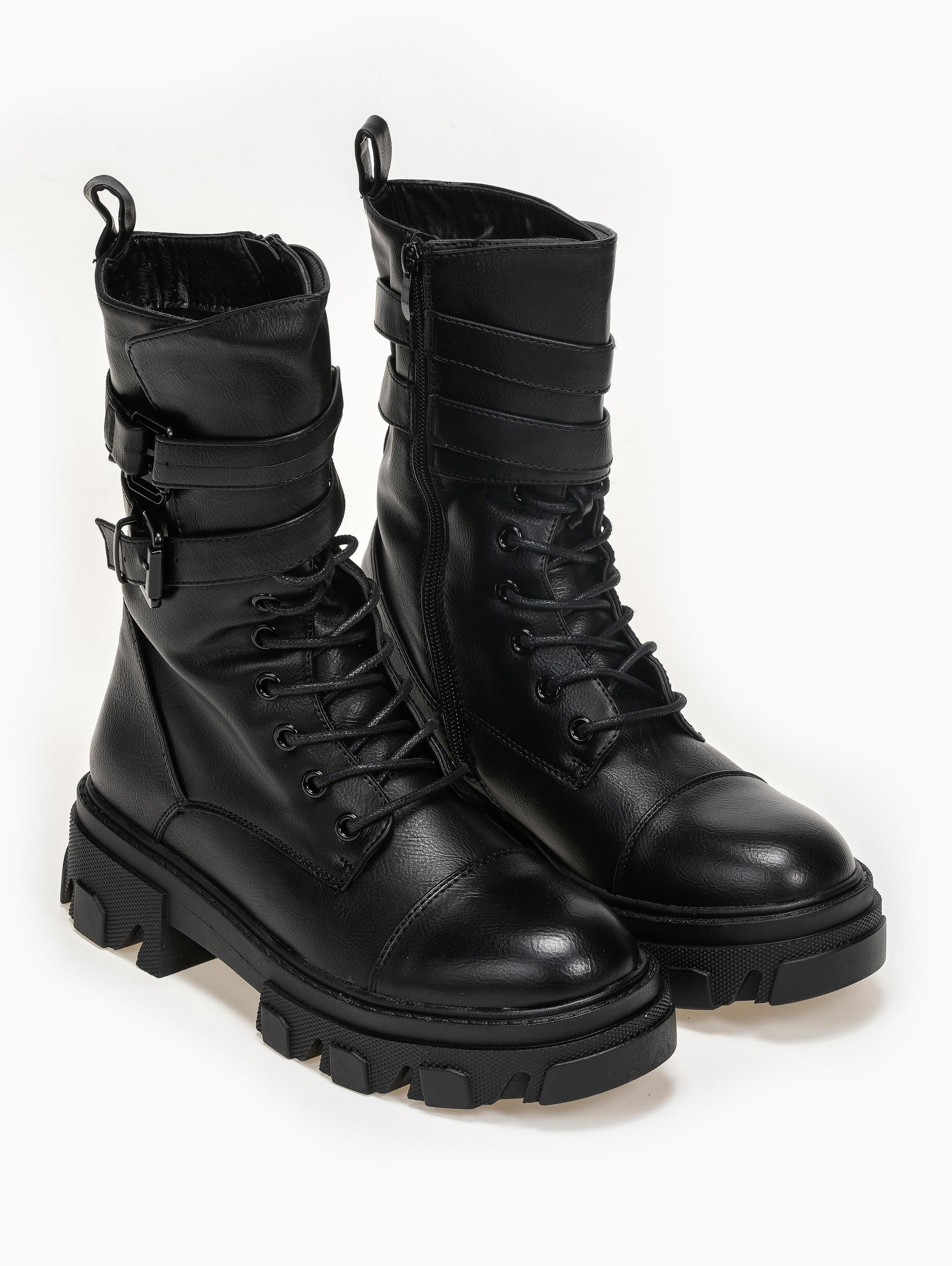 Αρβυλάκια με πιέτα στο τελείωμα. διακοσμητικά ζωνάκια με τετράγωνες αγκράφες. Η σόλα είναι ψηλή με σχέδια.