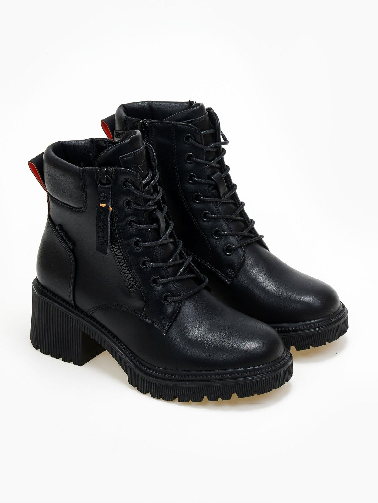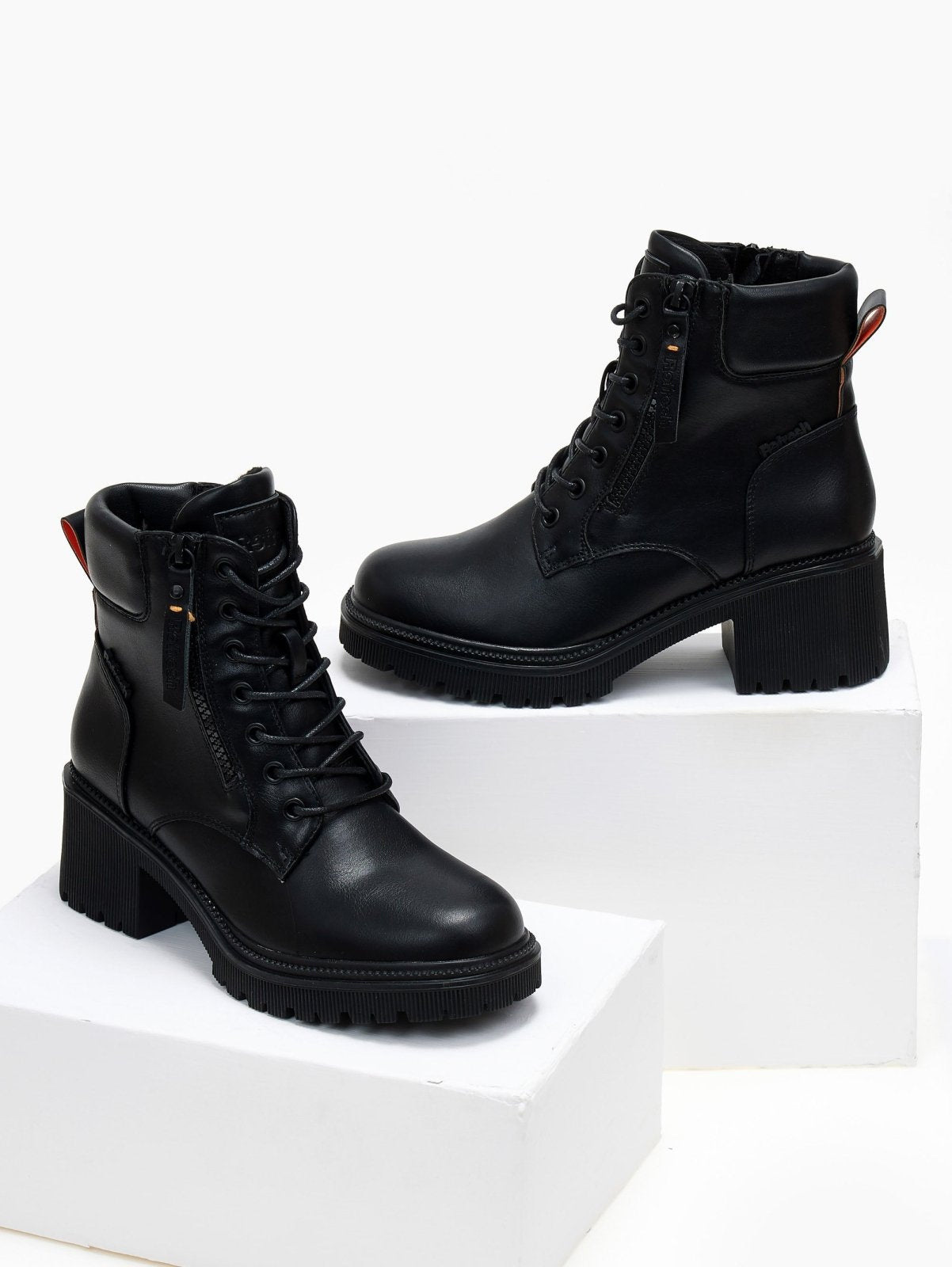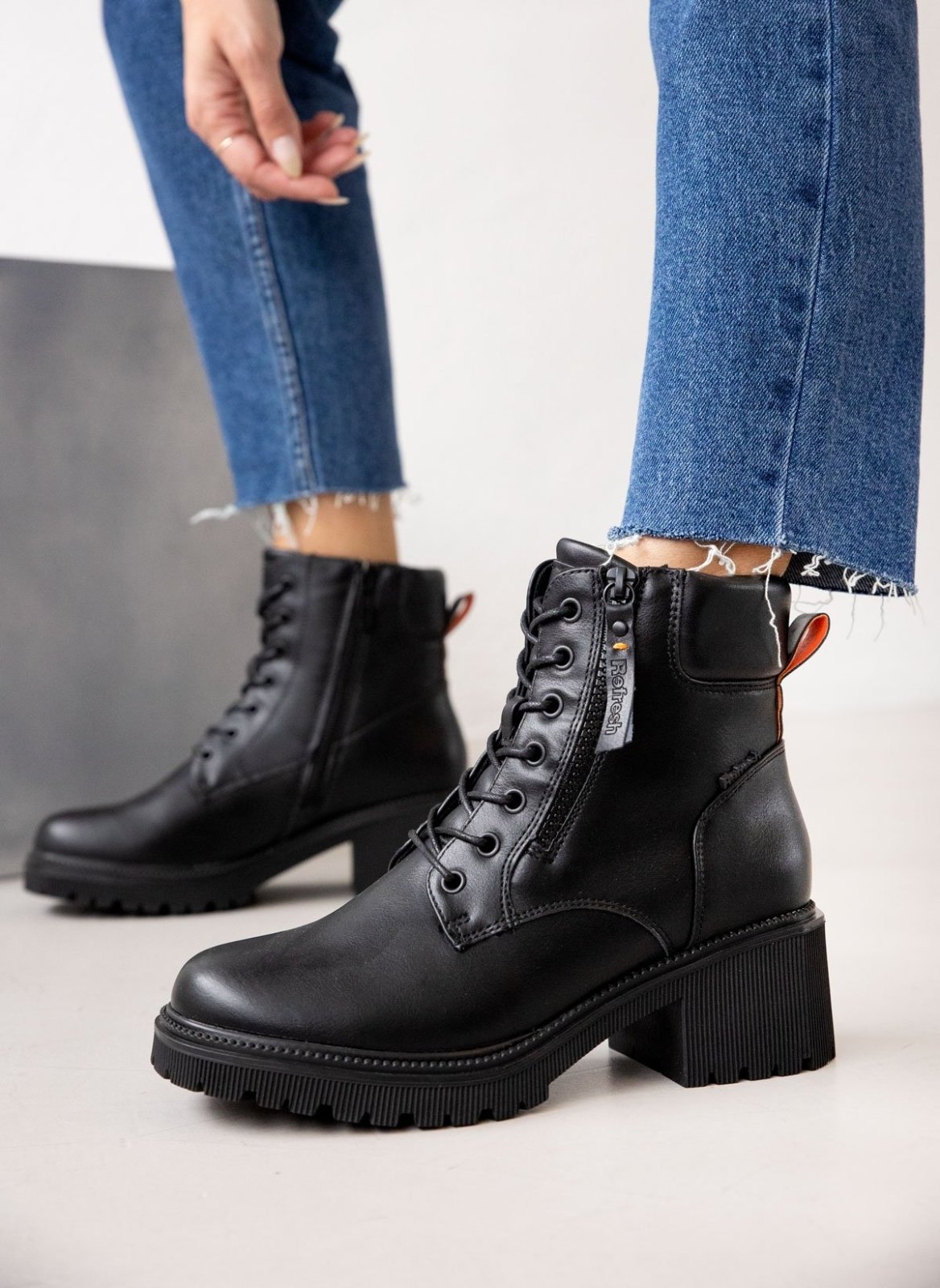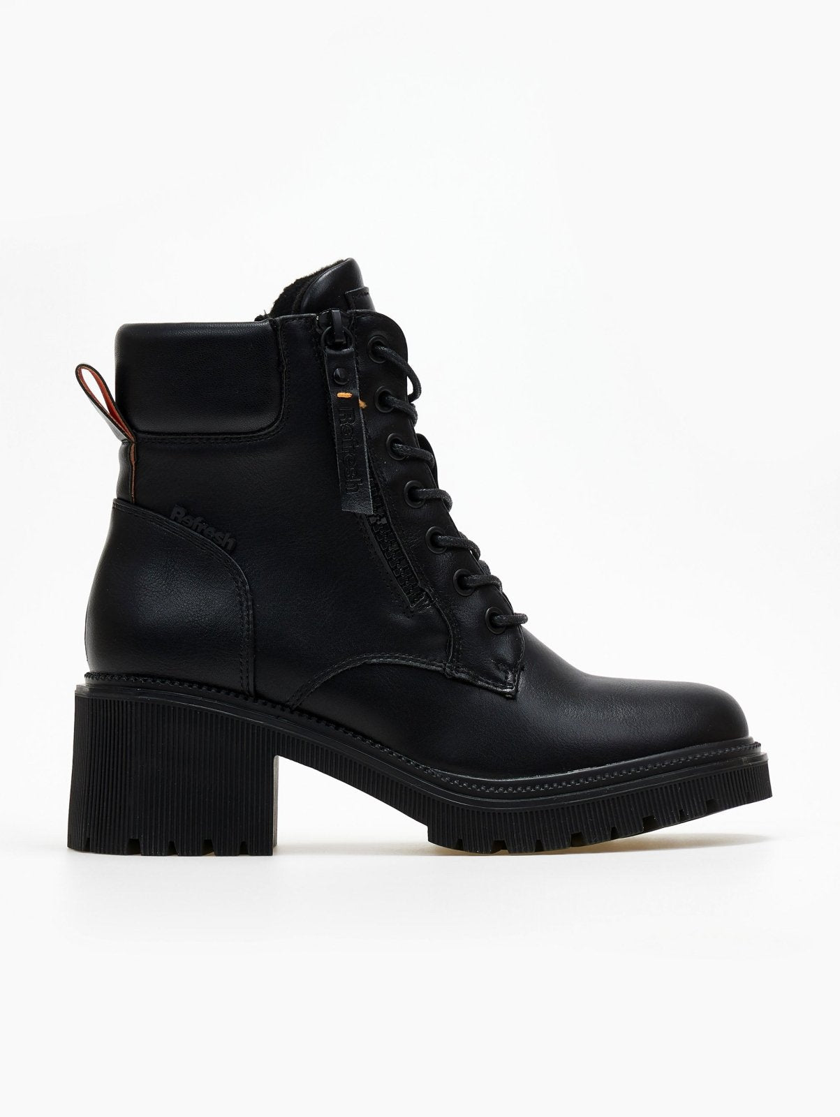 Αρβυλάκια με ιδιαίτερο χοντρό τακούνι Refresh. μαλακή επένδυση στο πίσω μέρος και θηλάκι. Διακοσμητικό φερμουάρ στο πλάι. Στρογγυλή γραμμή. Comfort μαλακός πάτος με memory foam. Εγκρίθηκε η Peta Vegan.