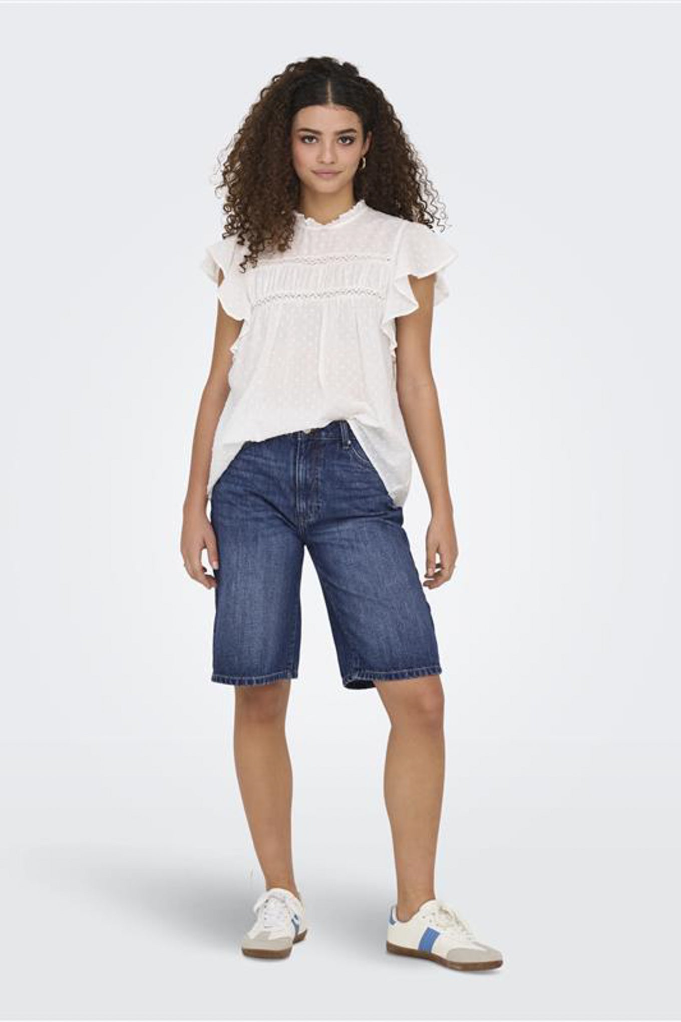 Βερμούδα τζιν ψηλόμεση ONLY. Έχει τσέπες μπροστά και πίσω. Κλείνει με κουμπί και φερμουαρ.