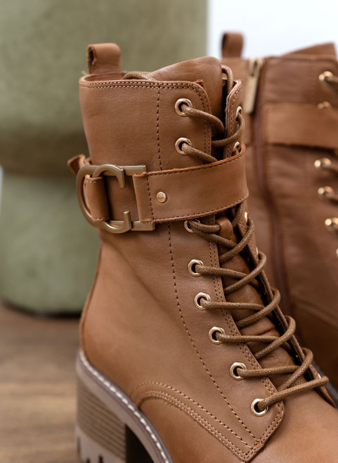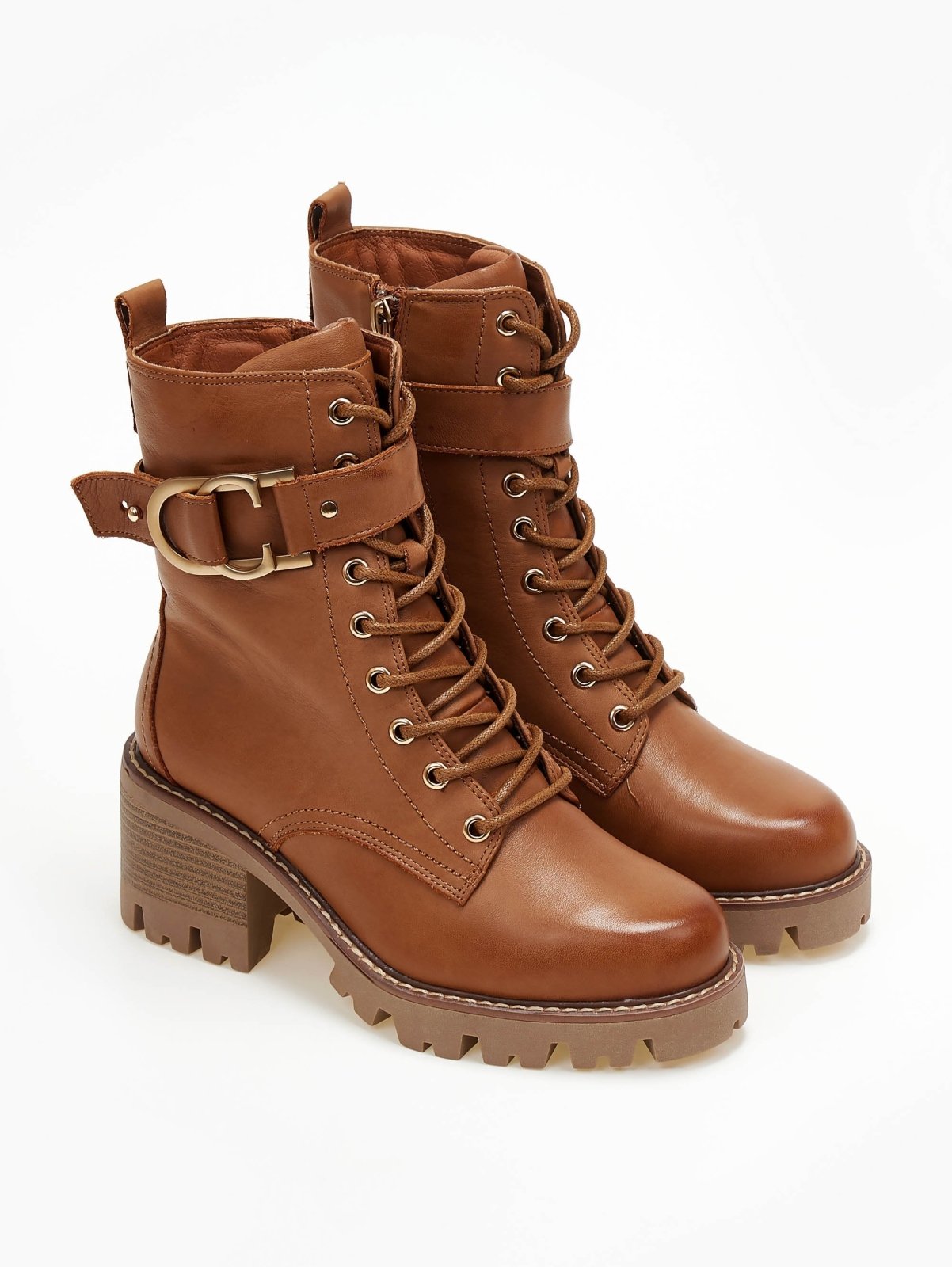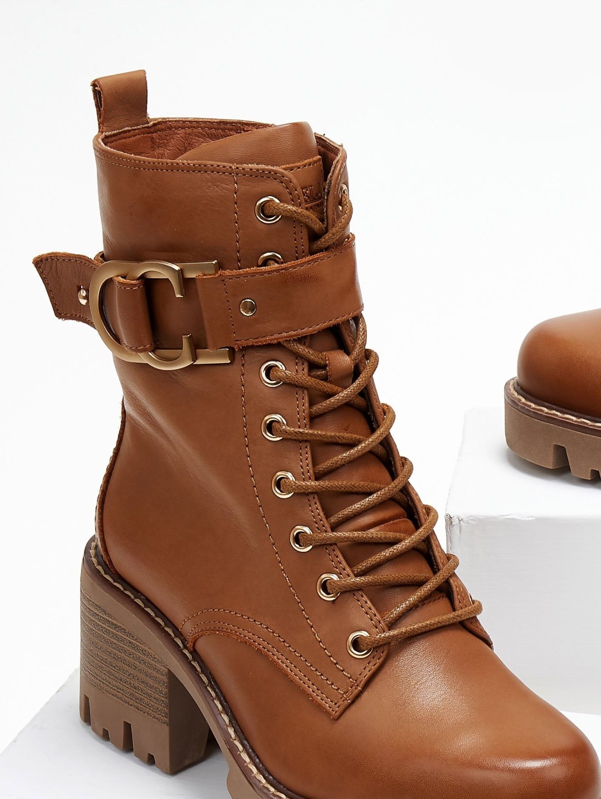 Αρβυλάκια δερμάτινα chunky Carmela. έχουν διακοσμητική ακράφα στο πλάι και κορδόνια. Χοντρό τετράγωνο τακούνι. Μεταλλικό φερμουάρ με το λογότυπο. Στρογγυλή γραμμή. Δερμάτινος comfort πάτος.