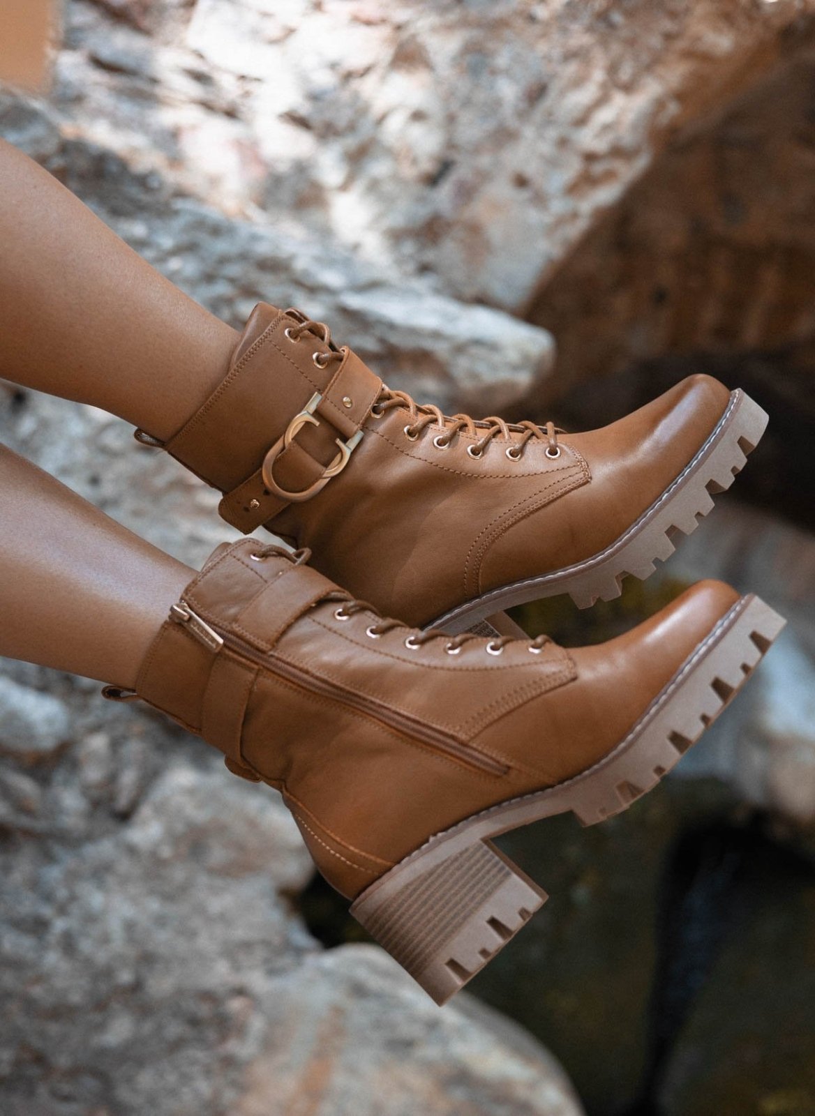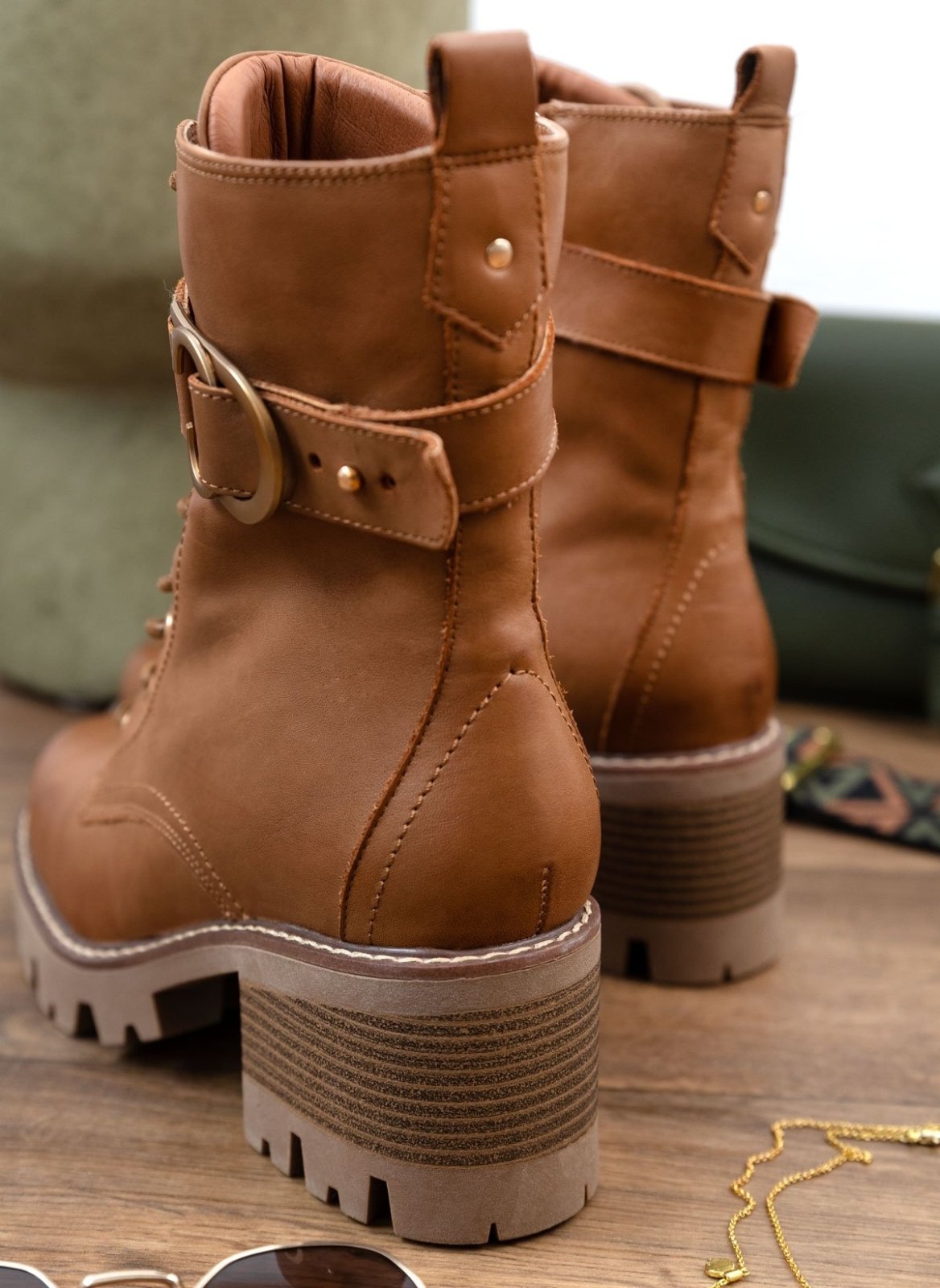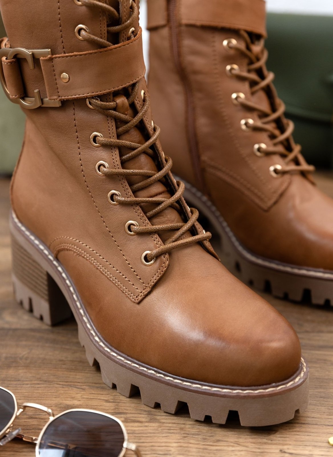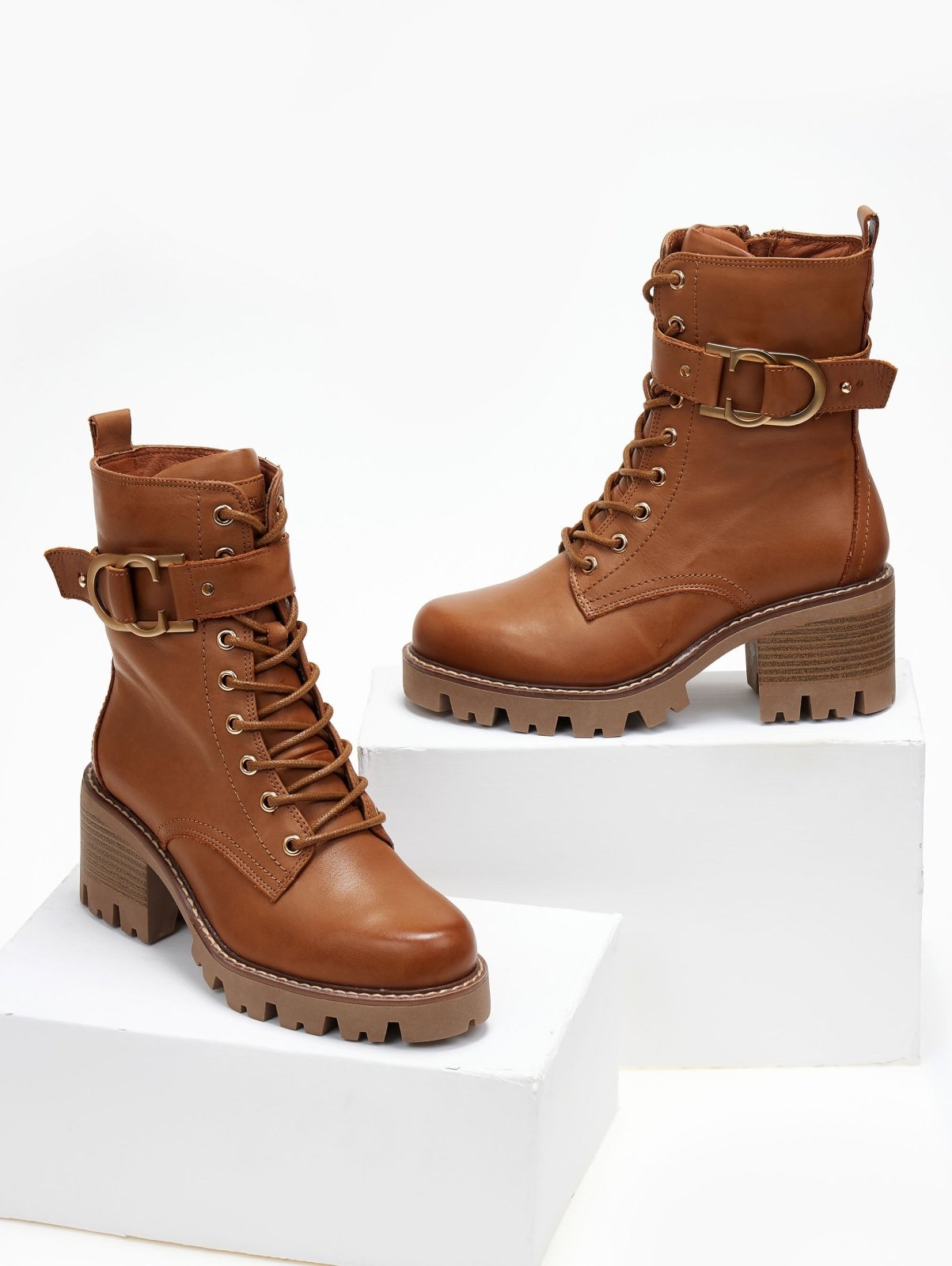 Αρβυλάκια δερμάτινα chunky Carmela. έχουν διακοσμητική ακράφα στο πλάι και κορδόνια. Χοντρό τετράγωνο τακούνι. Μεταλλικό φερμουάρ με το λογότυπο. Στρογγυλή γραμμή. Δερμάτινος comfort πάτος.