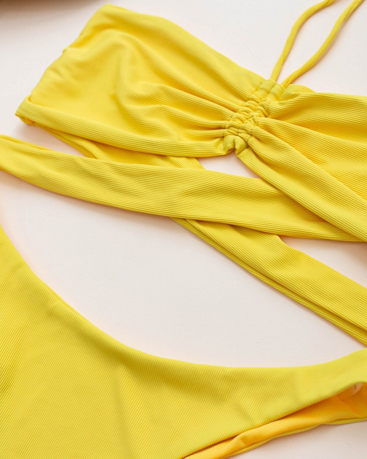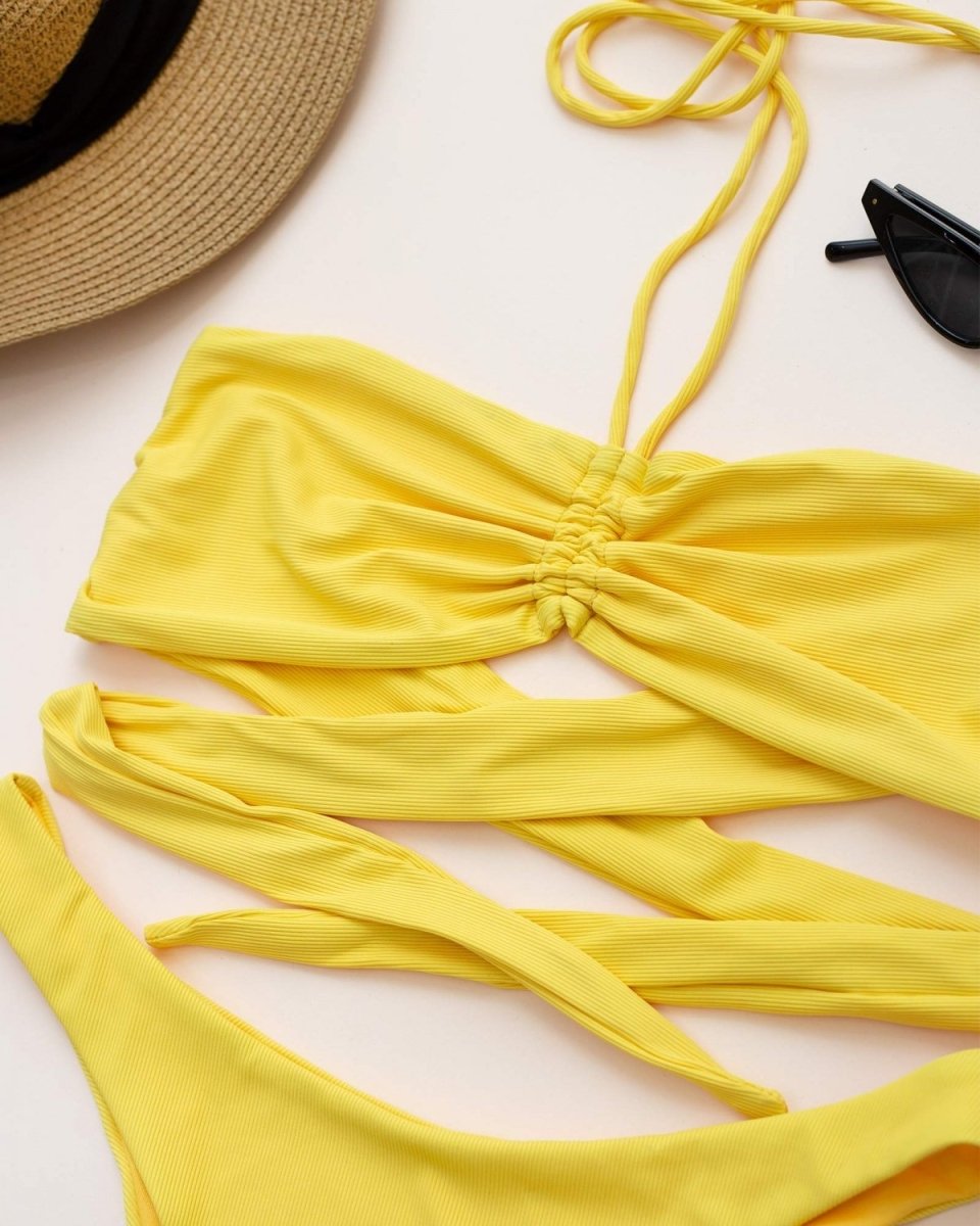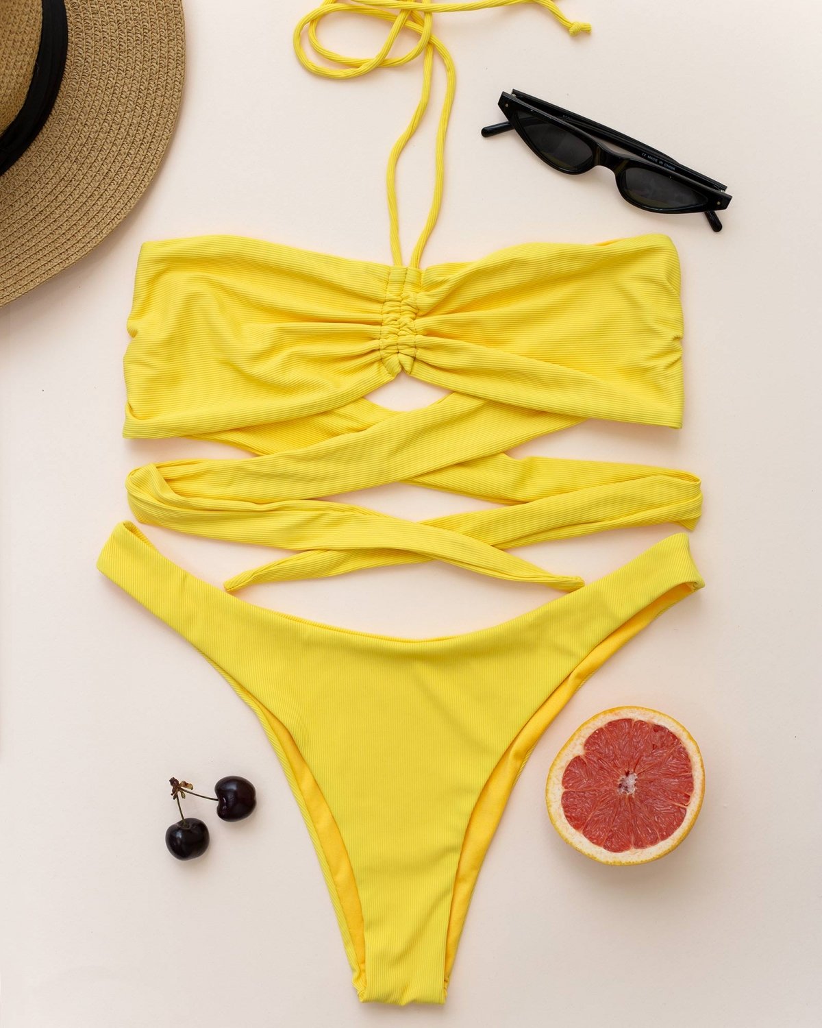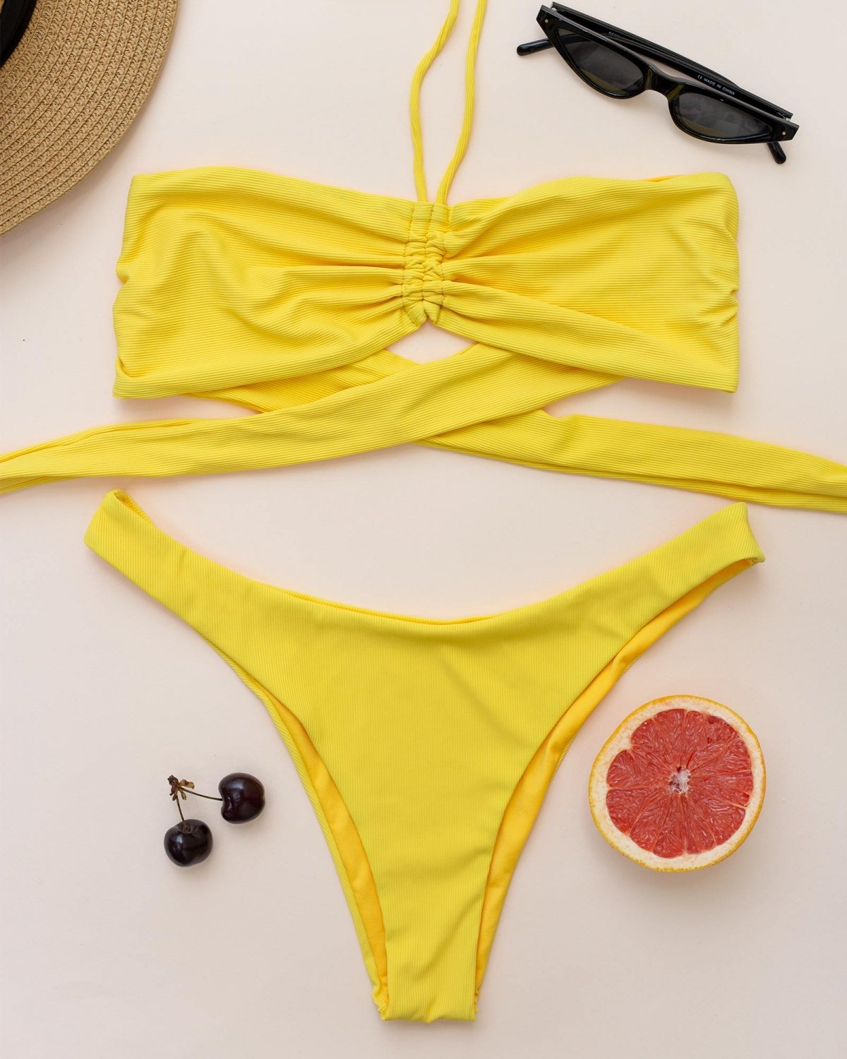 Μαγιό μπικίνι ριπ. Το top είναι στράπλες και έχει κορδονάκι με δέσιμο στο λαιμό. Το slip είναι V-cut ψηλόμεσο. Μέτρια κάλυψη.