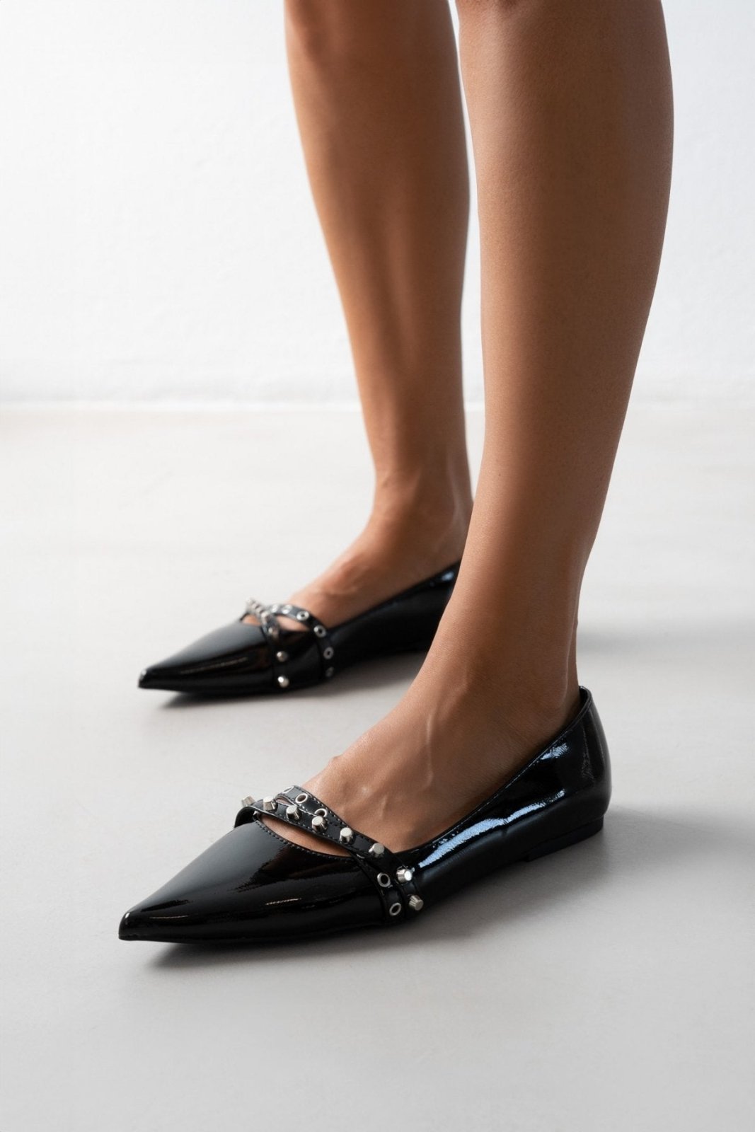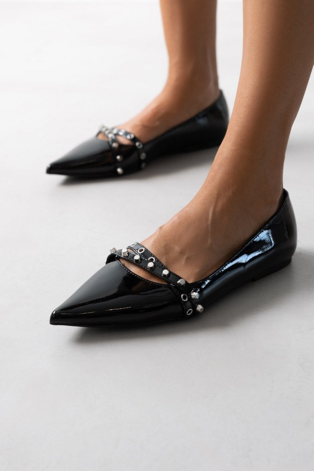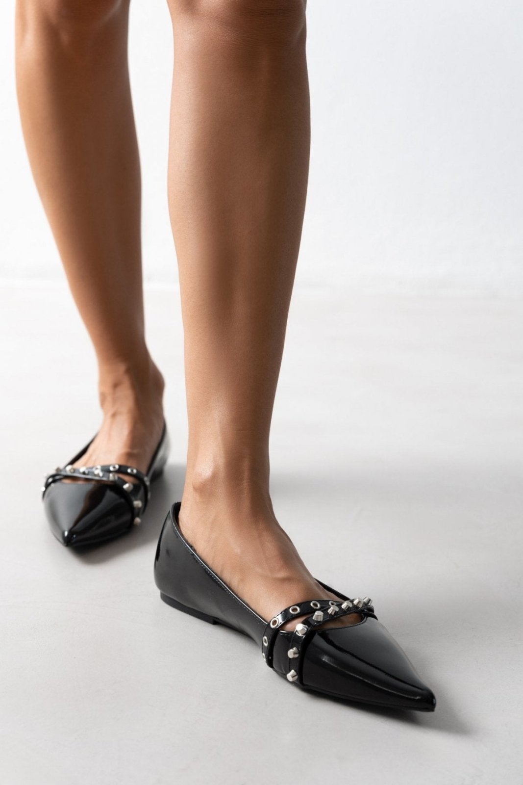 Μπαλαρίνες λουστρίνι μυτερές ERYNN. Crossover λουράκια με μεταλλικά τρουκς στα δάκτυλα.