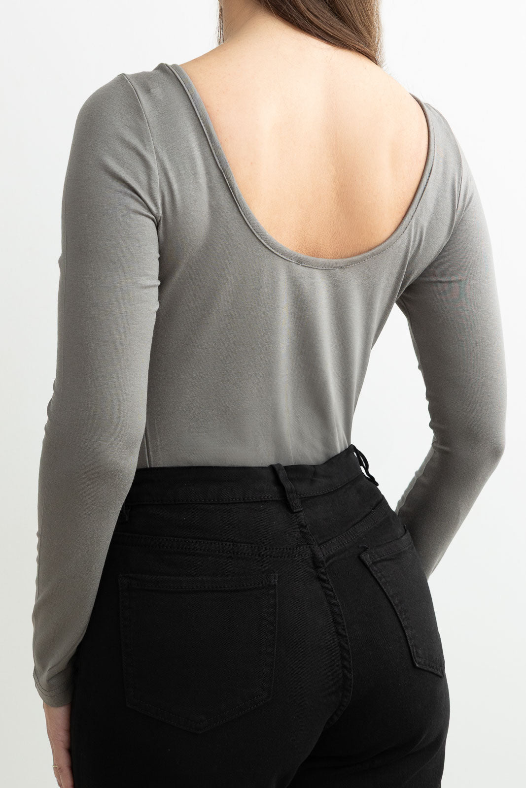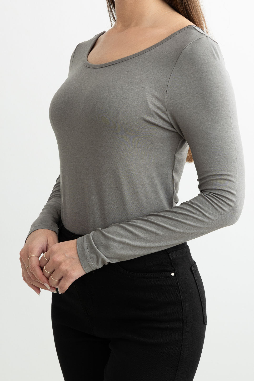 Basic μακρυμάνικη μπλούζα. Έχει στρογγυλή λαιμόκοψη και ανοιχτή πλάτη. Εφαρμοστή γραμμή
