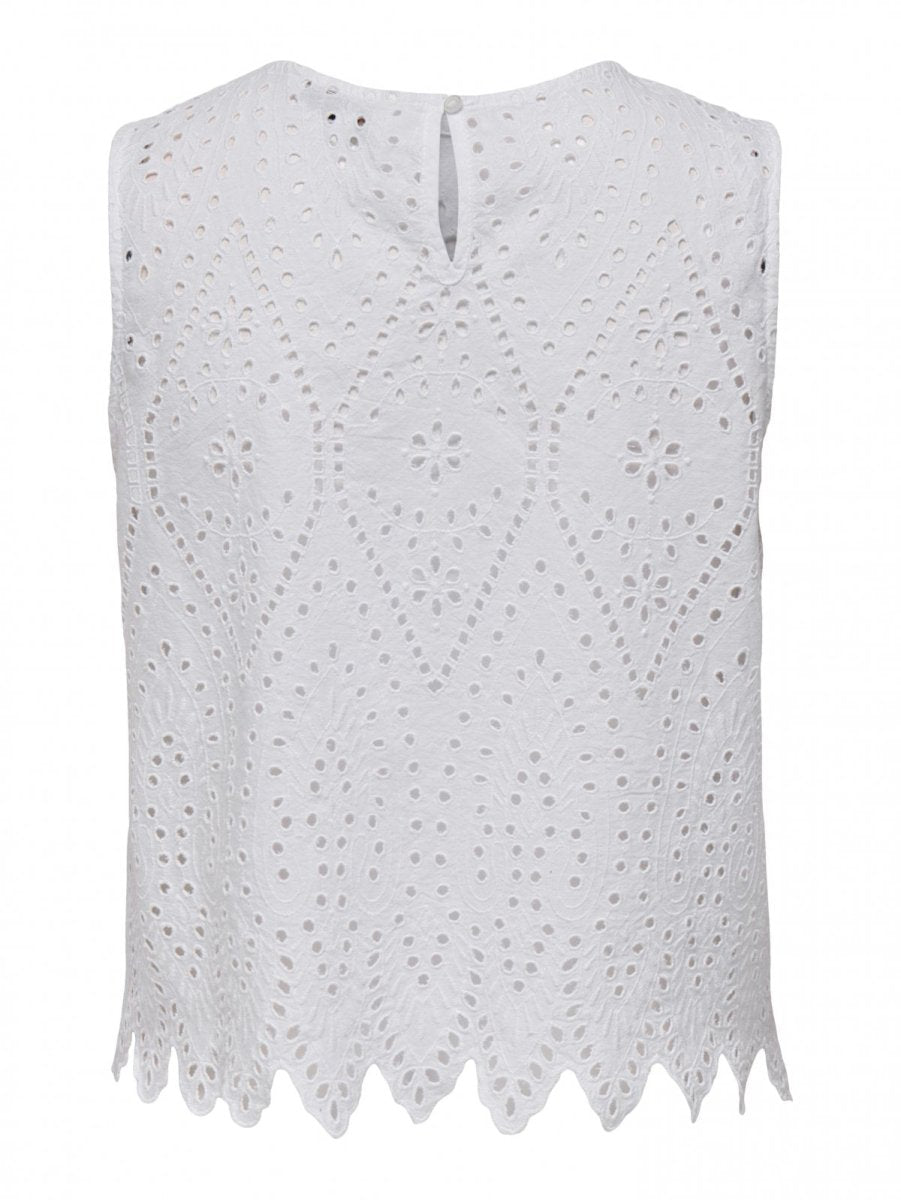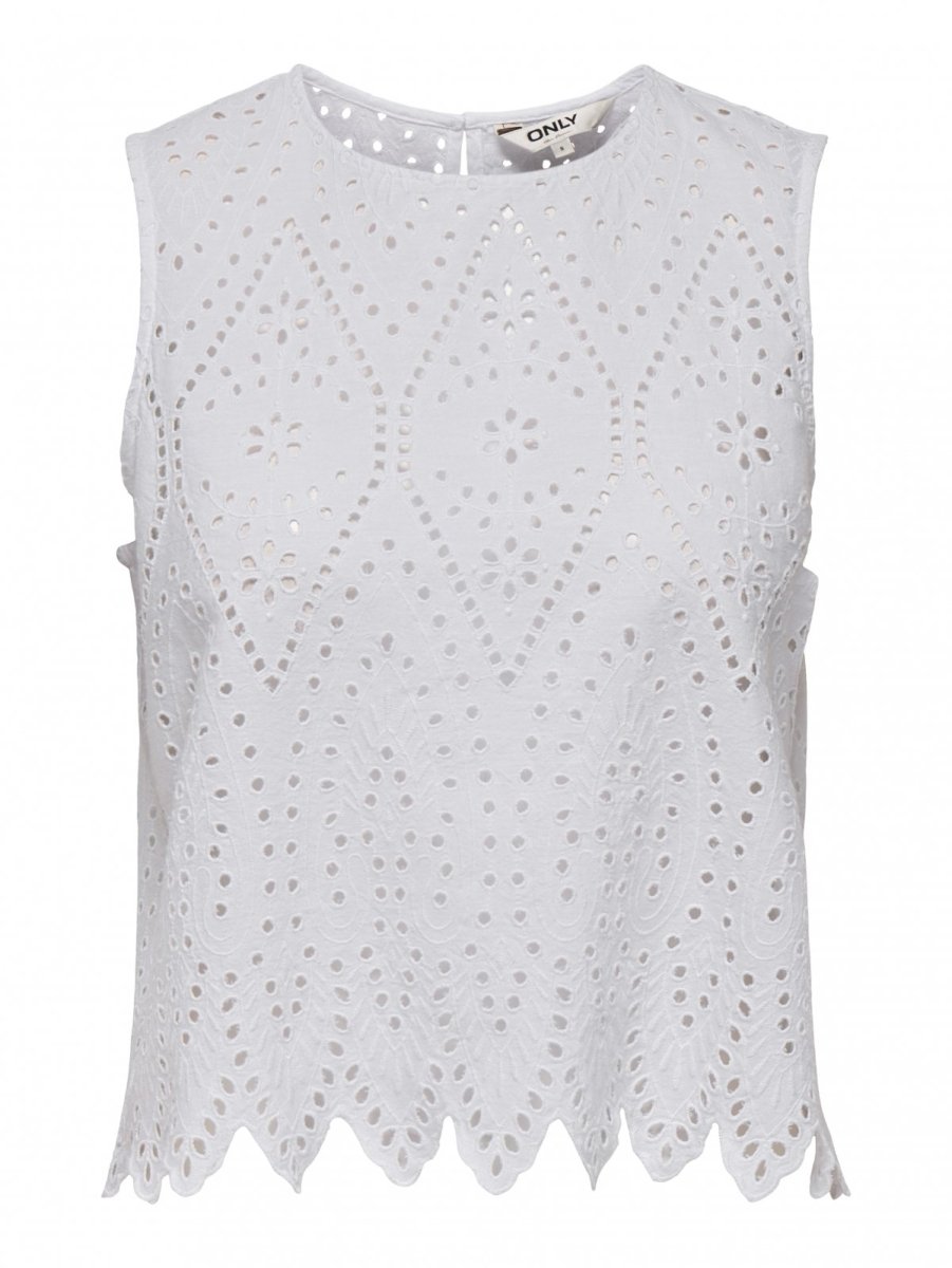 Μπλούζα αμάνικη με διάτρητο σχέδιο ΜΟΝΟ. Μικρό άνοιγμα με κουμπί στο πίσω μέρος. Στρογγυλή λαιμόκοψη.