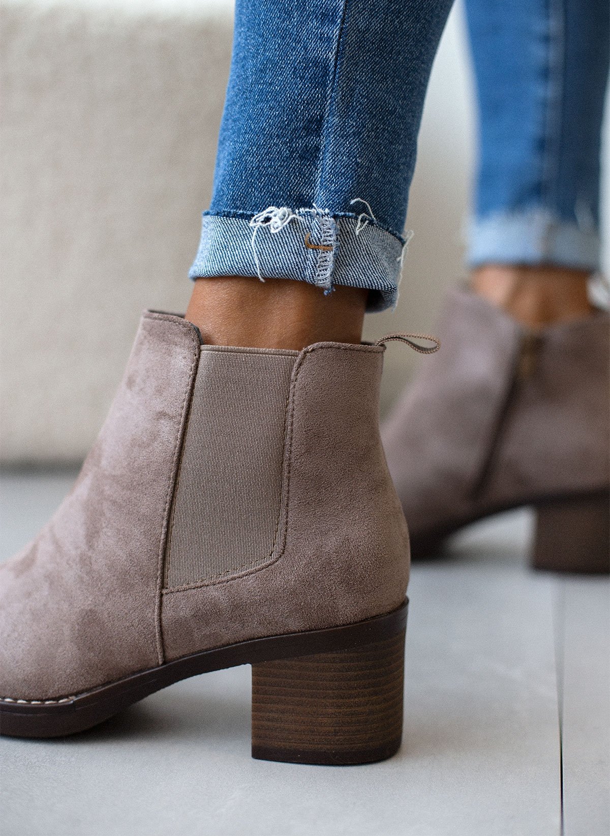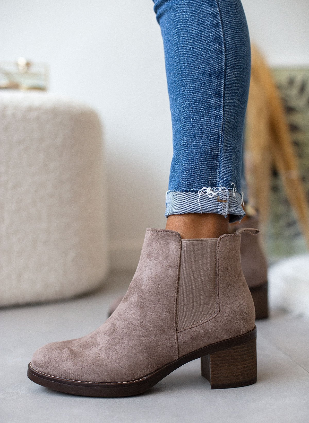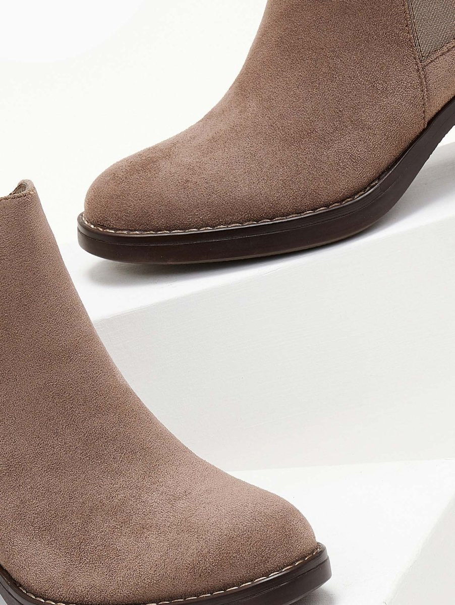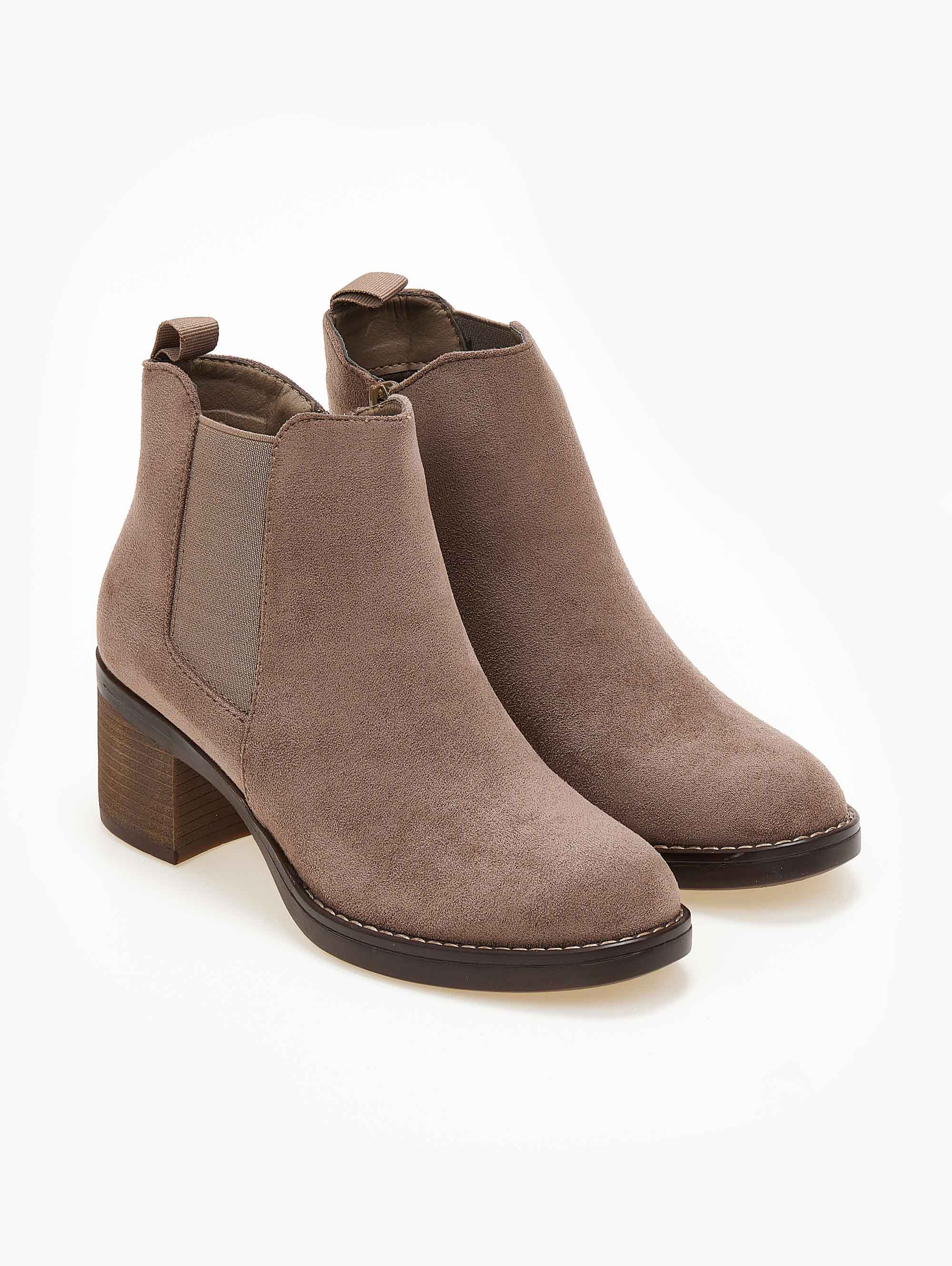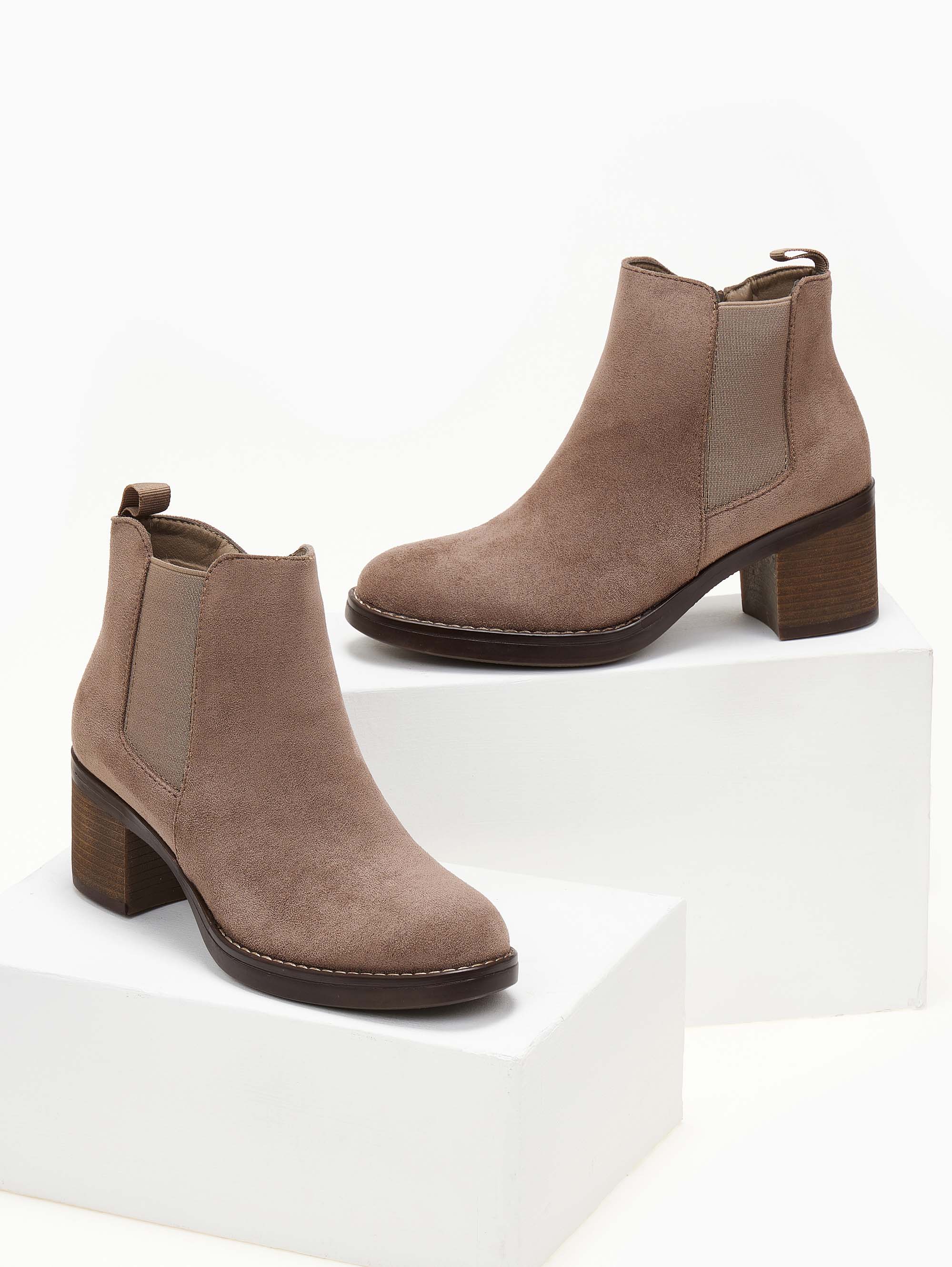 Suede μποτάκια αστραγάλου σε στρογγυλή γραμμή. Έχουν λάστιχο στην εξωτερική τους πλευρά. Εξωτερική ραφή περιμετρικά της σόλας. Χαμηλό τετράγωνο τακούνι.