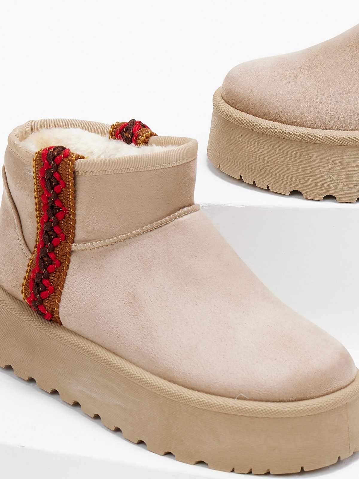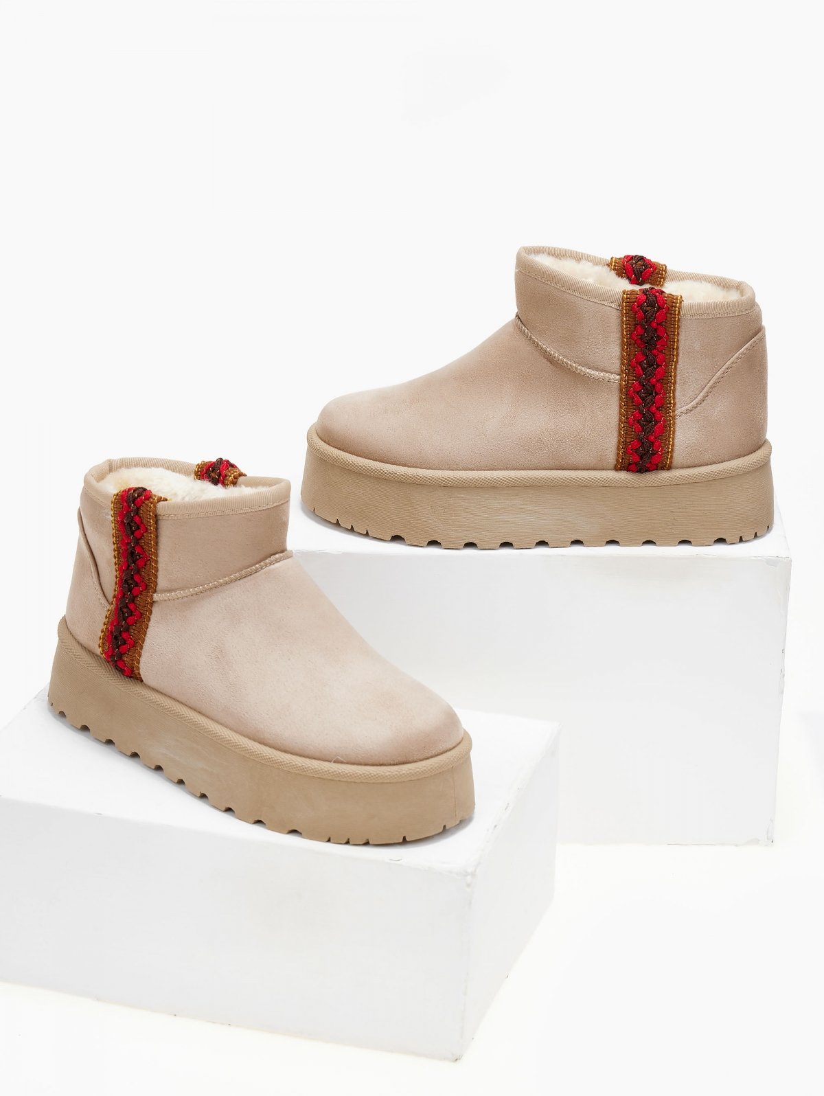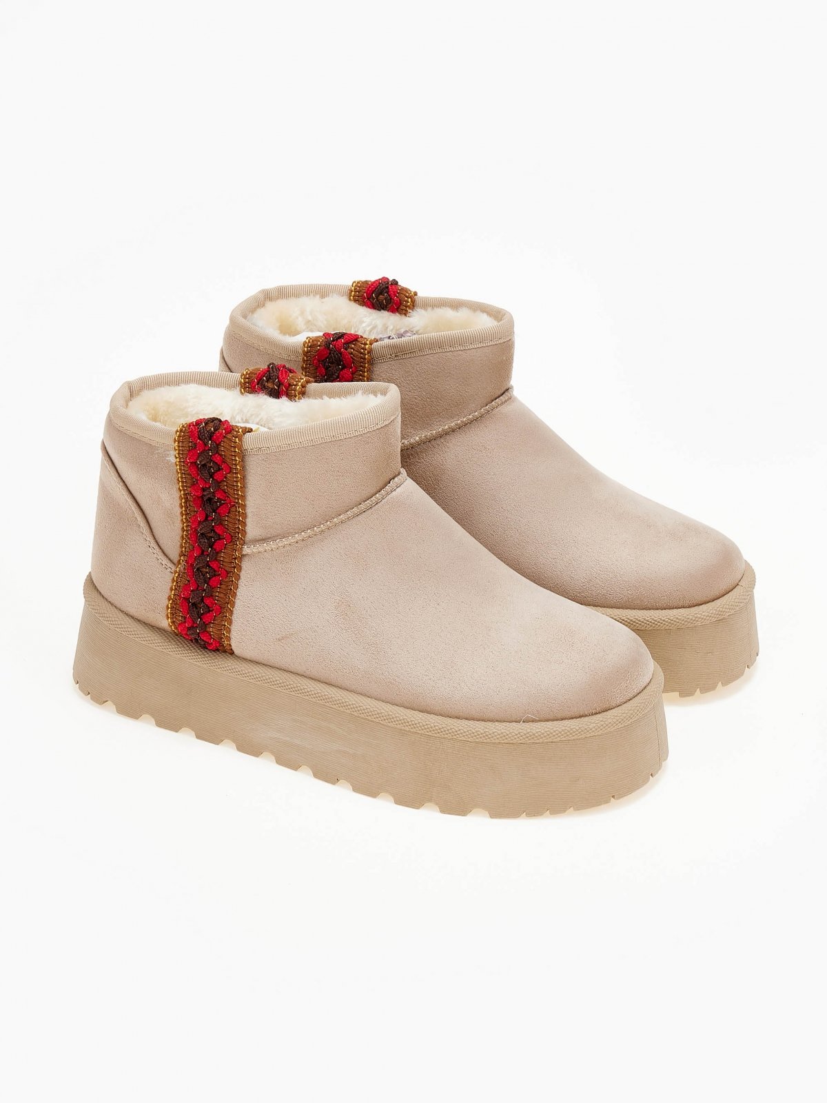 Μποτάκια κοντά σουέντ με ψηλή σόλα. επένδυση από συνθετική γούνα. Σχέδιο τρέσα με boho σχέδιο στην εξωτερική τους πλευρά.