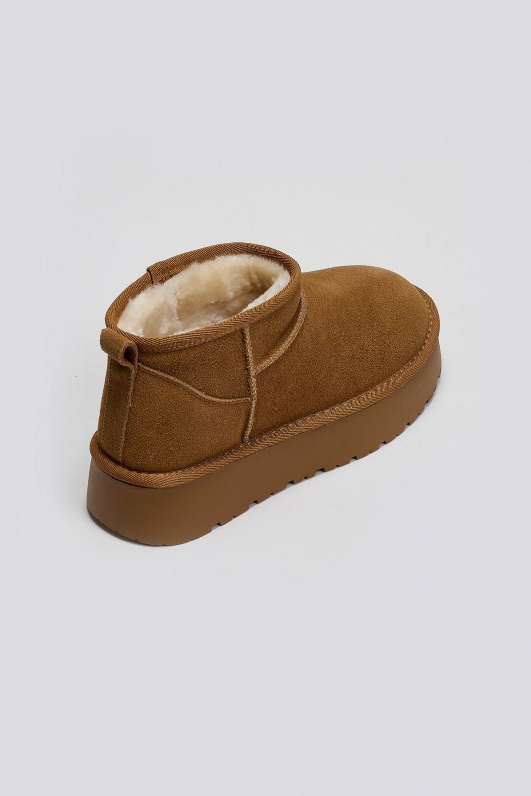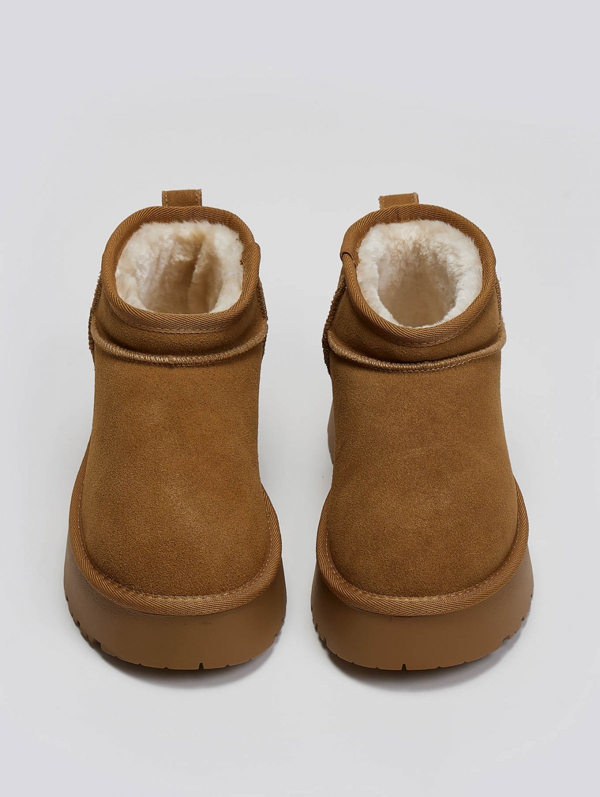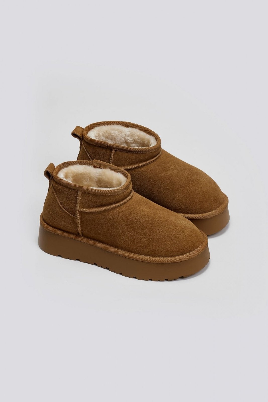 Μποτάκια δερμάτινα suede αστραγάλου flatforms. Επένδυση από συνθετική γούνα στο εσωτερικό τους. Λεπτομέρεια με ραφές. Στρογγυλή γραμμή.