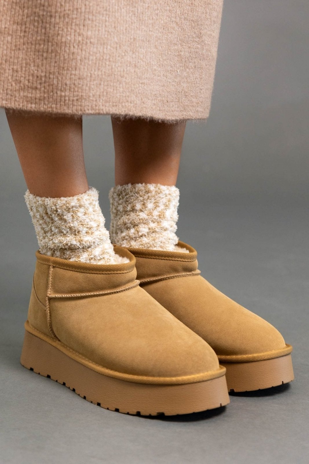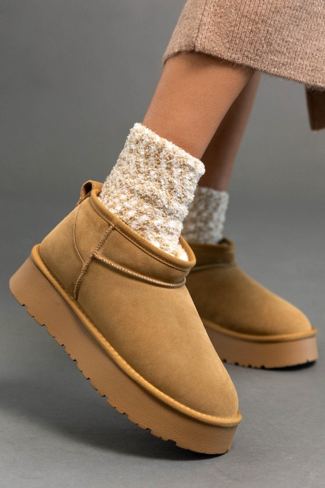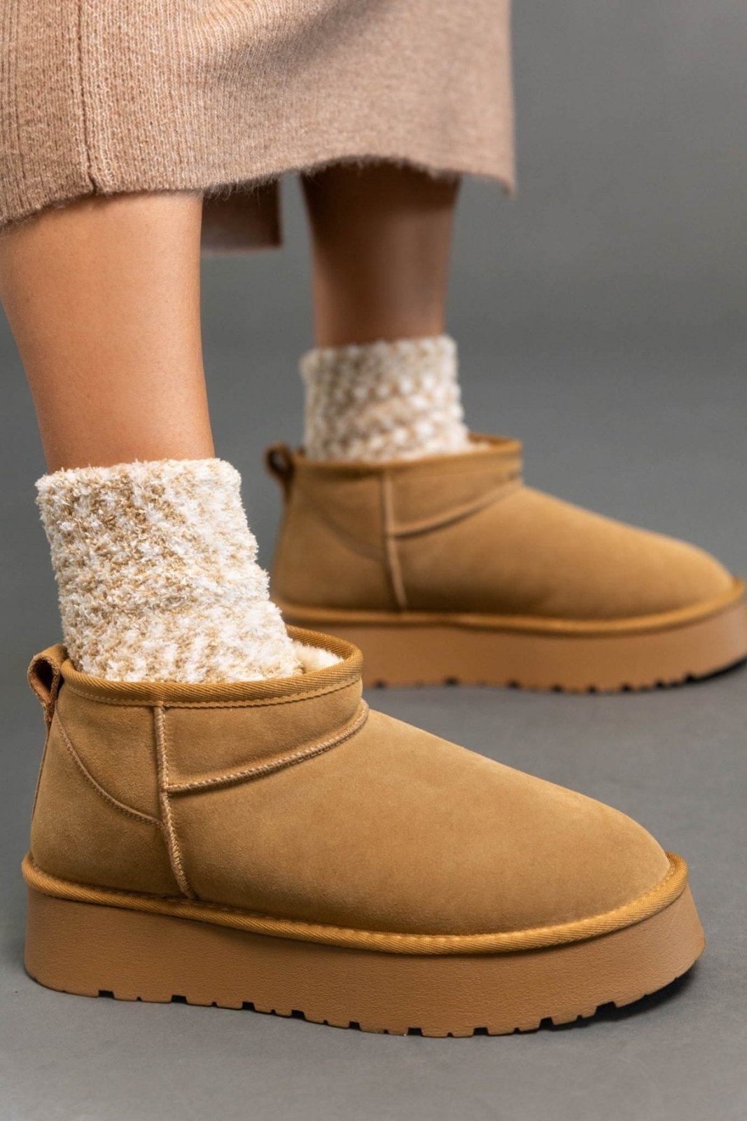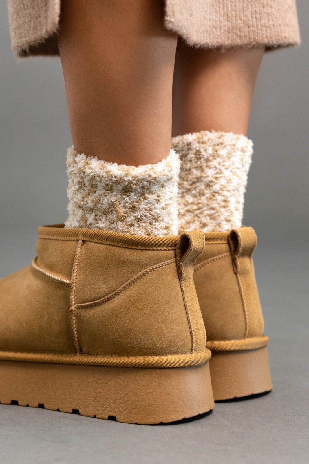 Μποτάκια δερμάτινα suede αστραγάλου flatforms. Επένδυση από συνθετική γούνα στο εσωτερικό τους. Λεπτομέρεια με ραφές. Στρογγυλή γραμμή.