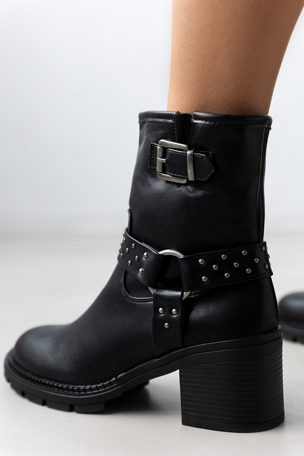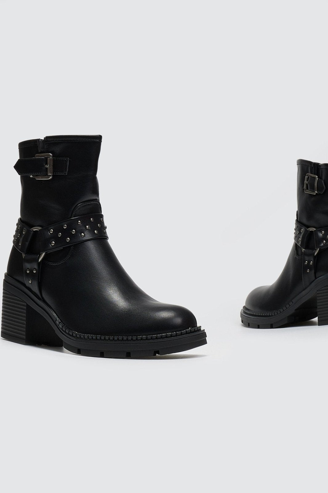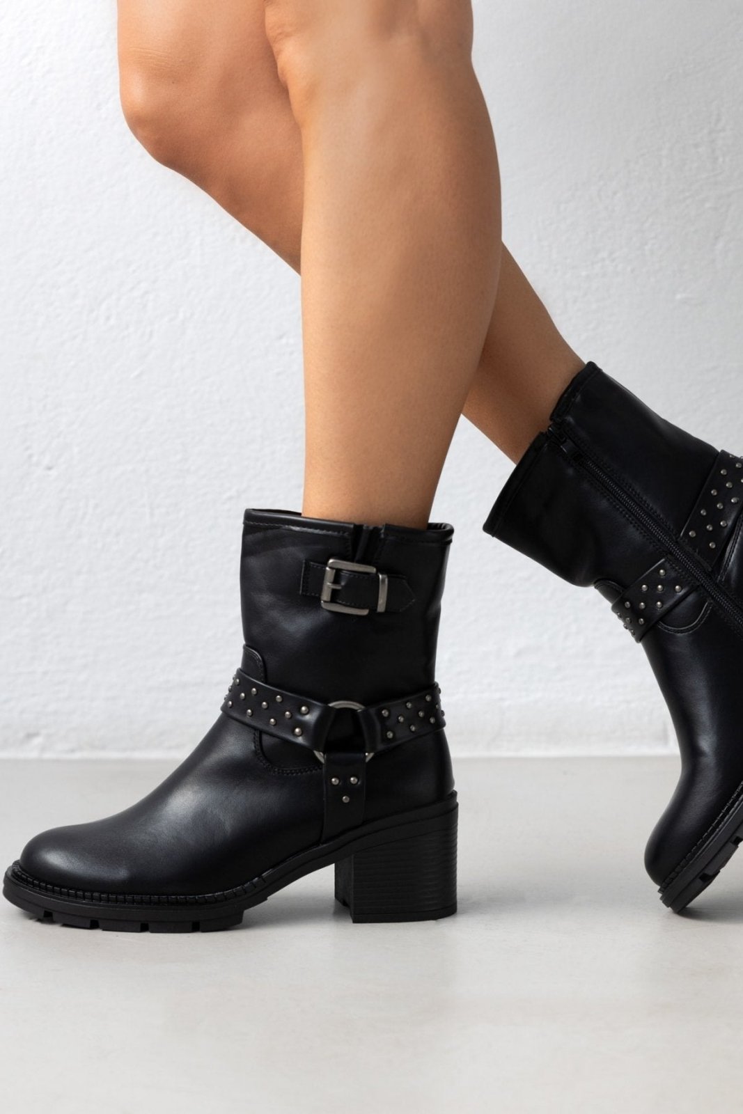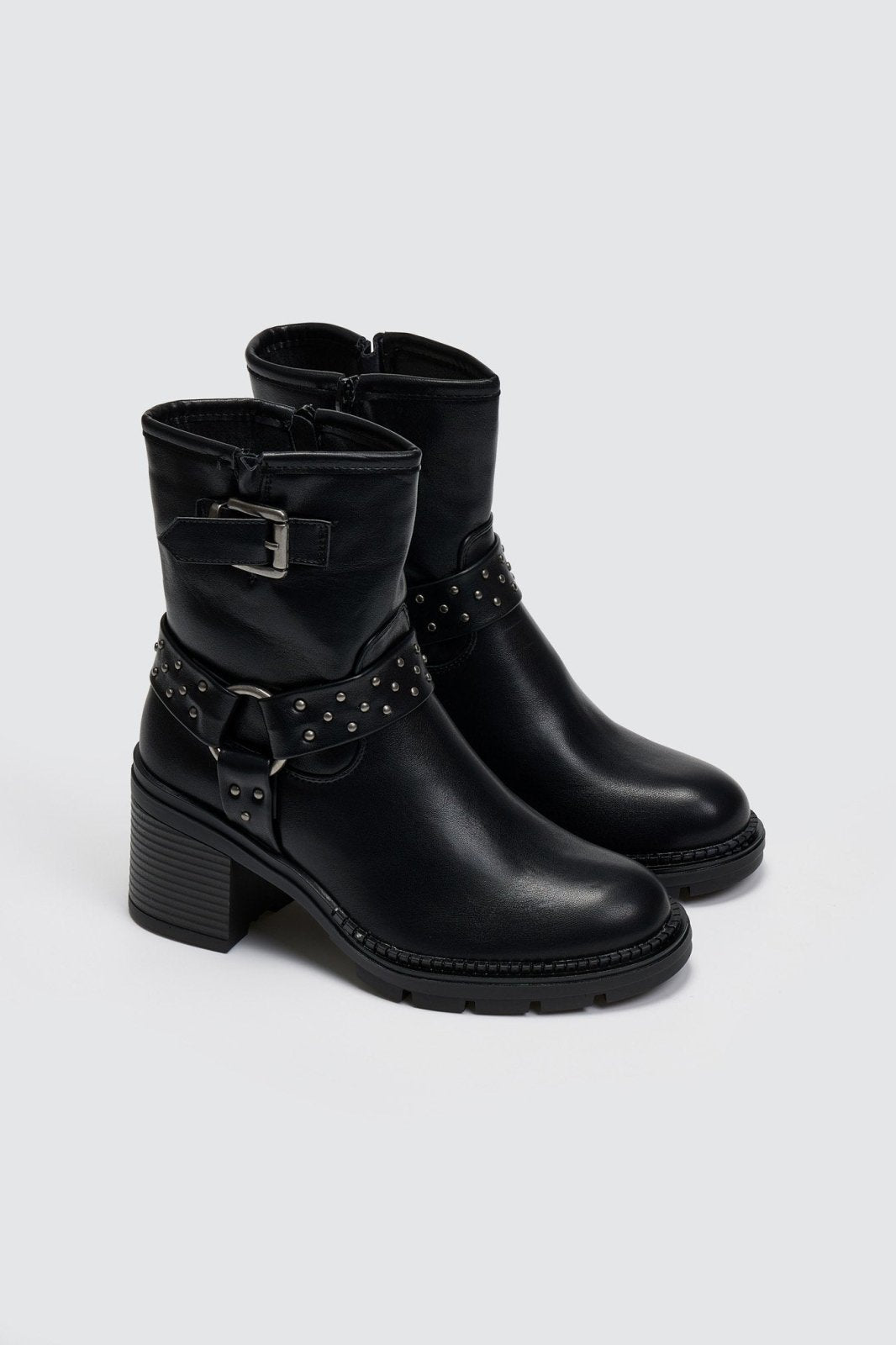 Μποτάκια biker με τακούνι. Σχέδιο με ζωνάκια και λεπτομέρειες σε ματ μεταλλικό χρώμα. Στρογγυλή γραμμή. Κλείνουν με φερμουάρ στο πλάι.