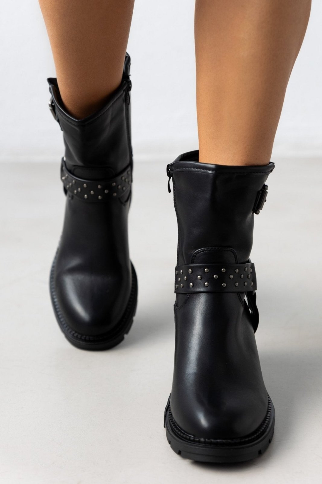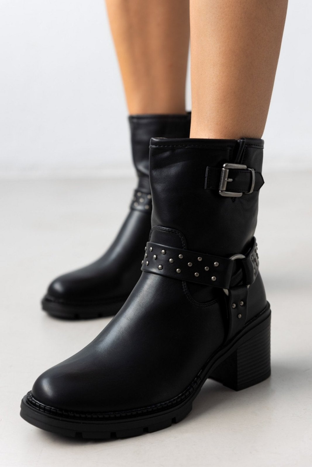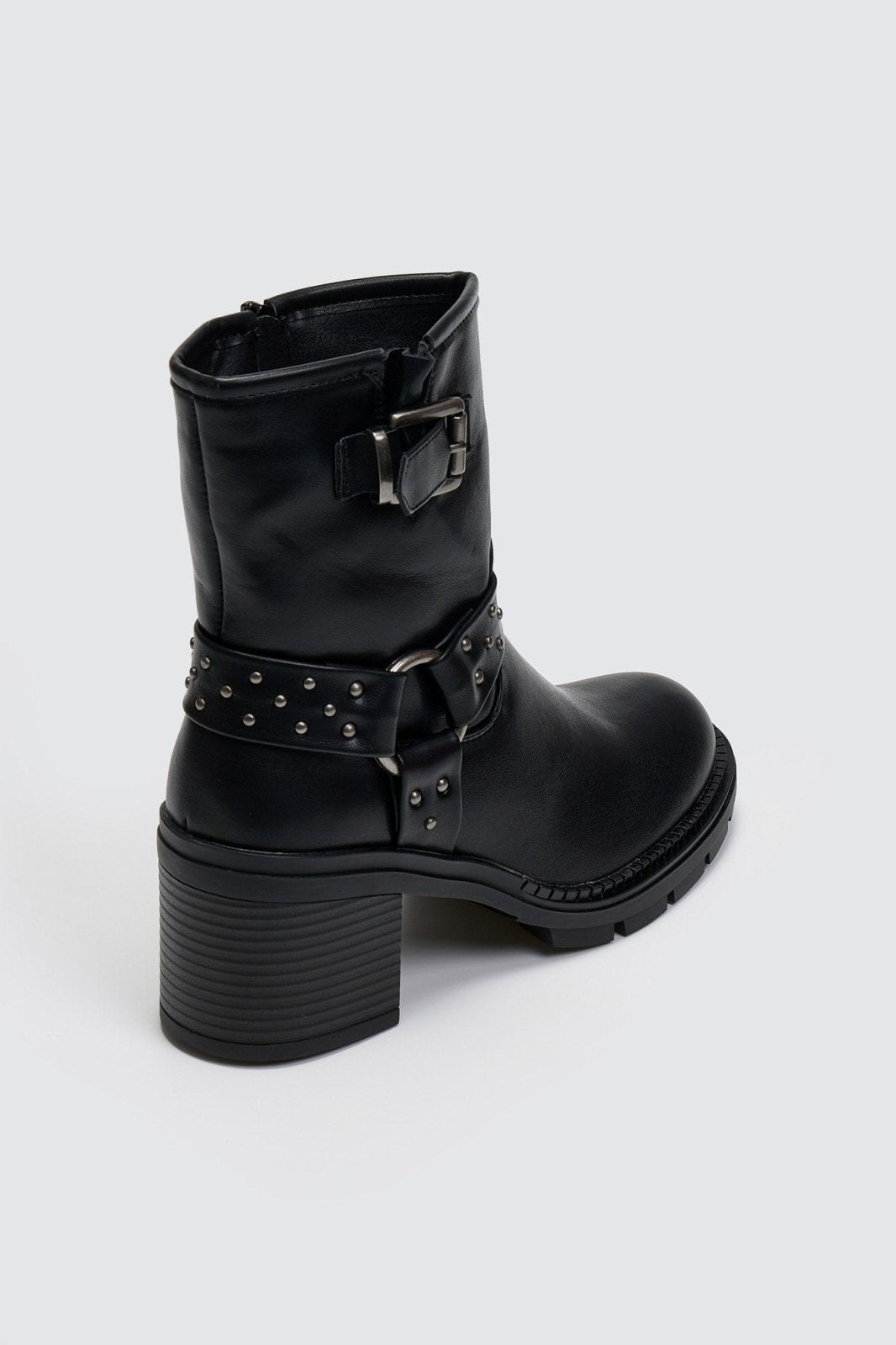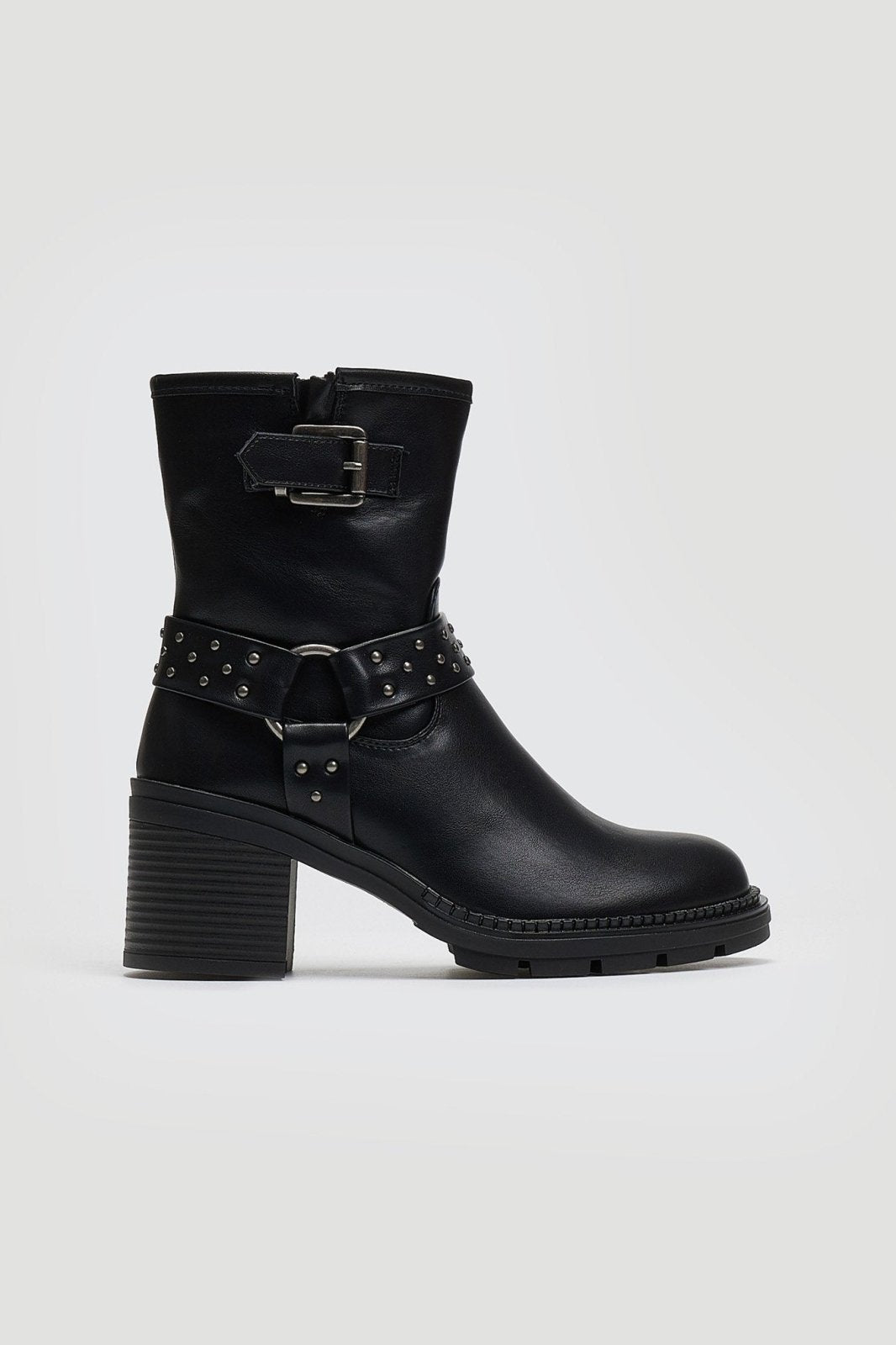 Μποτάκια biker με τακούνι. Σχέδιο με ζωνάκια και λεπτομέρειες σε ματ μεταλλικό χρώμα. Στρογγυλή γραμμή. Κλείνουν με φερμουάρ στο πλάι.