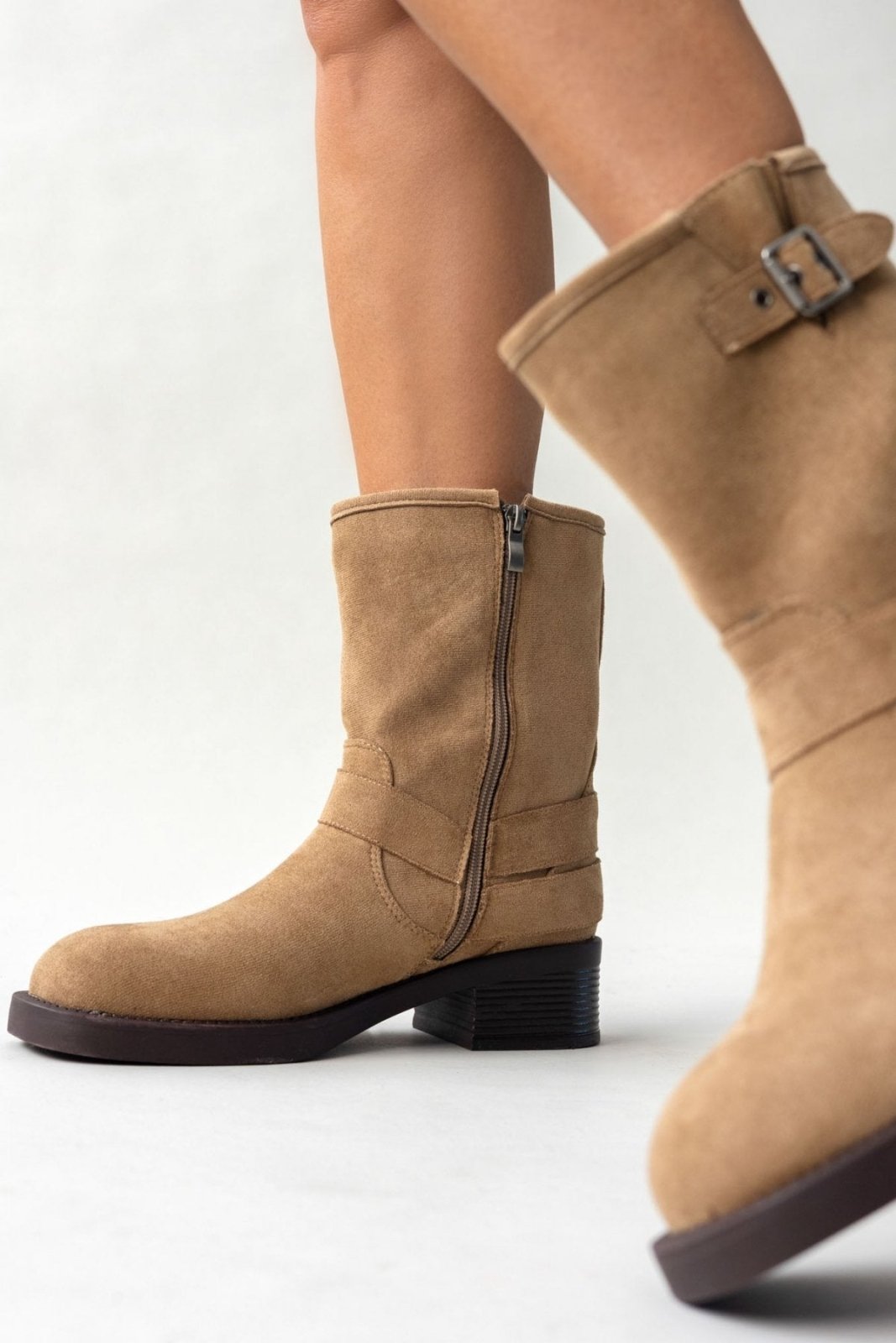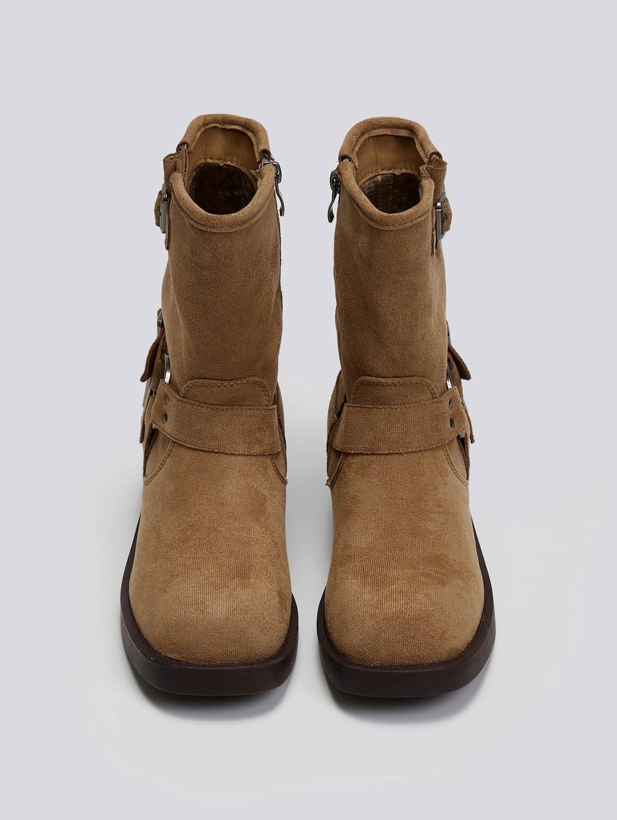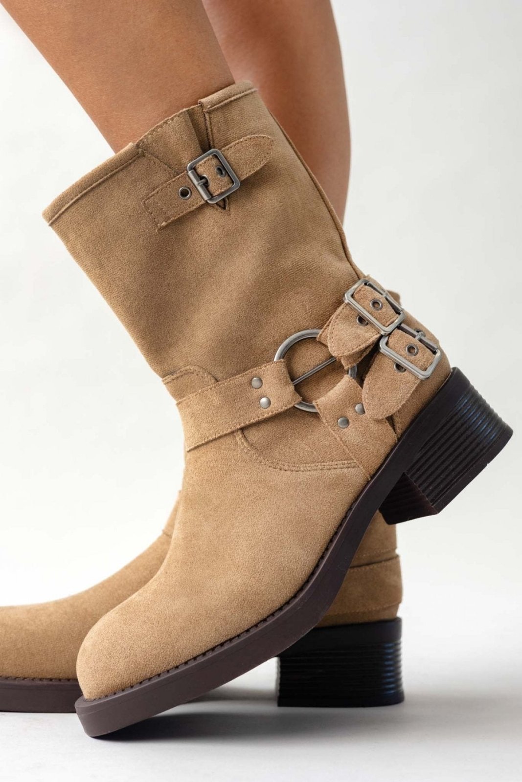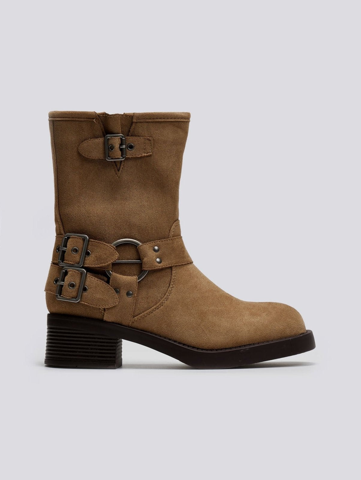 Μποτάκια biker suede με μεταλλικό κρίκο. Σχέδιο με ζωνάκια και τοκάδες στο πλάι. Κλείνουν με φερμουάρ.