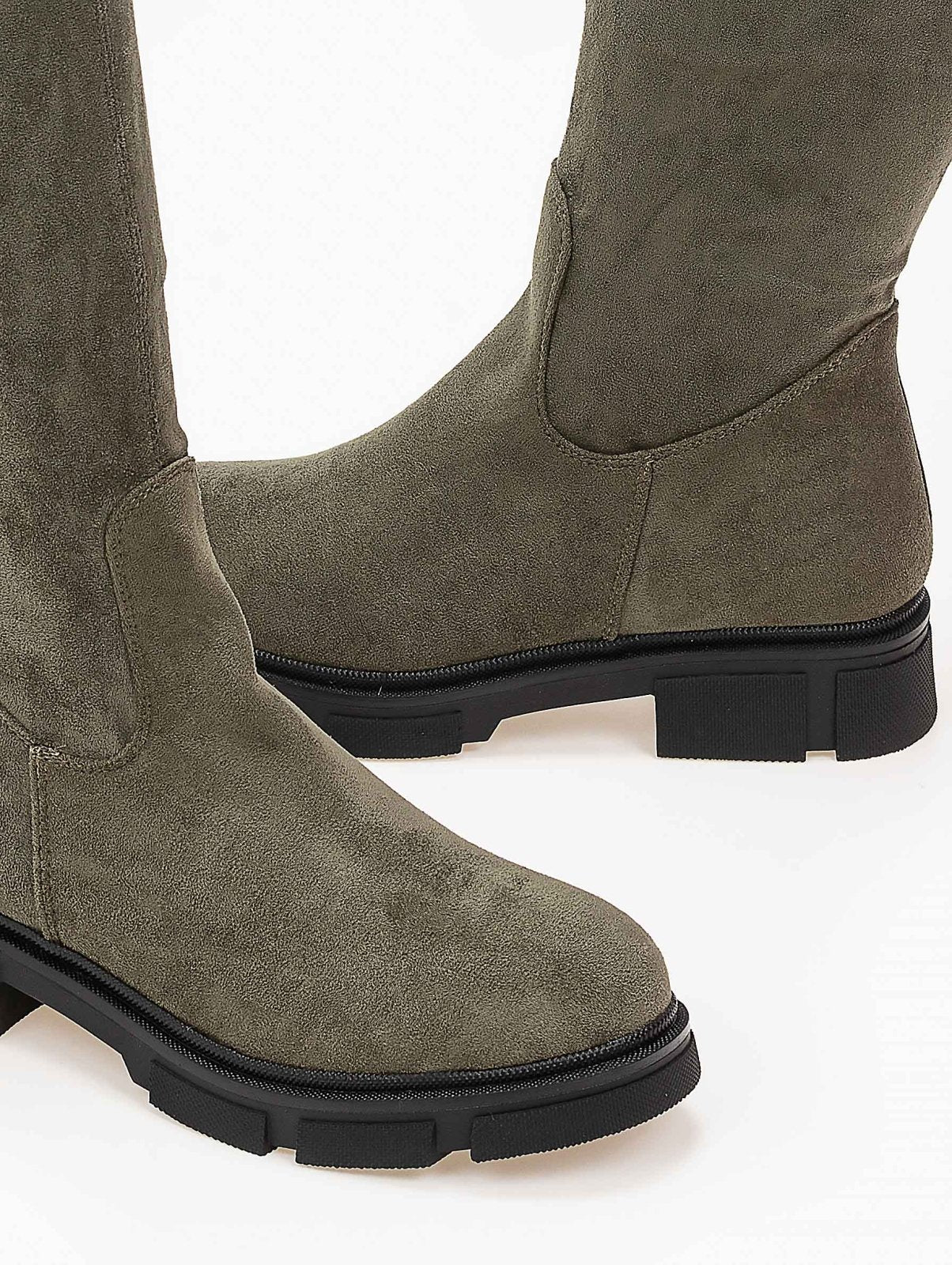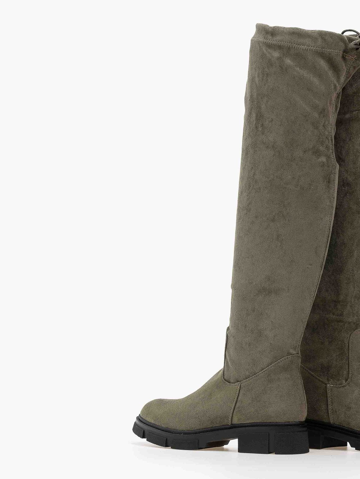 Φλατ suede μπότες πάνω από το γόνατο.Έχουν λεπτομέρεια κορδονάκι που σφίγγει στο τελείωμα.Στρογγυλή φόρμα.