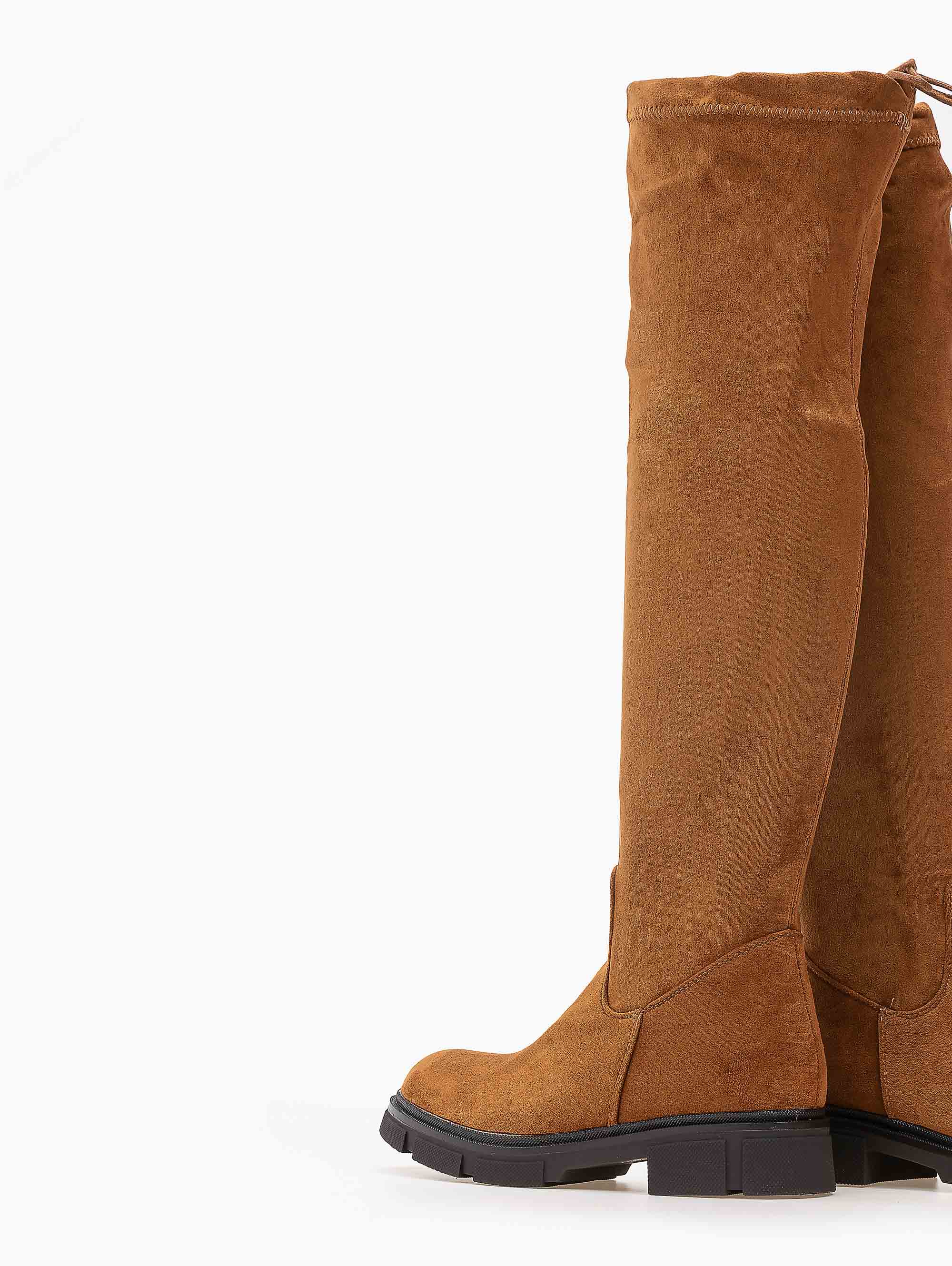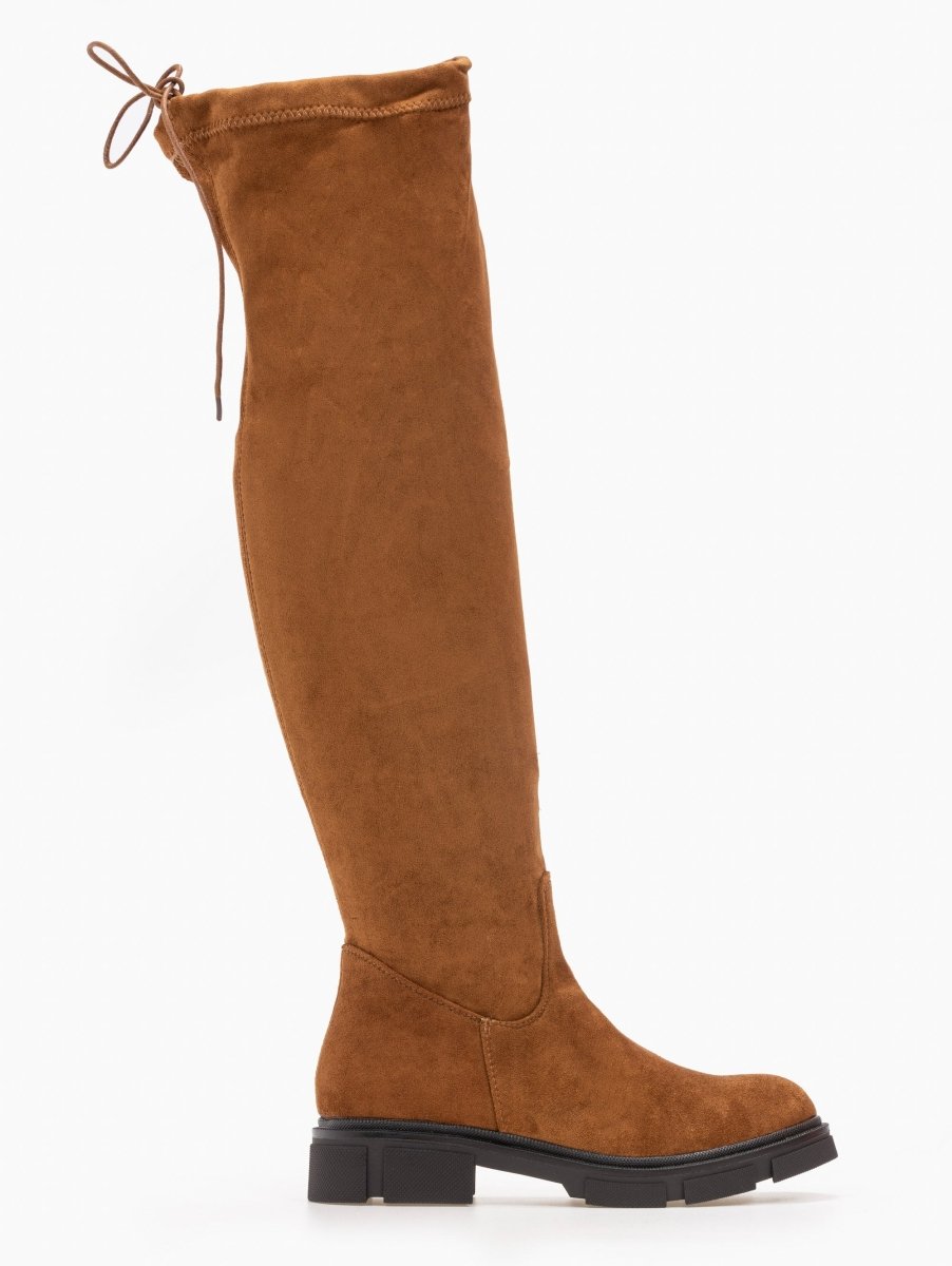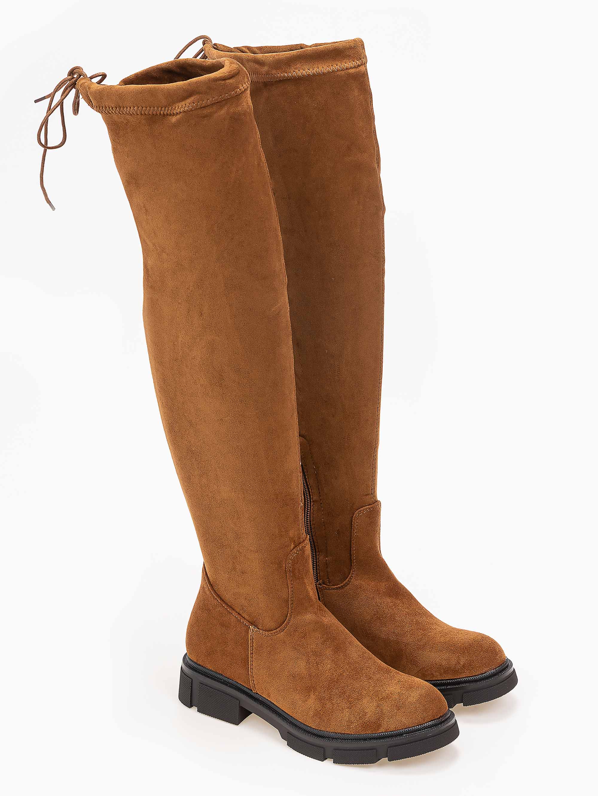 Φλατ suede μπότες πάνω από το γόνατο.Έχουν λεπτομέρεια κορδονάκι που σφίγγει στο τελείωμα.Στρογγυλή φόρμα.