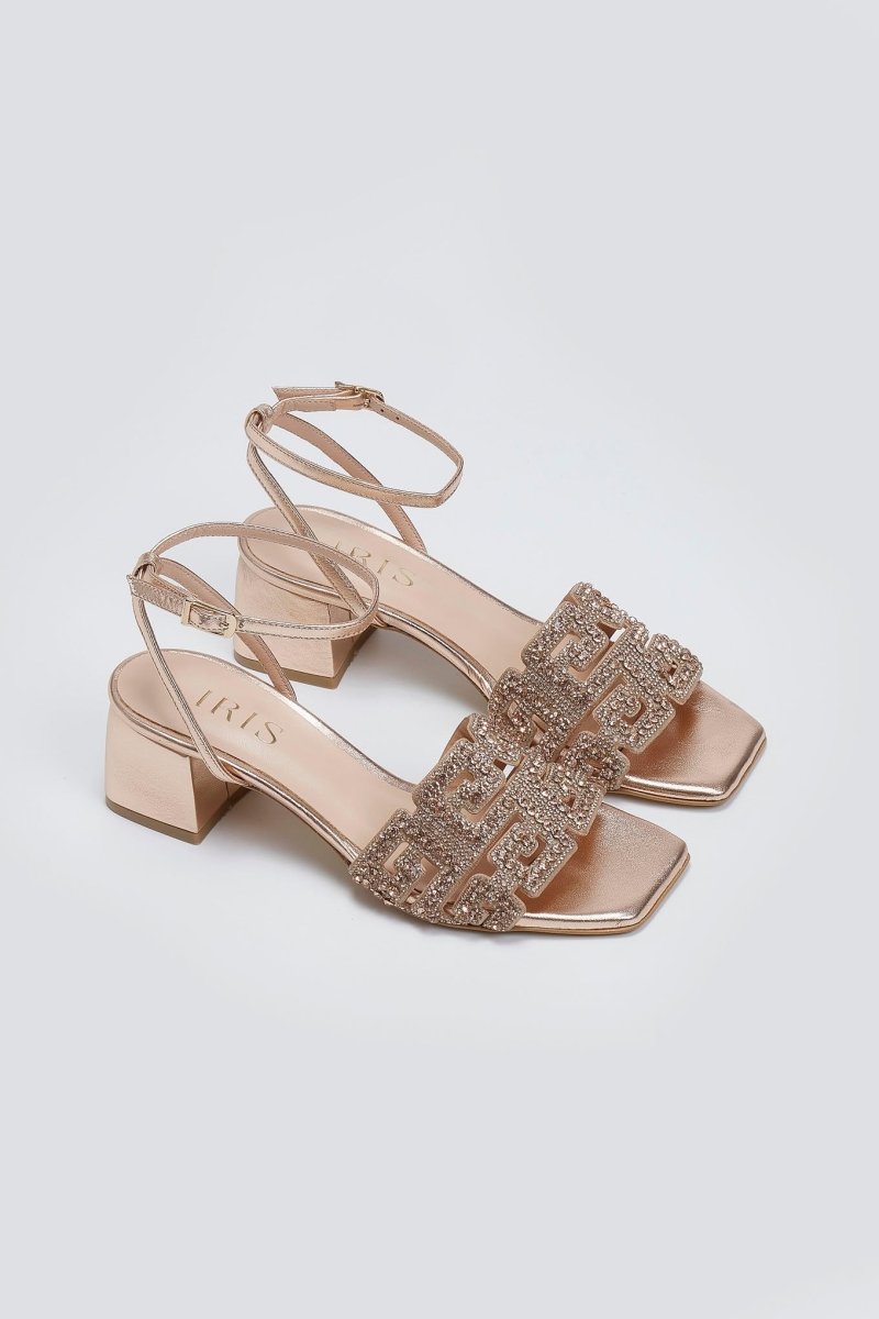 Πέδιλα με στρας φάσα Iris Sandals. Δένουν με μπαρέτα στο ύψος του αστραγάλου. Δερμάτινος πάτος. Ελληνικής κατασκευής.