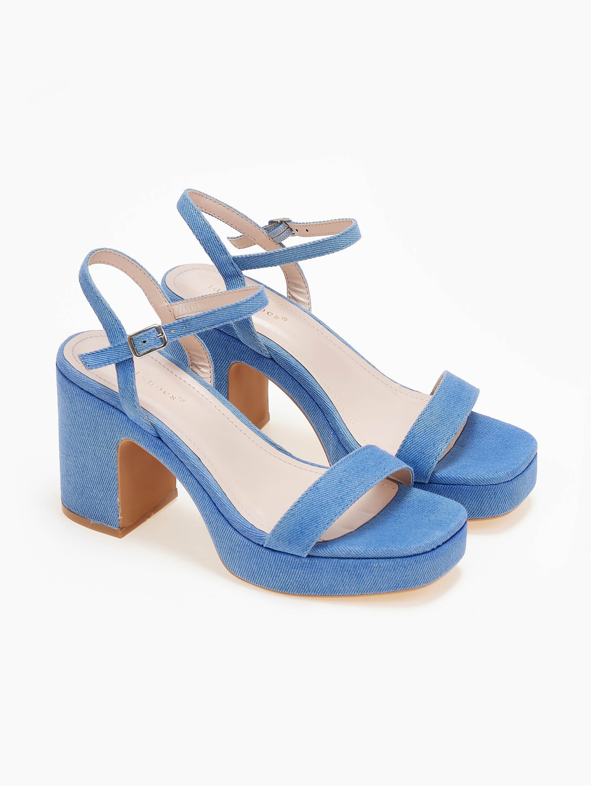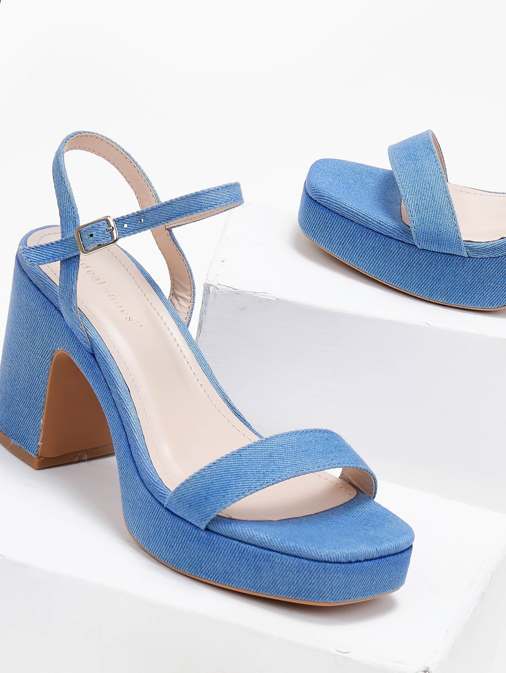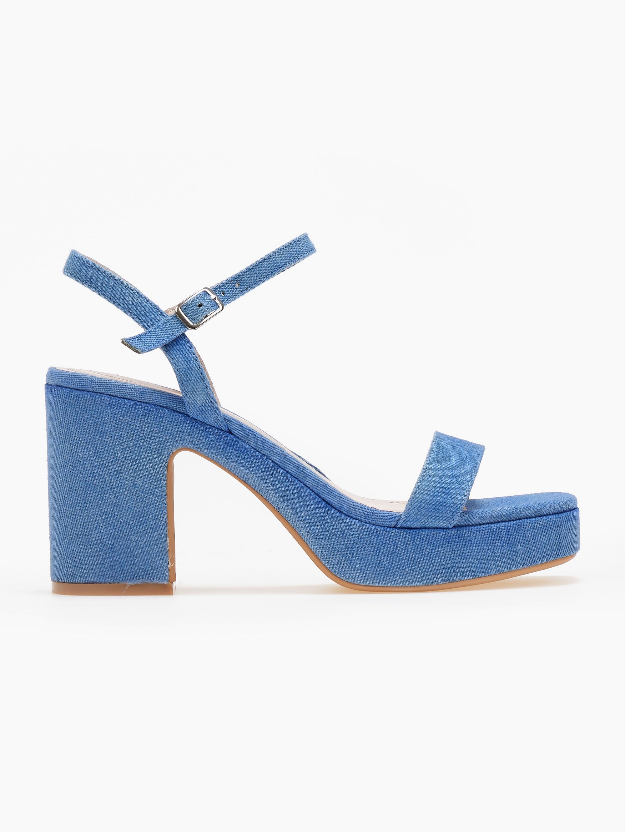Πέδιλα με ψηλό χοντρό τακούνι και φιάπα. Ντενιμ ύφασμα. Δένουν με μπαρέτα στο ύψος του αστραγάλου. Λεπτή φάσα. Καρέ γραμμή.
