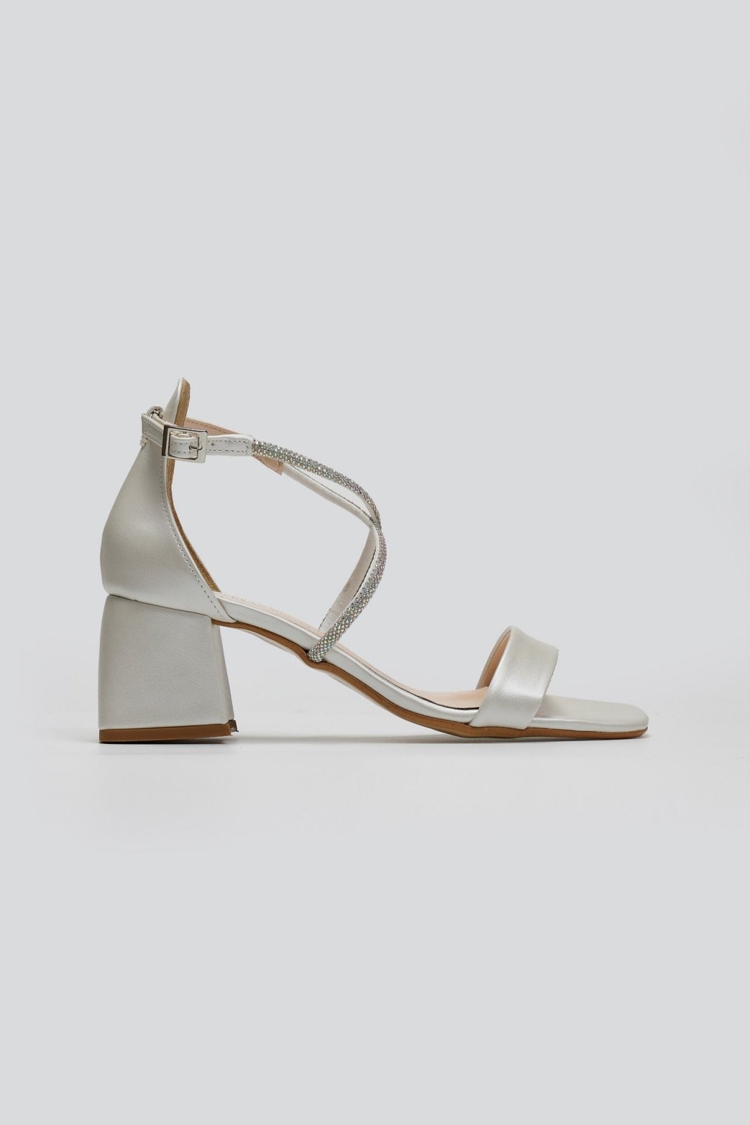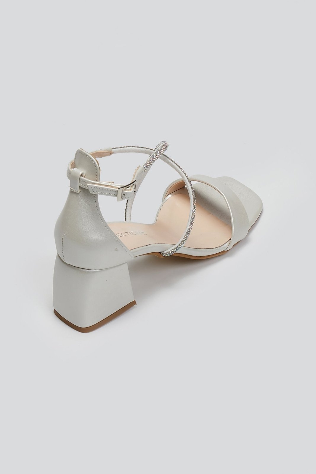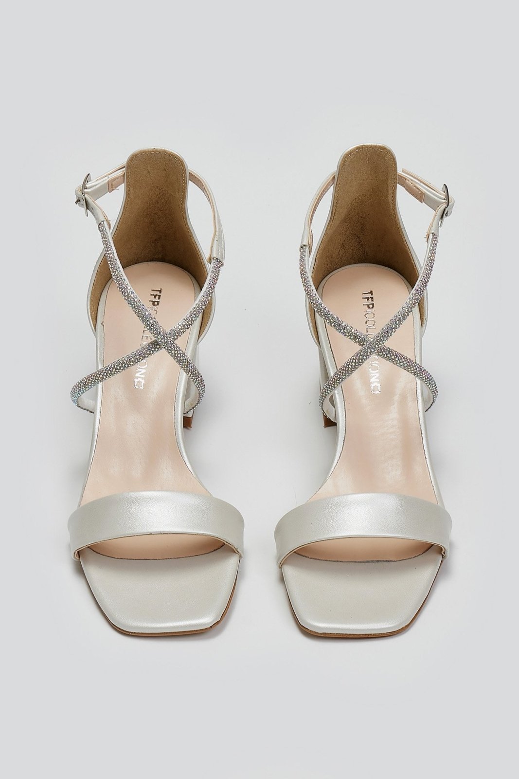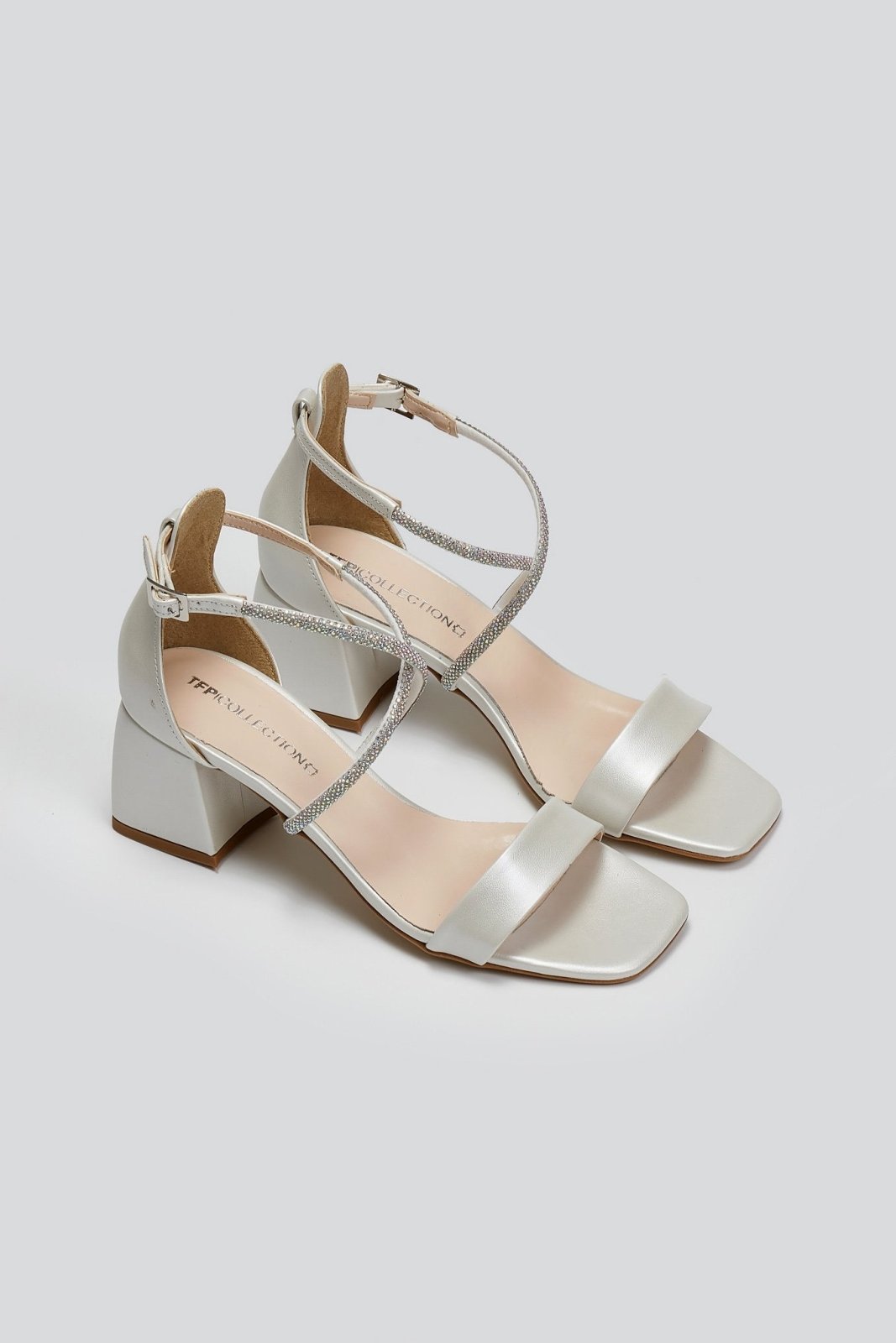 Πέδιλα με κλειστή φτέρνα TFP. Crossover στρας λουράκι στο ύψος του κουτεπιέ. Τετράγωνη γραμμή. Δένουν με μπαρέτα στο ύψος του αστραγάλου. Δερμάτινος πάτος. Ελληνικής κατασκευής.
