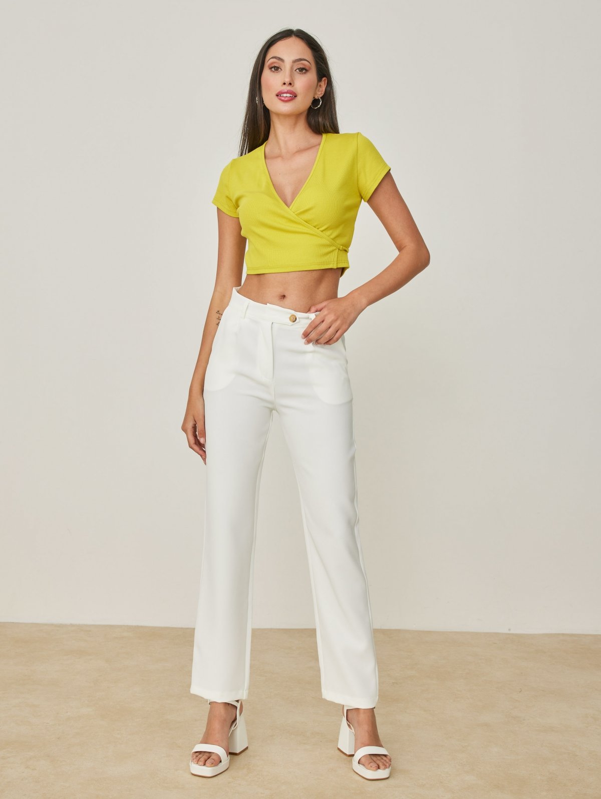 Παντελόνι υφασμάτινο σε ίσια γραμμή.Έχει πιέτες στη μπροστινή πλευρά και λοξό κούμπωμα.