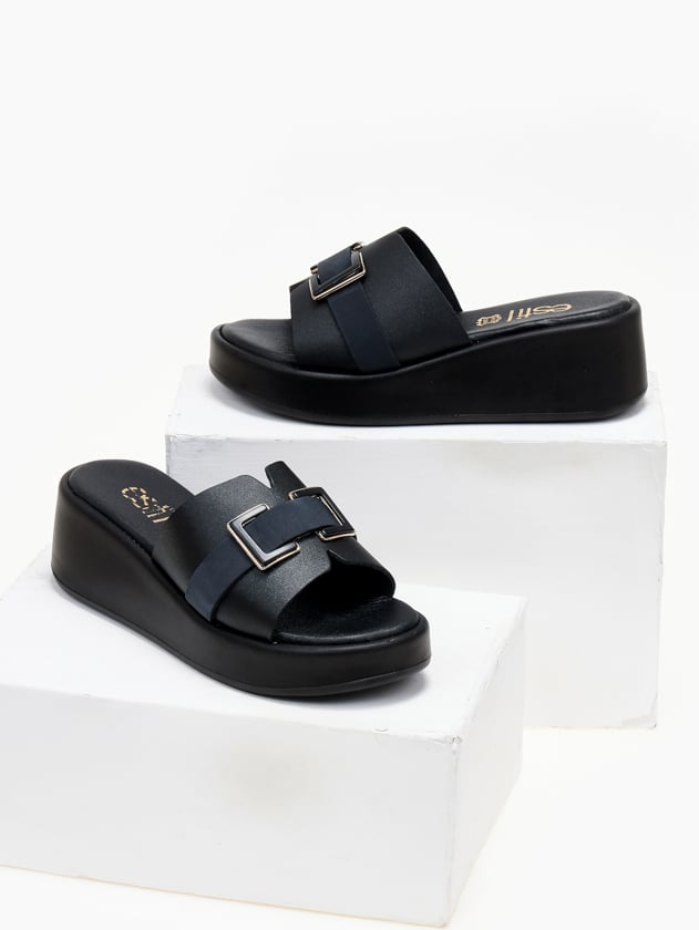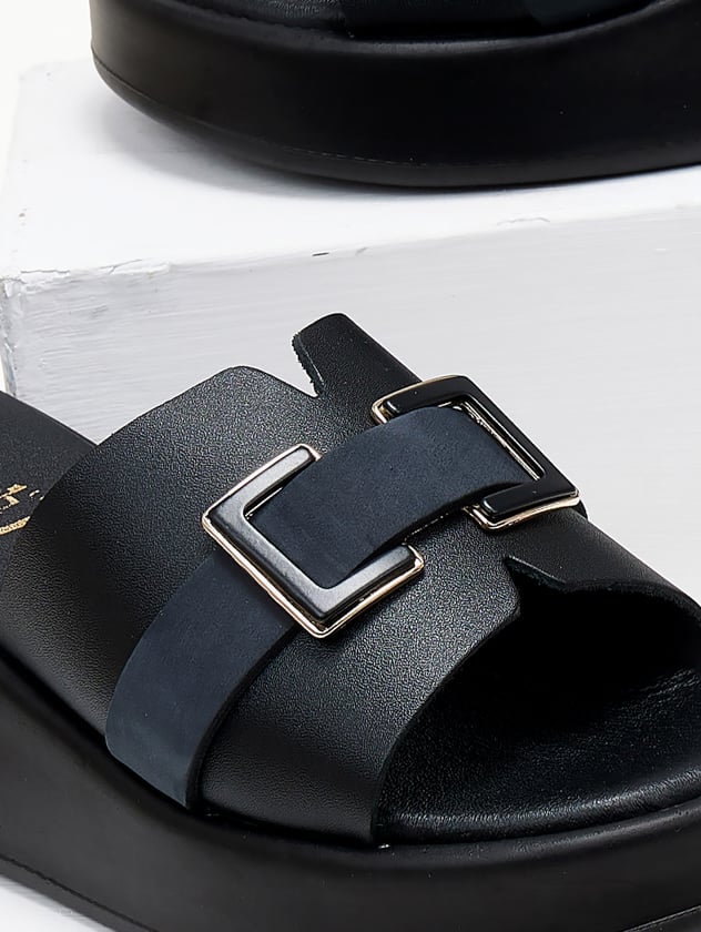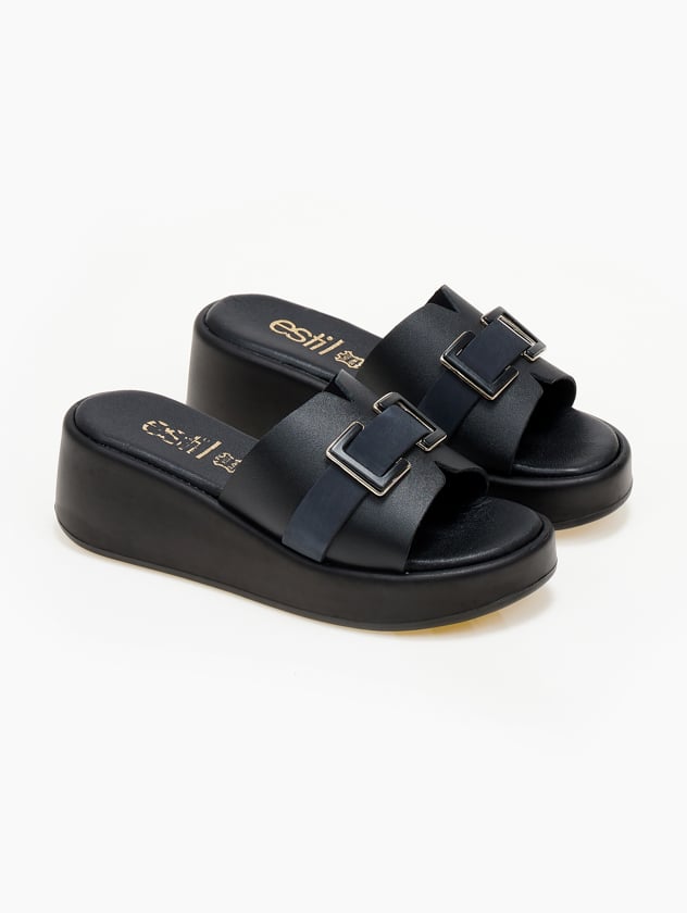 Πλατφόρμες δερμάτινες Estil. Σχέδιο με φαρδιά φάσα και ζωνάκι με μεταλλικό στοιχείο. Δερμάτινος μαλακός πάτος με ενίσχυση. Ελληνικής κατασκευής, χειροποίητα.