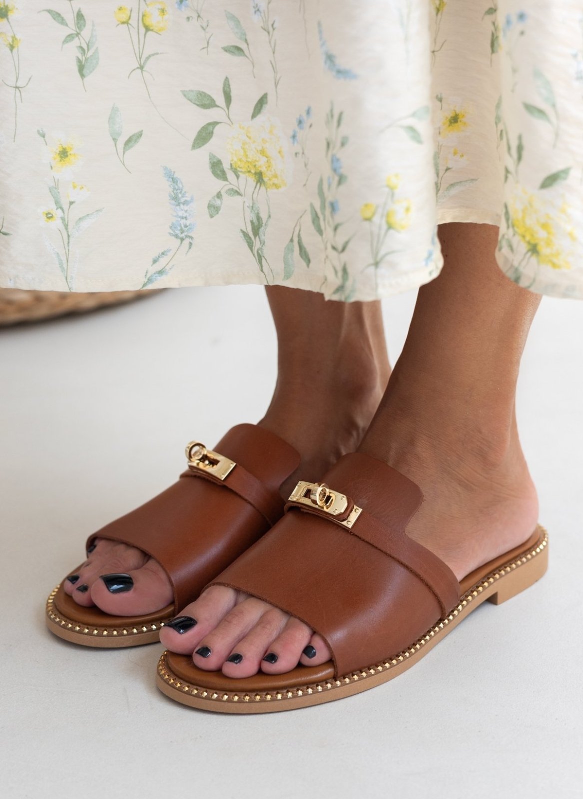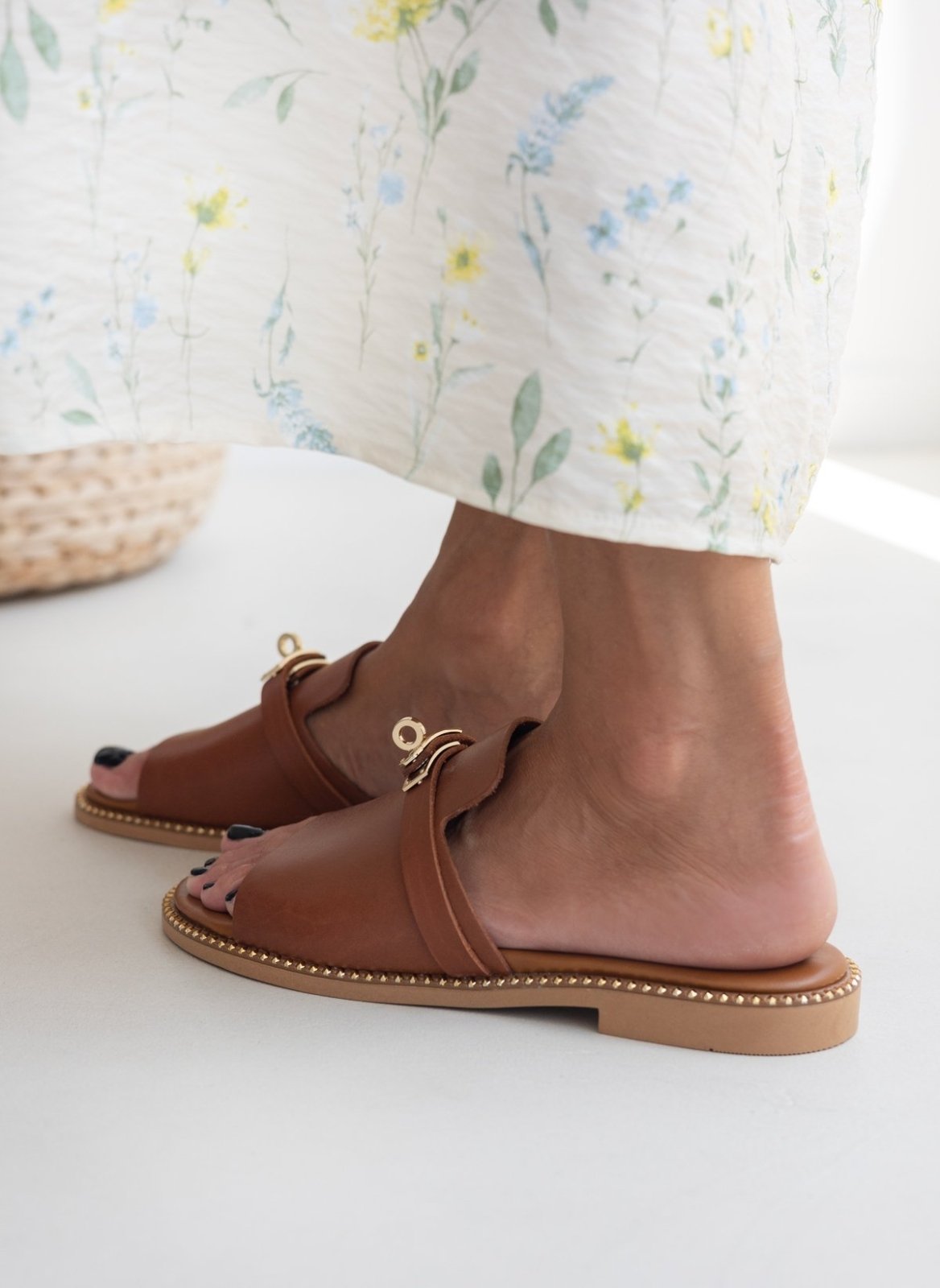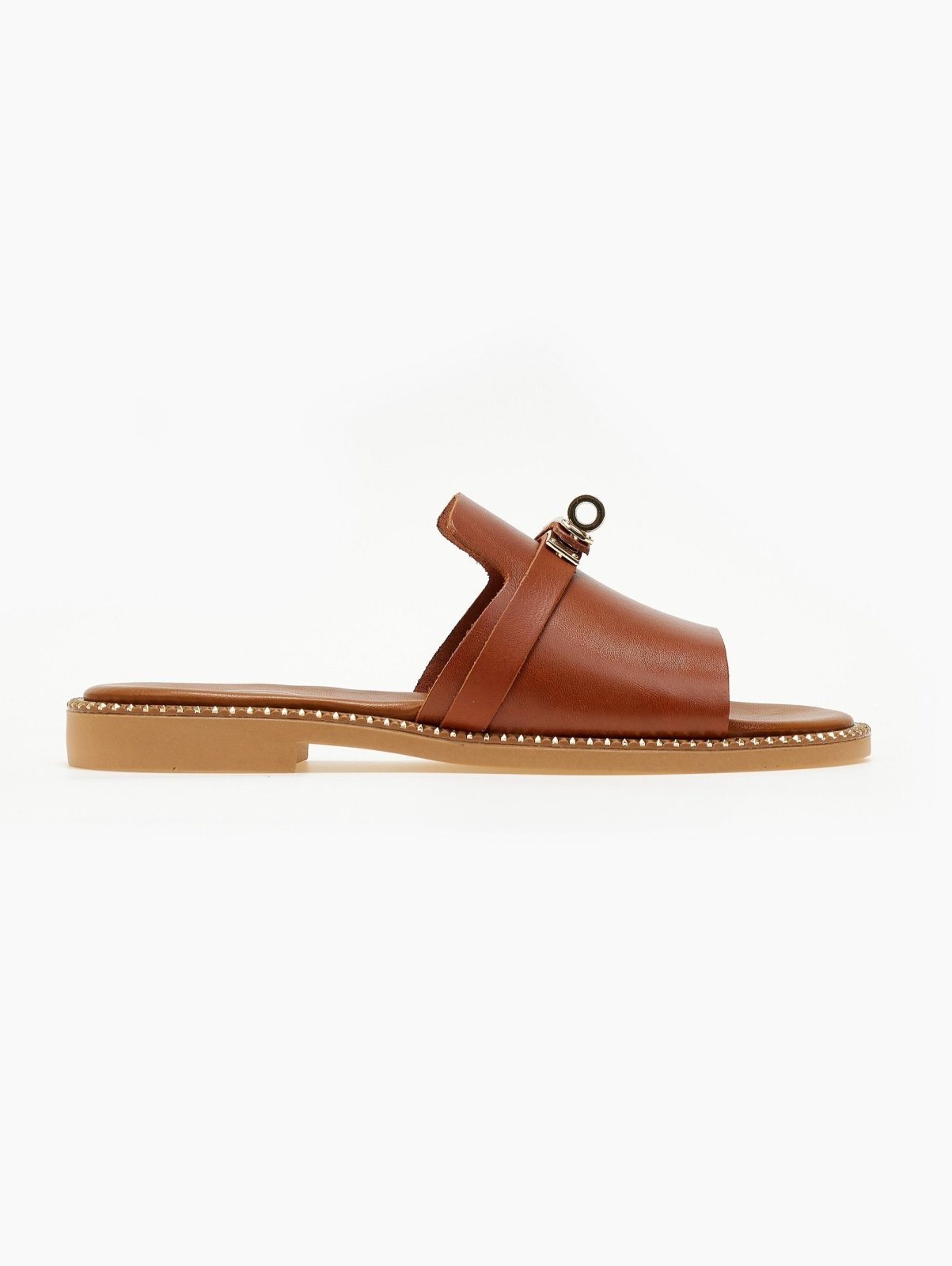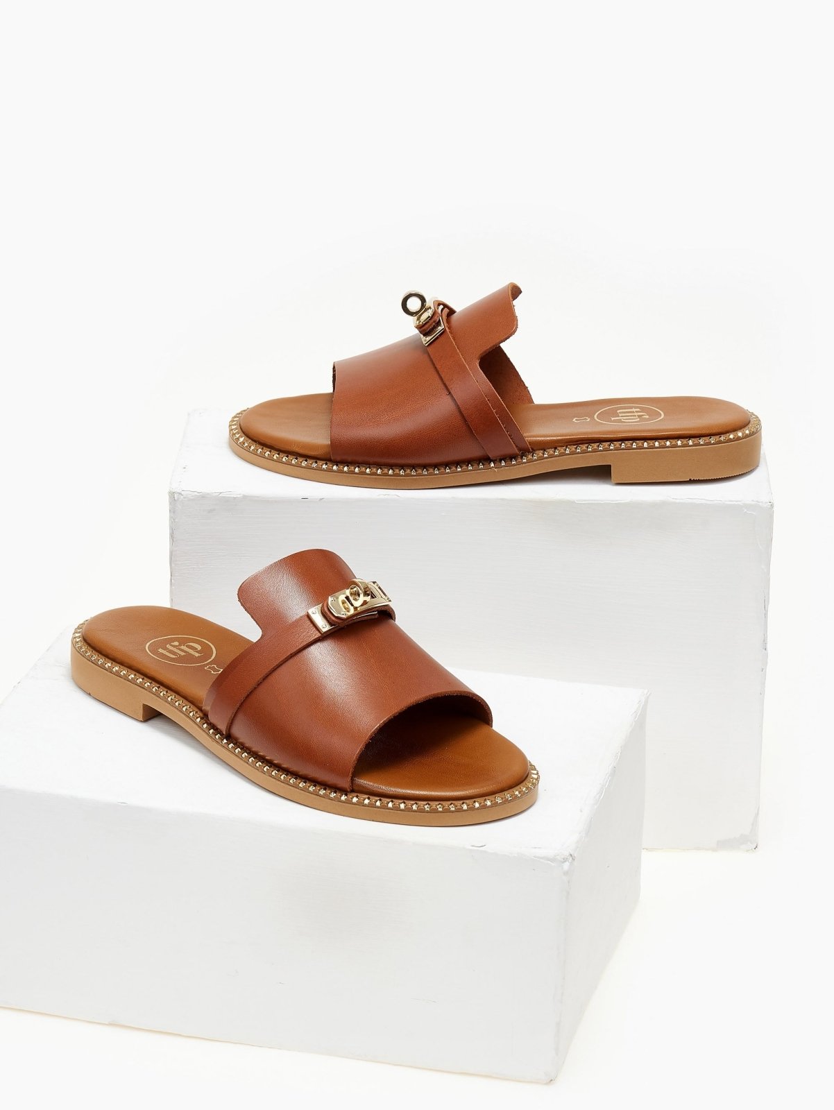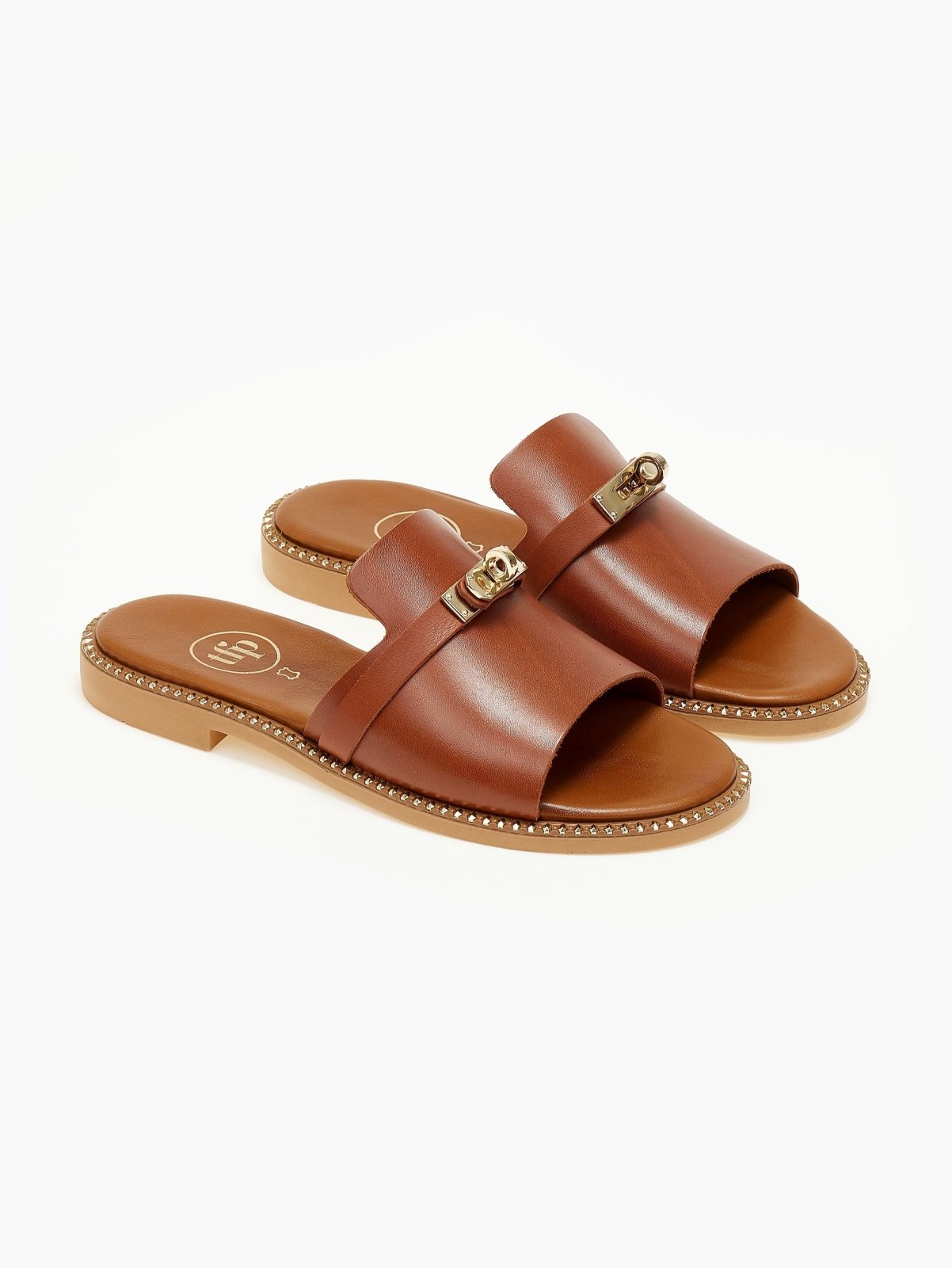 Σανδάλια δερμάτινα tfp. έχουν άνιση φάσα. Μεταλλικό διακοσμητικό στο πάνω μέρος. Τρουκς περιμετρικά της σόλας. Μαλακός πάτος. Ελληνικής κατασκευής.