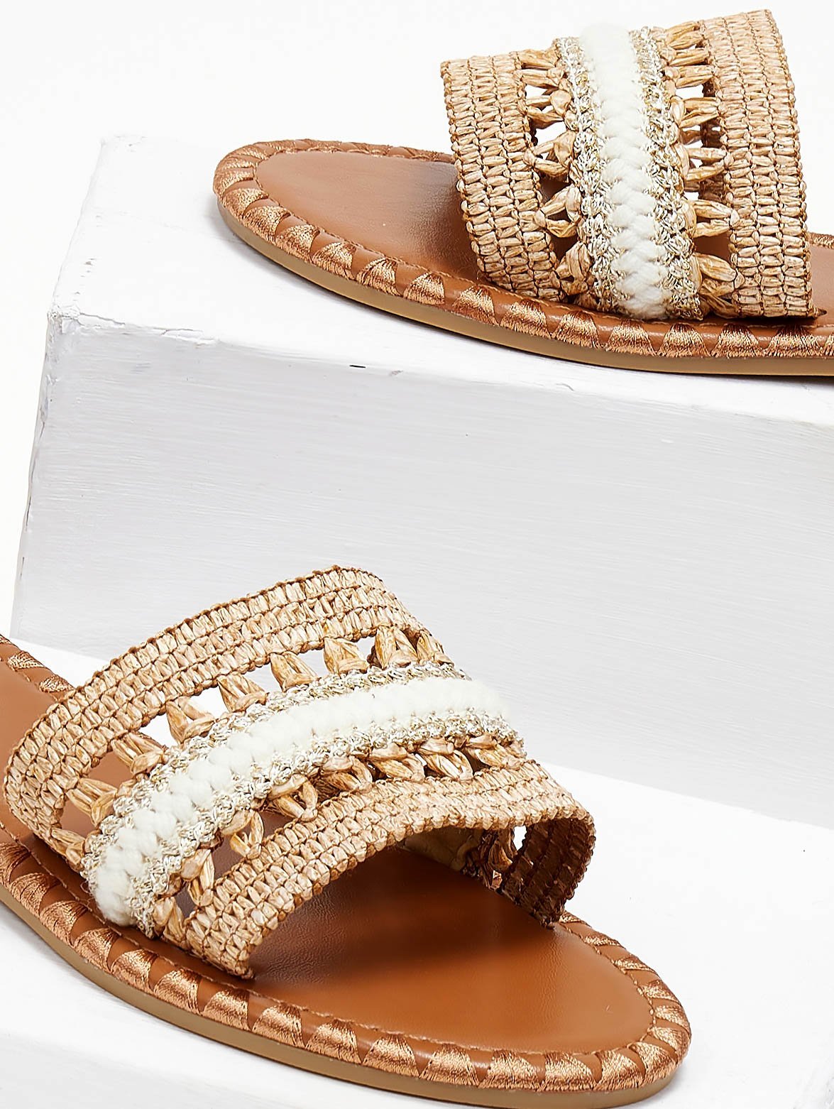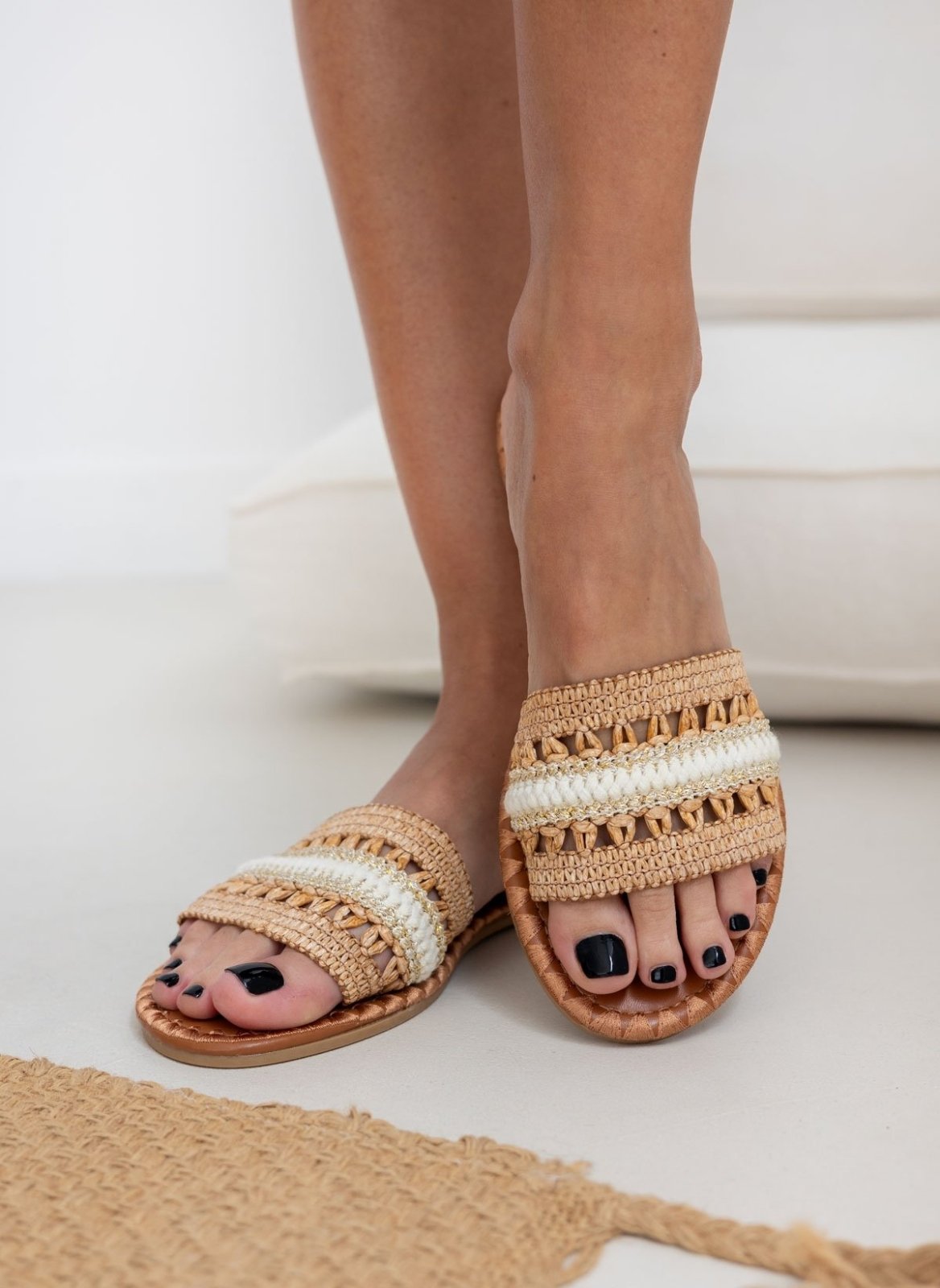 Σανδάλια φλατ ERYNN. Έχει διάτρητη ψάθινη φάσα με πλεκτό σχέδιο. Σόλα μαλακή με λάστιχο. Σχέδιο με κλωστή περιμετρικά της σόλας.