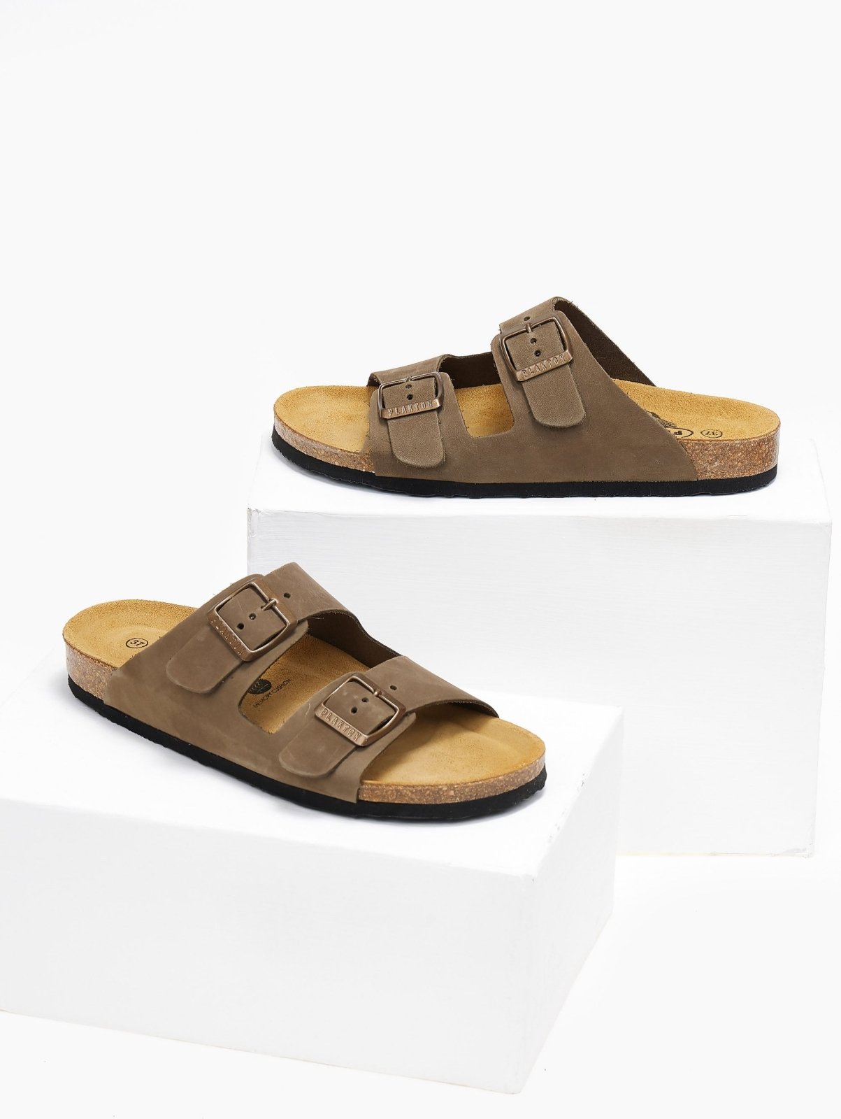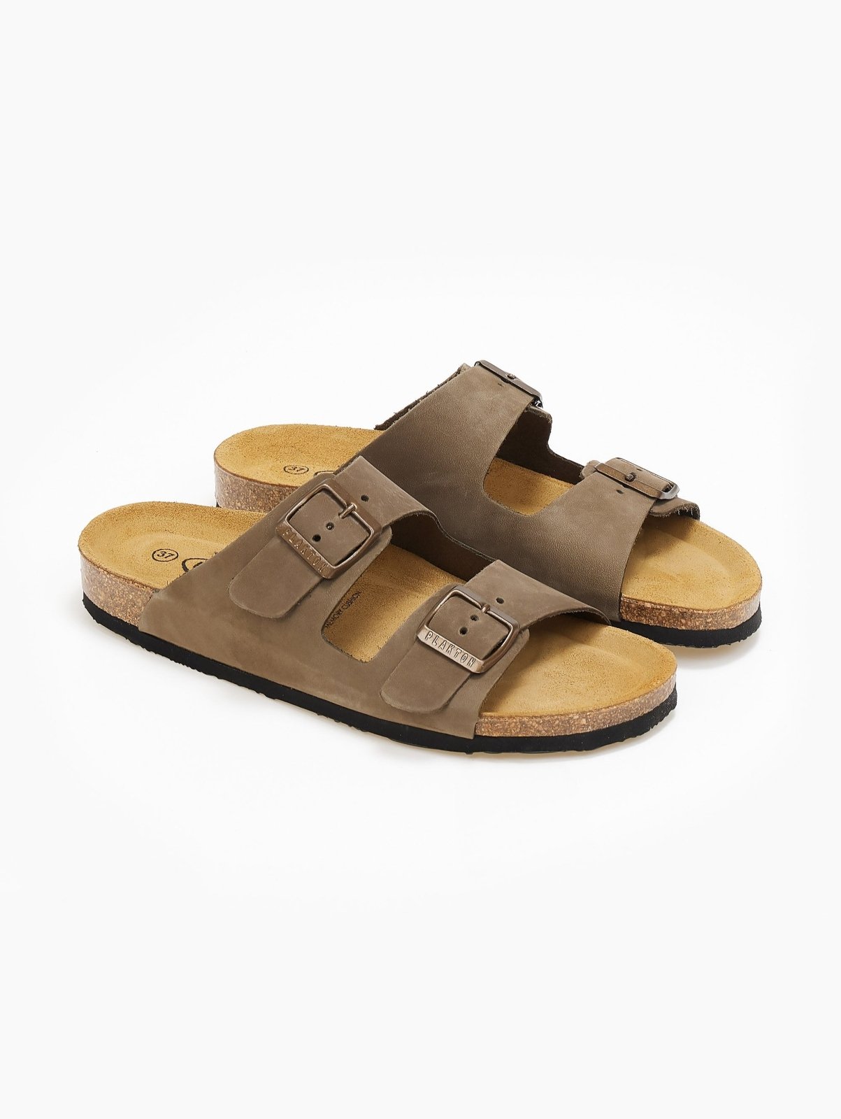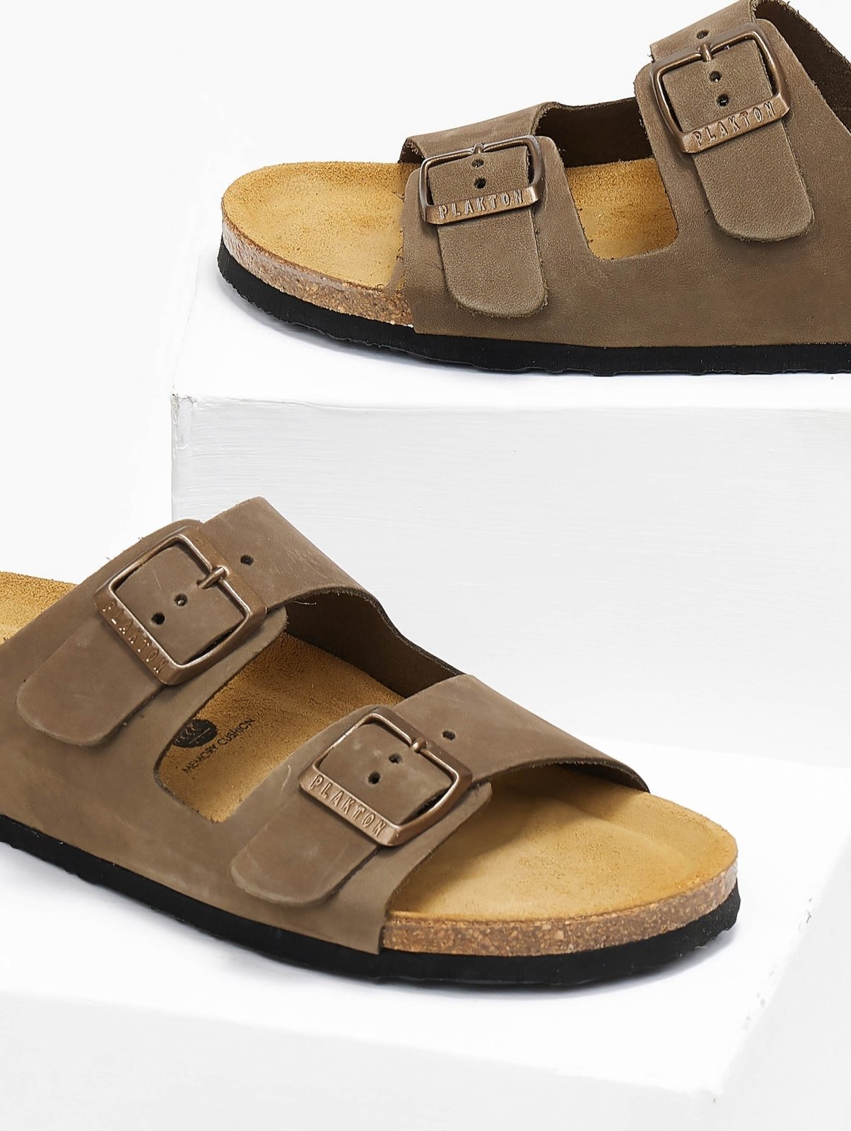 Σανδάλια από δέρμα Plakton. δύο φάσες με μεταλλικούς τοκάδες. Ο πάτος είναι καστόρινος με Memory Cushion Technology και φυσικό φελλό. Κατασκευάζεται στην Ισπανία.