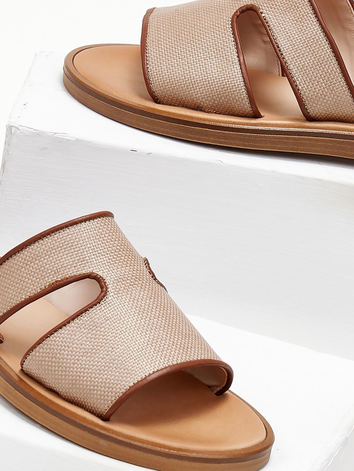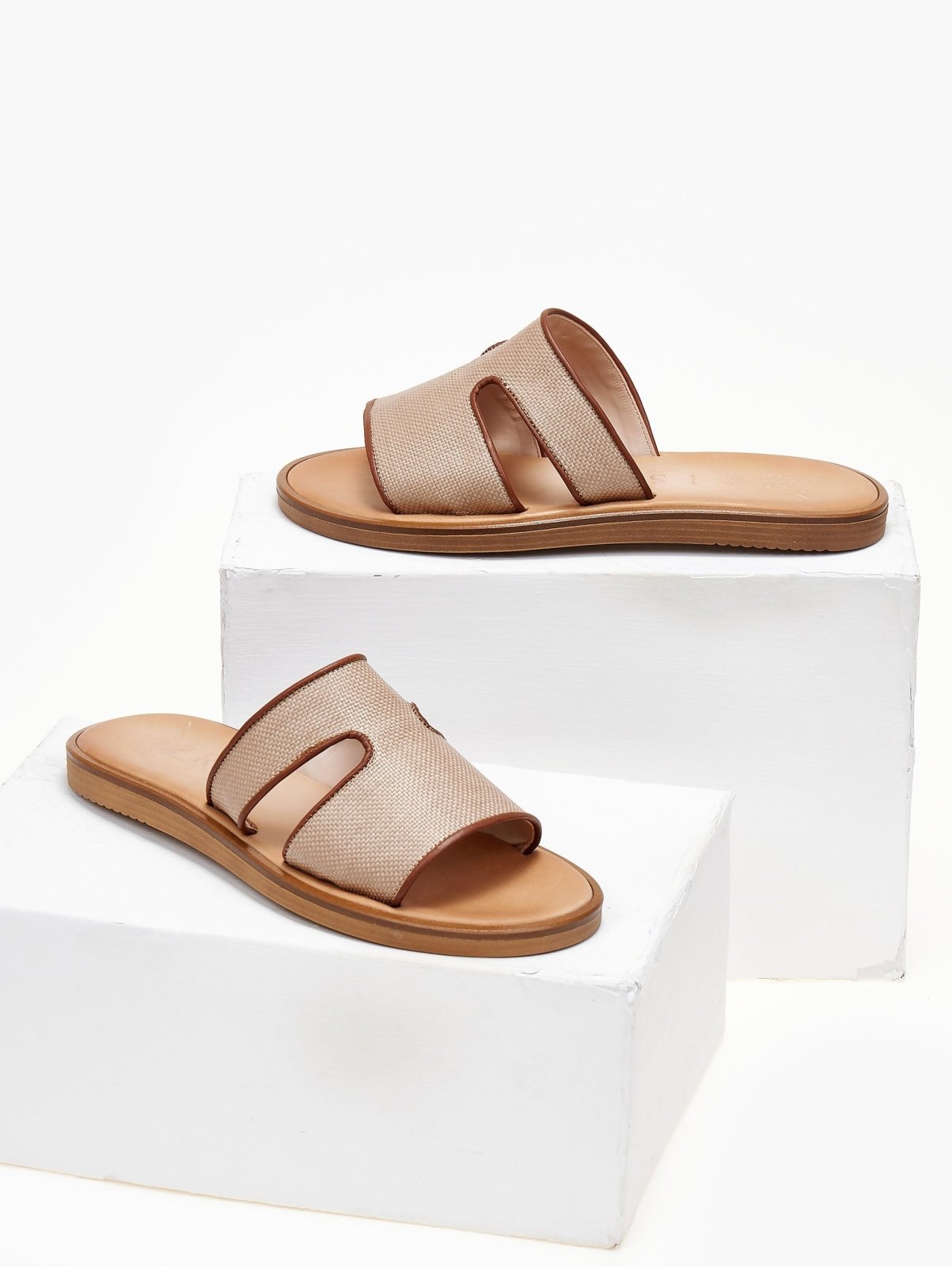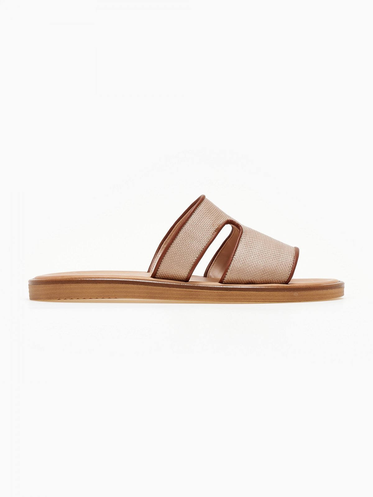 Δερμάτινα σανδάλια φλατ. Φαρδιά φάσα με ανοίγματα. Εφέ ψάθας στο πάνω μέρος. Ο πάτος είναι δερμάτινος με ενίσχυση. Στρογγυλή γραμμή. Ελληνικής κατασκευής, χειροποίητα.