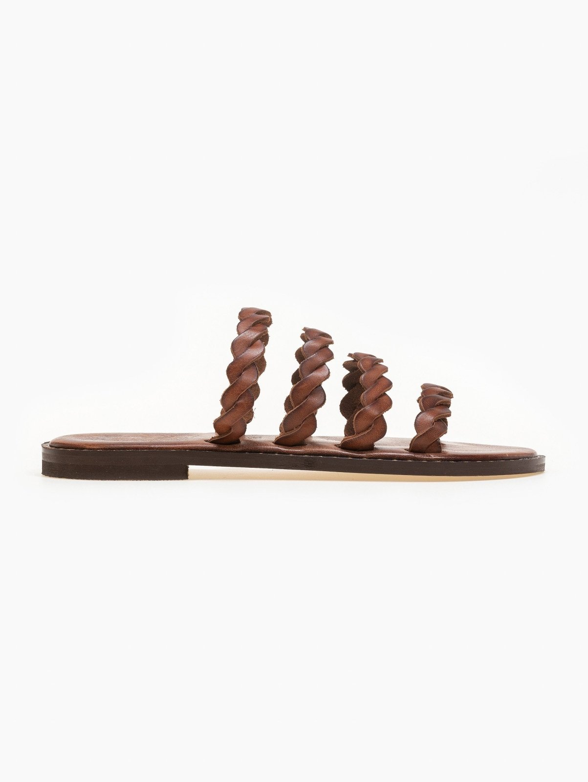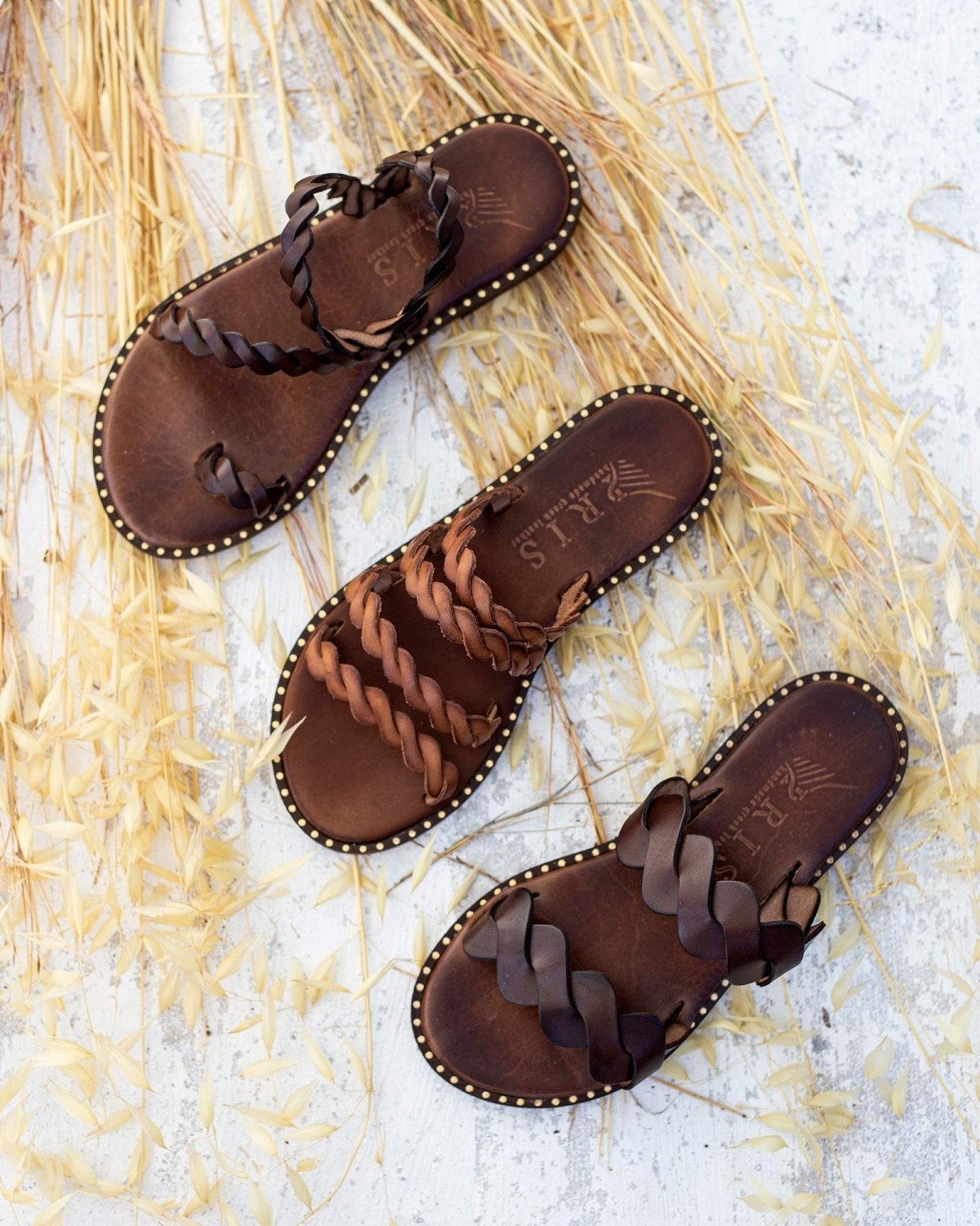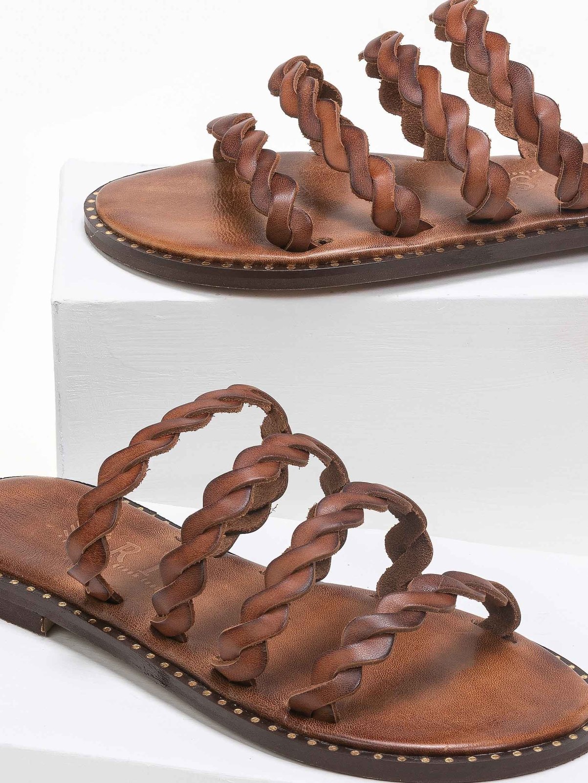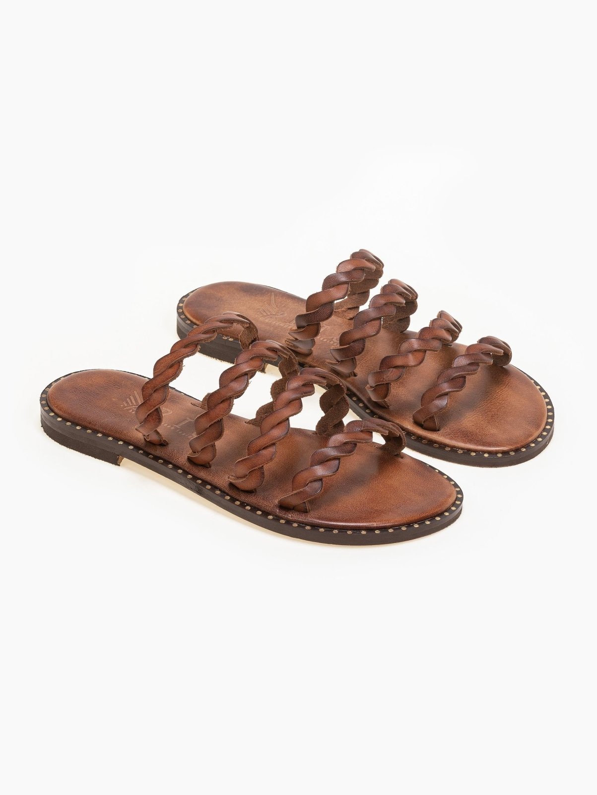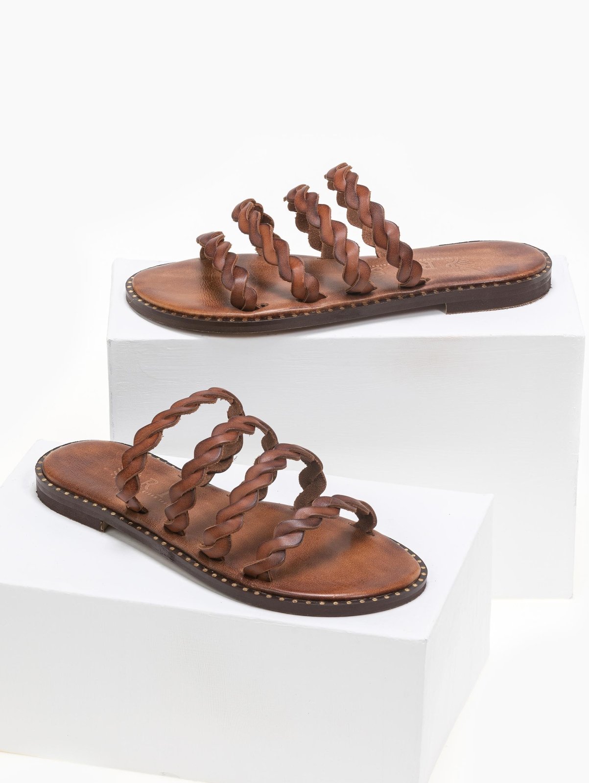 Δερμάτινα φλατ σανδάλια με πλεγμένα λουράκια. Ο πάτος είναι δερμάτινος με ενίσχυση. λεπτομέρεια μεταλλικό χρώμα περιμετρικά της σόλας. Ελληνικής κατασκευής, χειροποίητα.